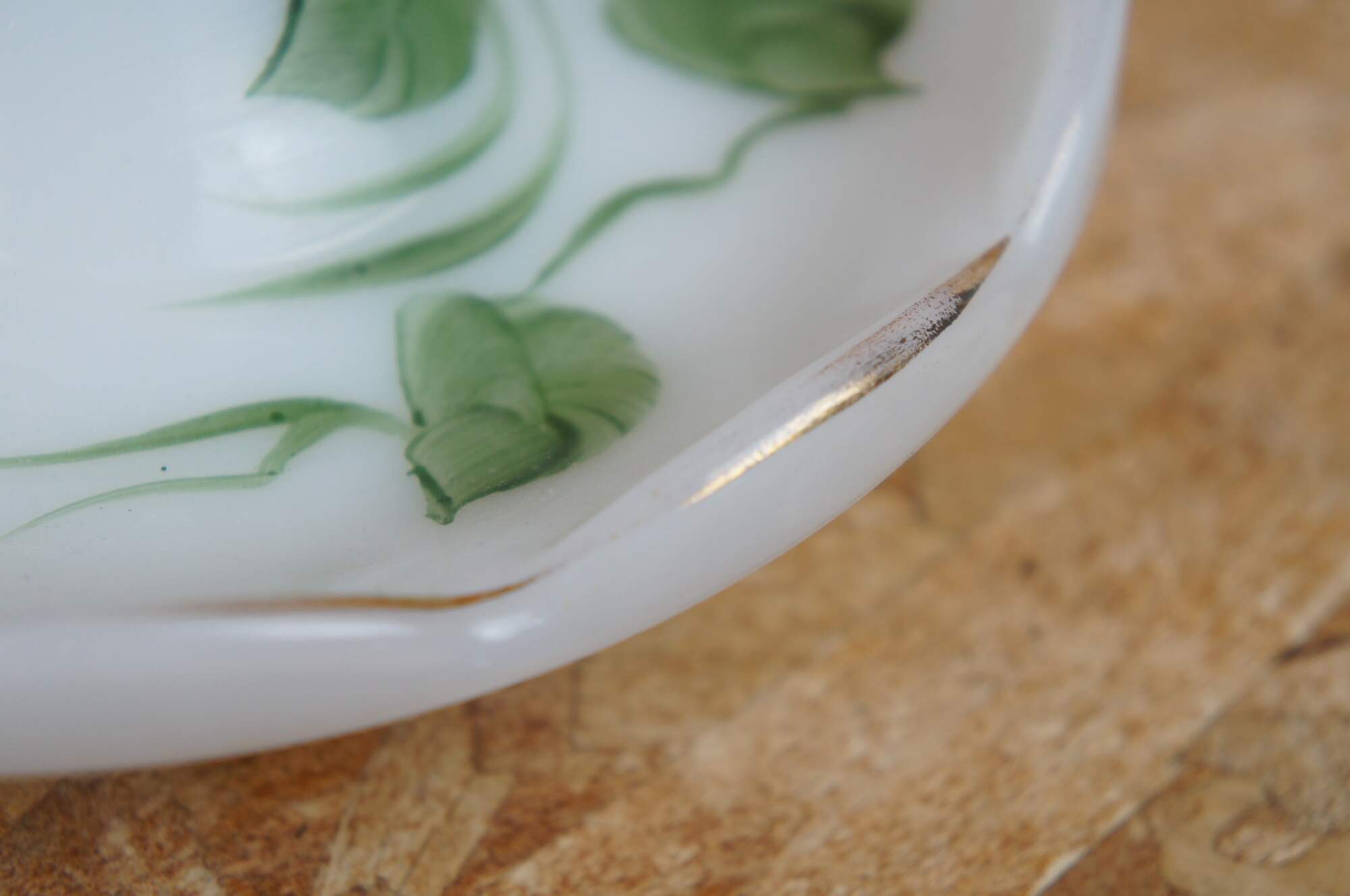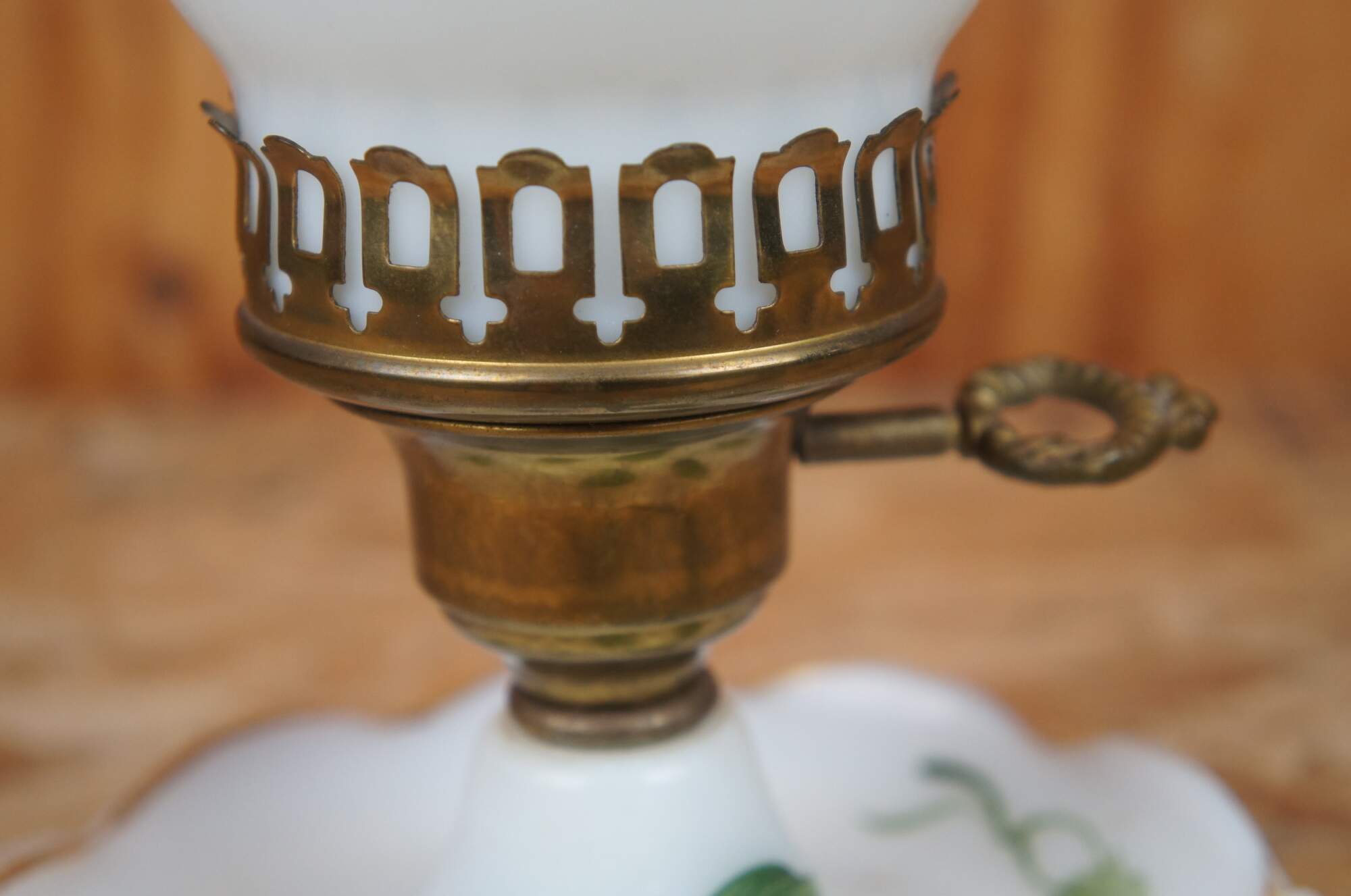 Two vintage mid century hand painted brass and white milk glass desk / library / vanity lamps featuring chamber candlestick style base and hurricane shades with green ivy and vines.
