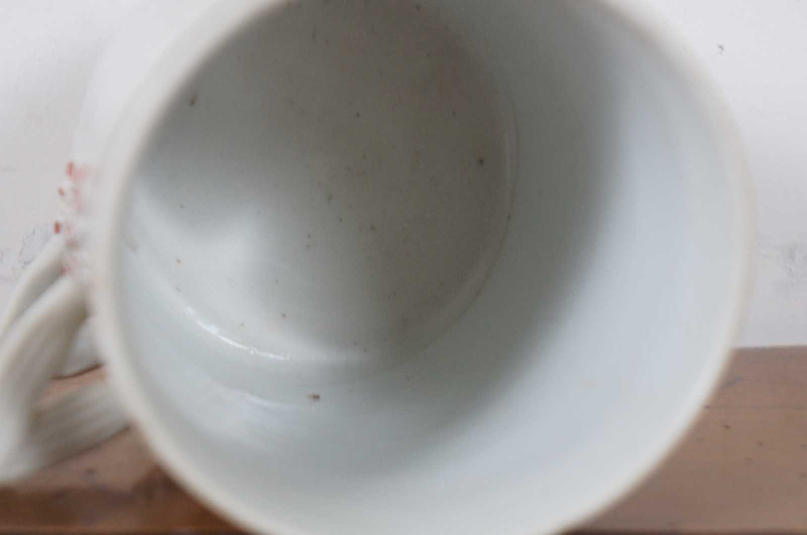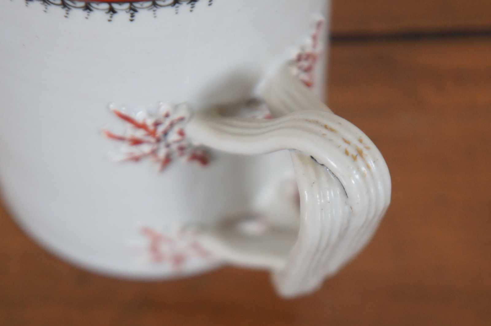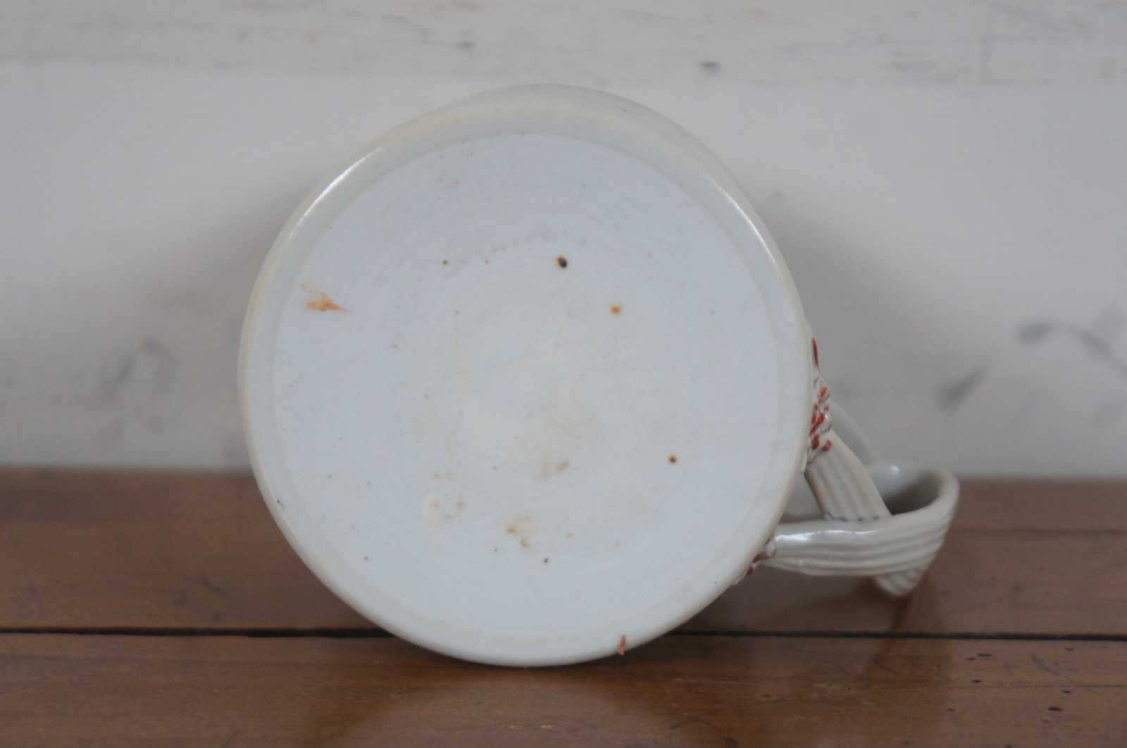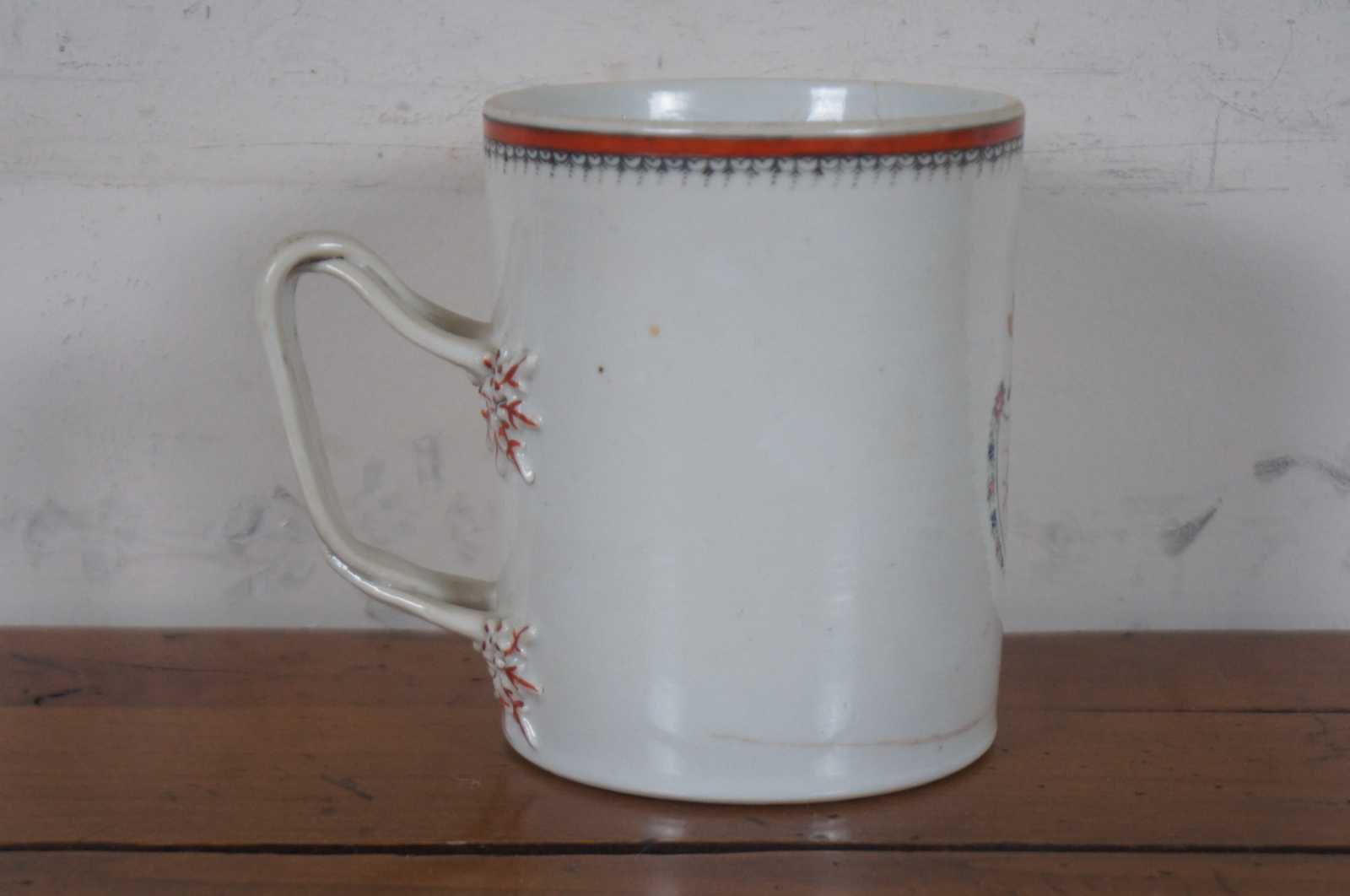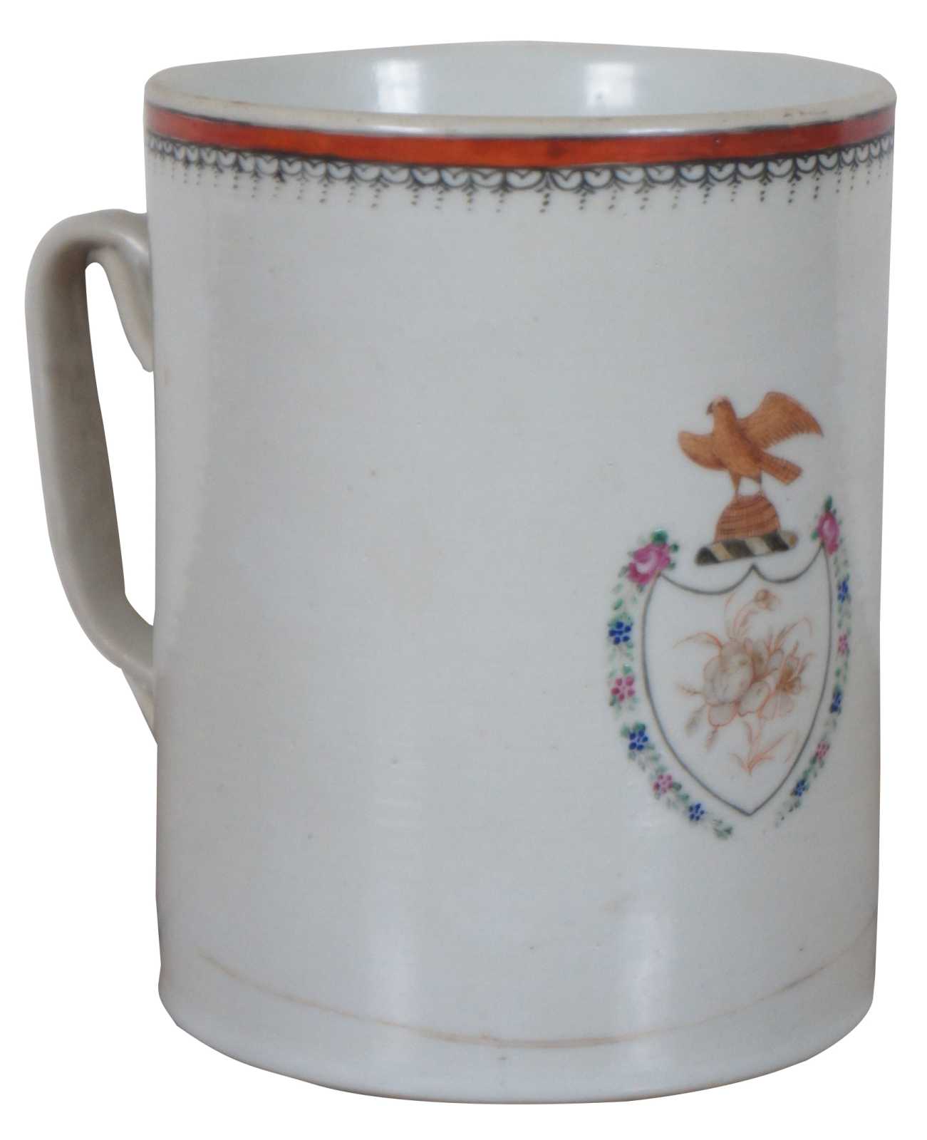 Antique late 18th century (Qianlong Period, circa 1780) Chinese Export porcelain tankard with floral and armorial coat of arms / crest with bird / hawk / eagle.