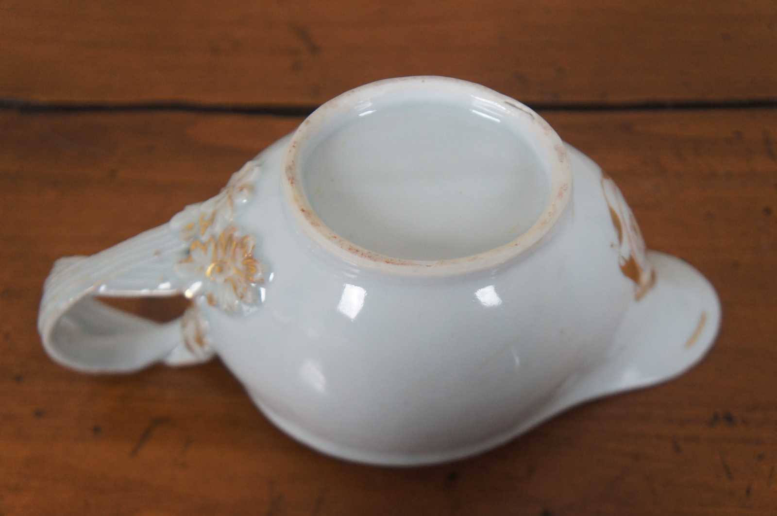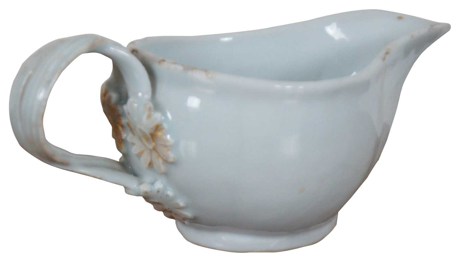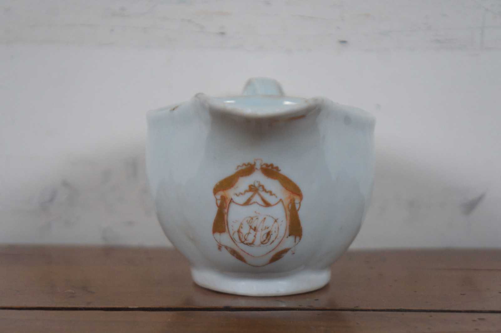 Antique 18th century Chinese Export (Qianlong Period, circa 1780) porcelain gravy boat or creamer with gilded accents and armorial coat of arms, finished in a pale blue tinted glaze.