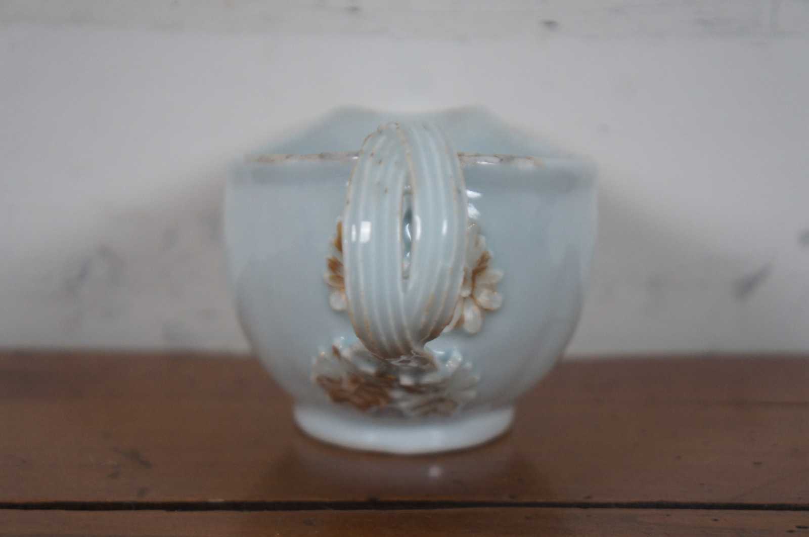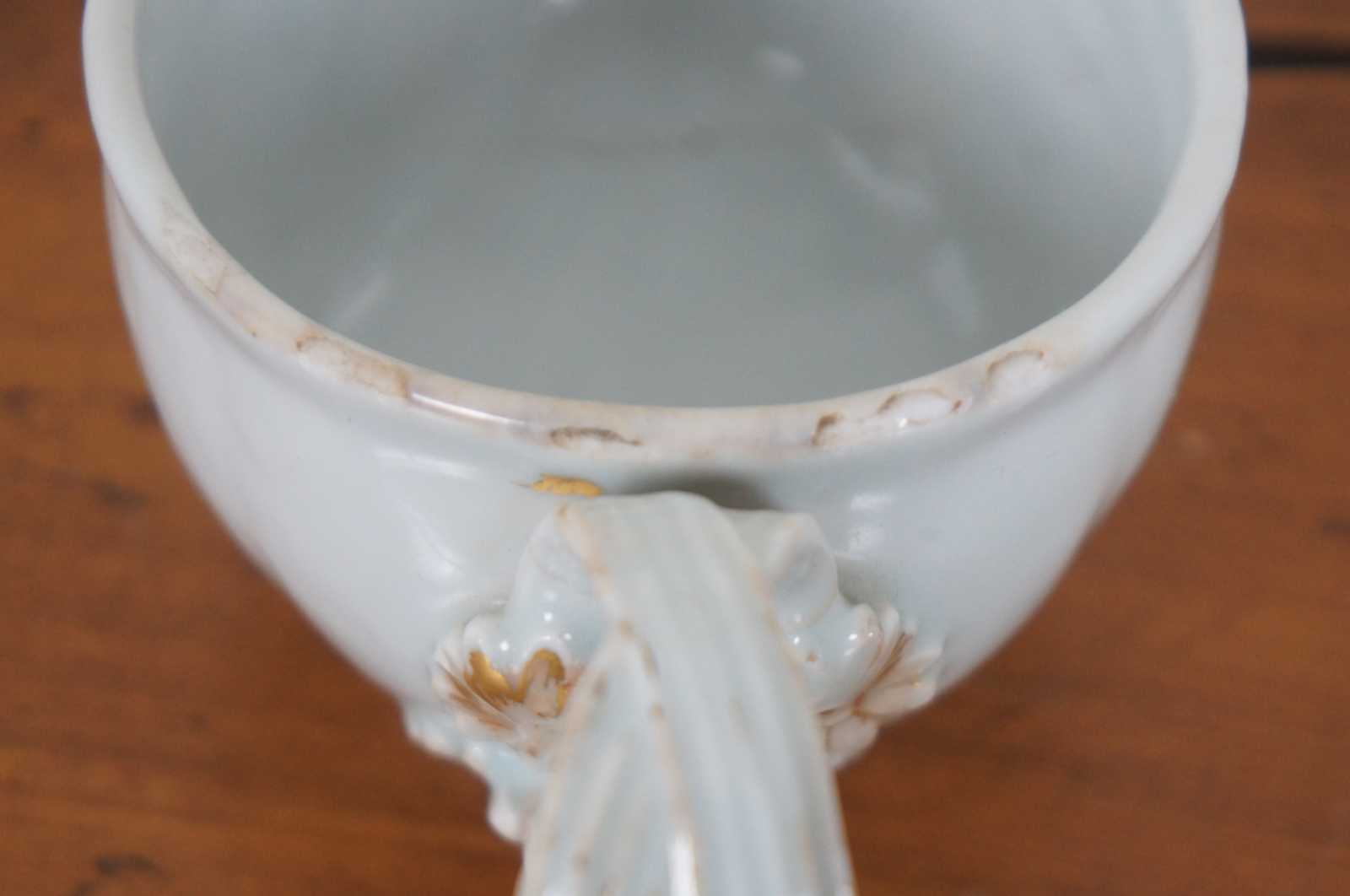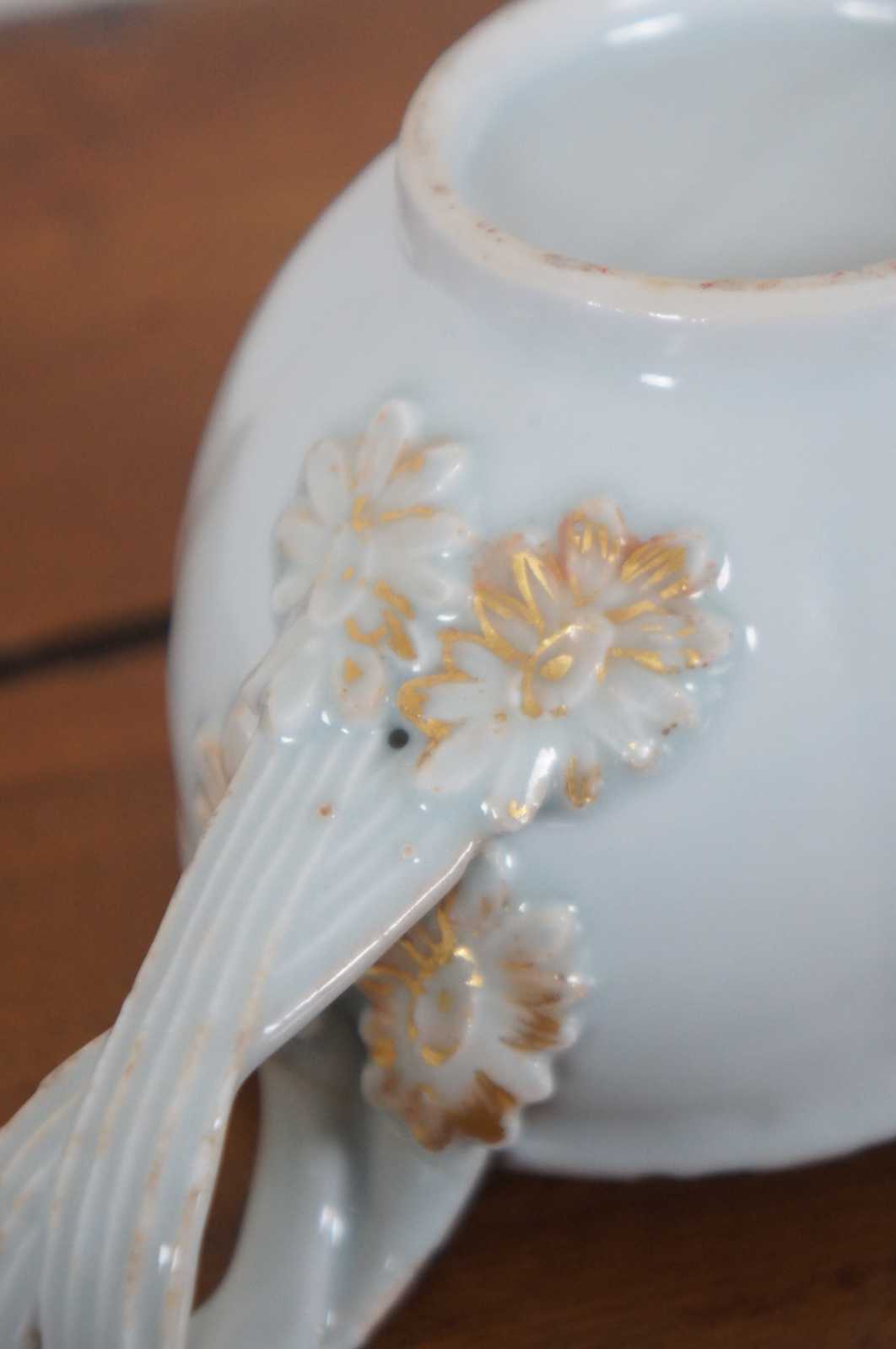 Antique 18th century Chinese Export (Qianlong Period, circa 1780) porcelain gravy boat or creamer with gilded accents and armorial coat of arms, finished in a pale blue tinted glaze.