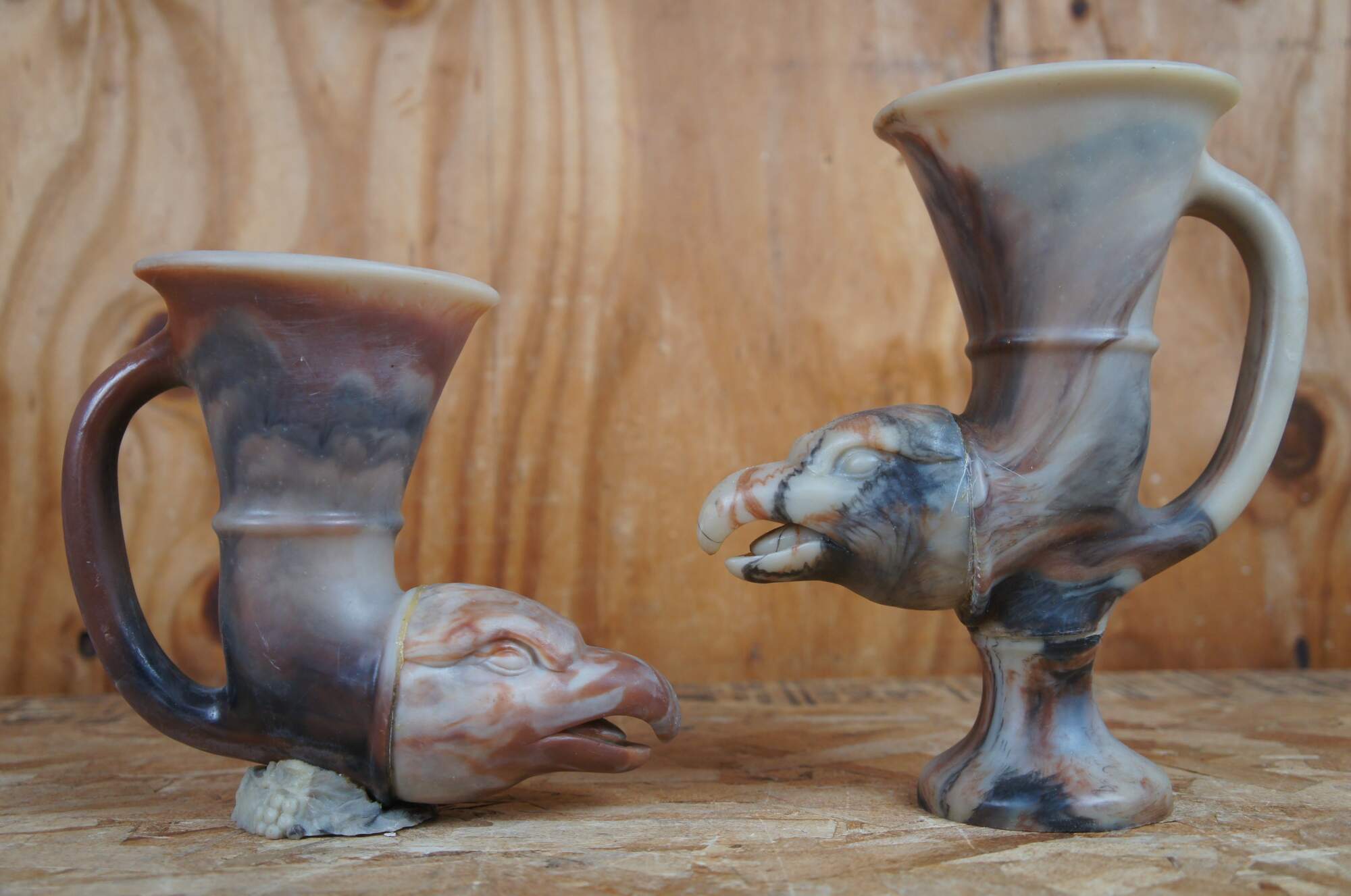 Thirteen rare vintage heraldic bar goblets mugs / cups / libation / rhyton drinking vessels. Made of resin featuring eagles, elks / stags and rams.