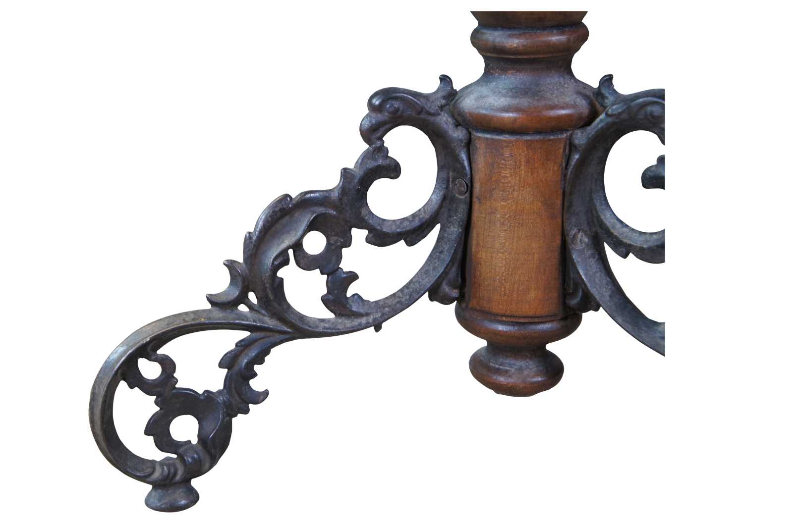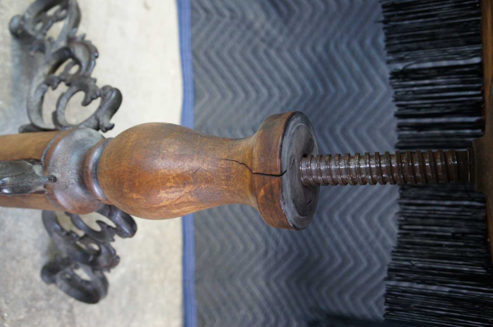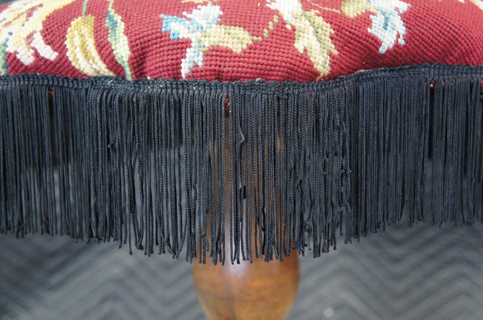 Antique 1880s adjustable piano stool featuring hexagon form with needlepoint & fringe seat, turned wood body and scrolled ornate tripod base with Phoenix / Griffon / Bird head accents.