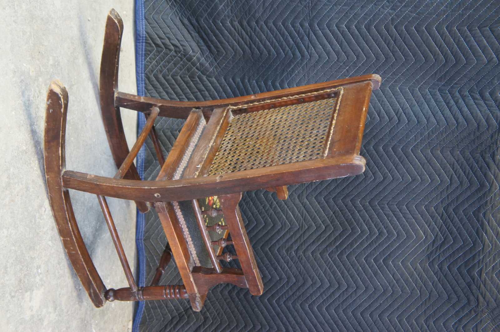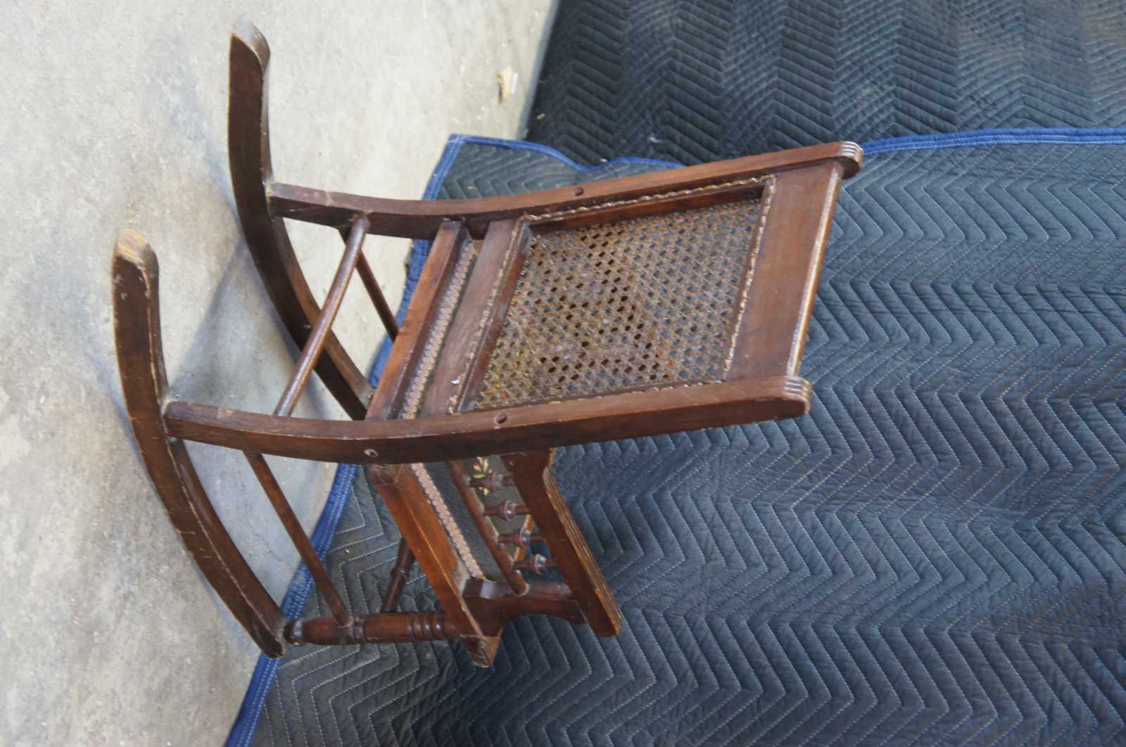 Antique Victorian Eastlake Childs rocker featuring caned and needlepoint design with turned and fluted accents.