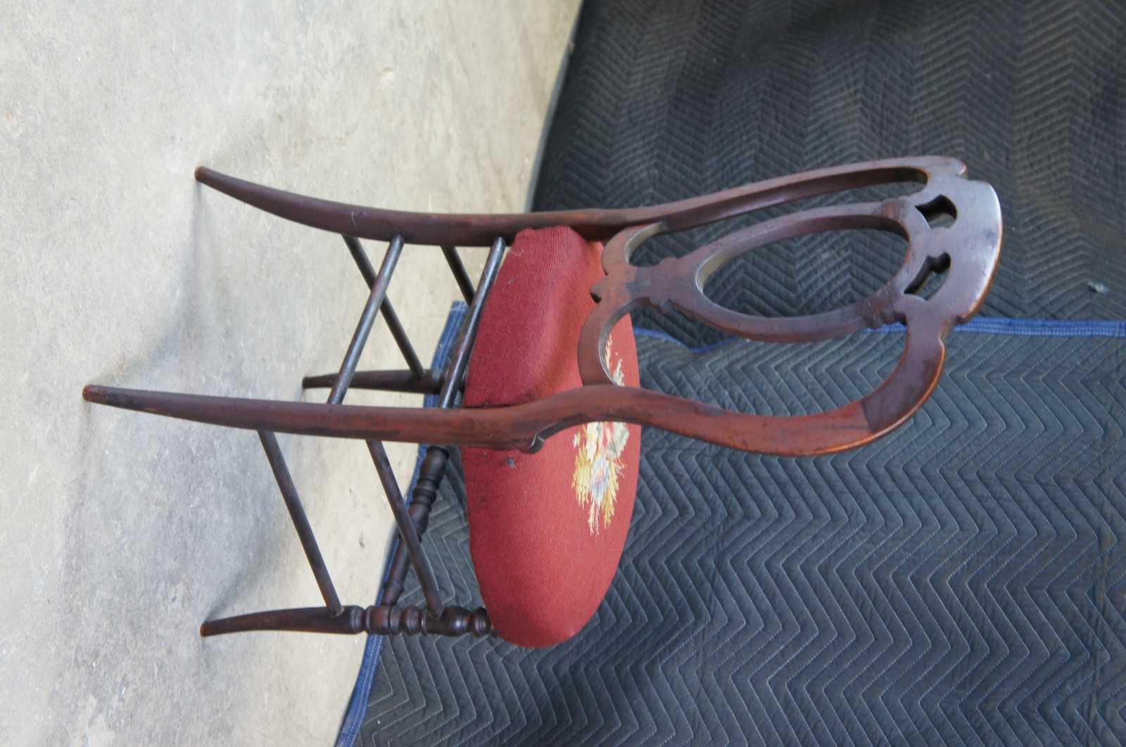 Antique 19th Century balloon back chair. Made of mahogany featuring serpentine form with balloon shaped back, needlepoint seat and turned accents.
