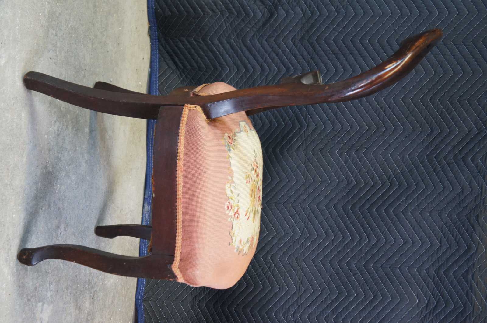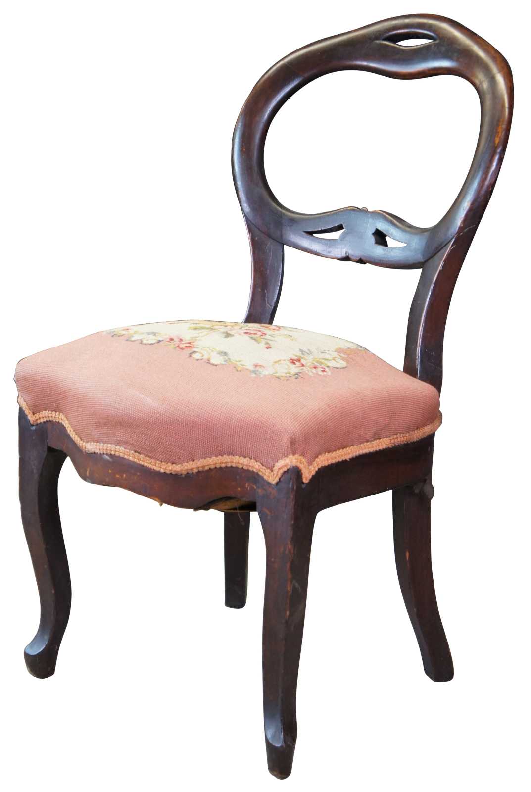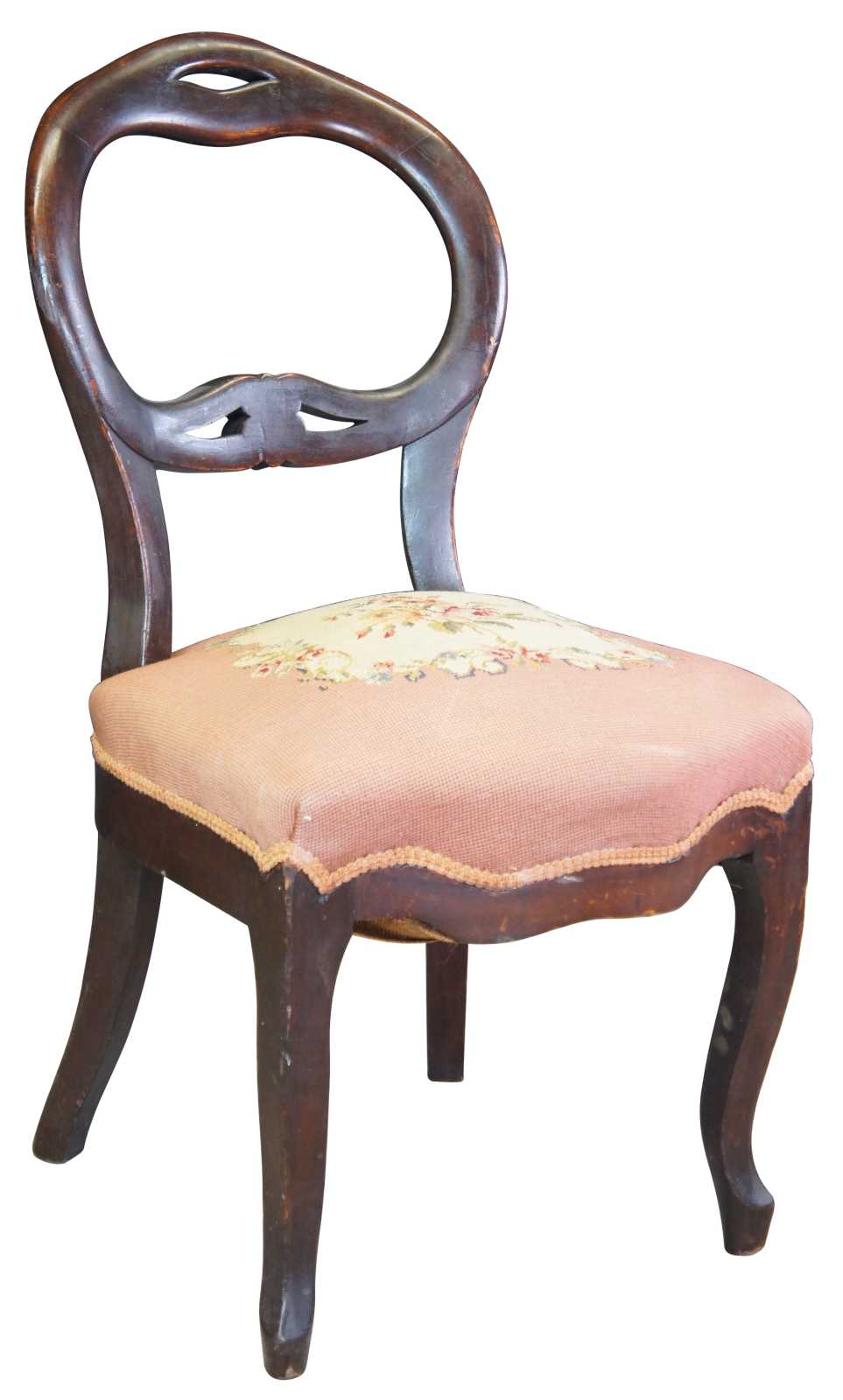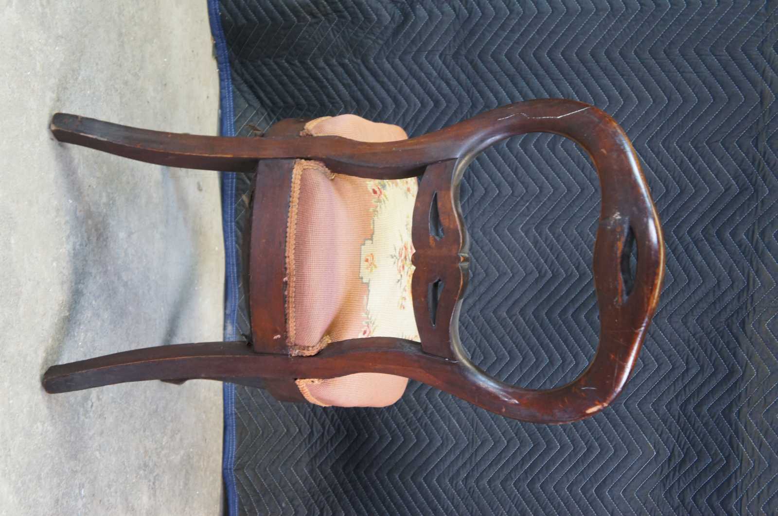 Antique Victorian mahogany chair featuring balloon back and needlepoint seat.