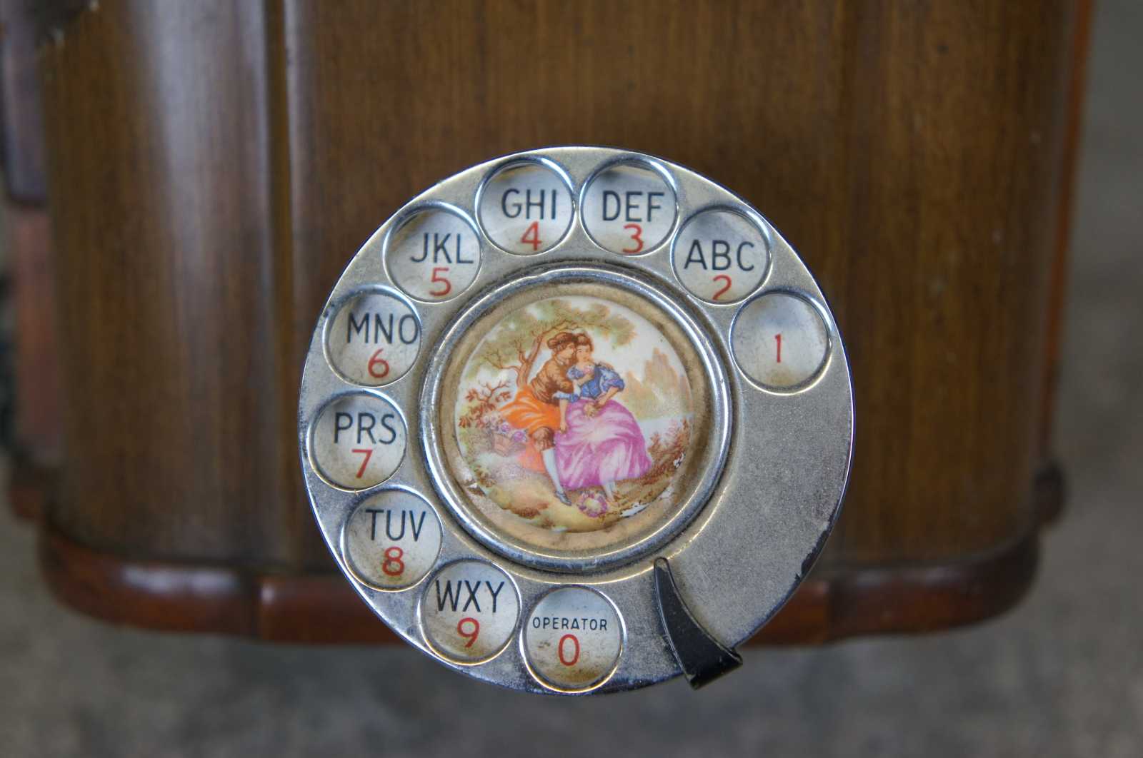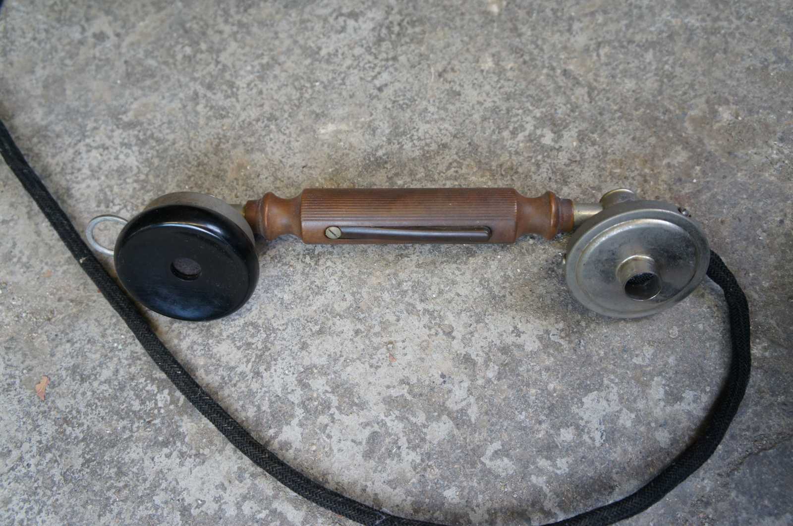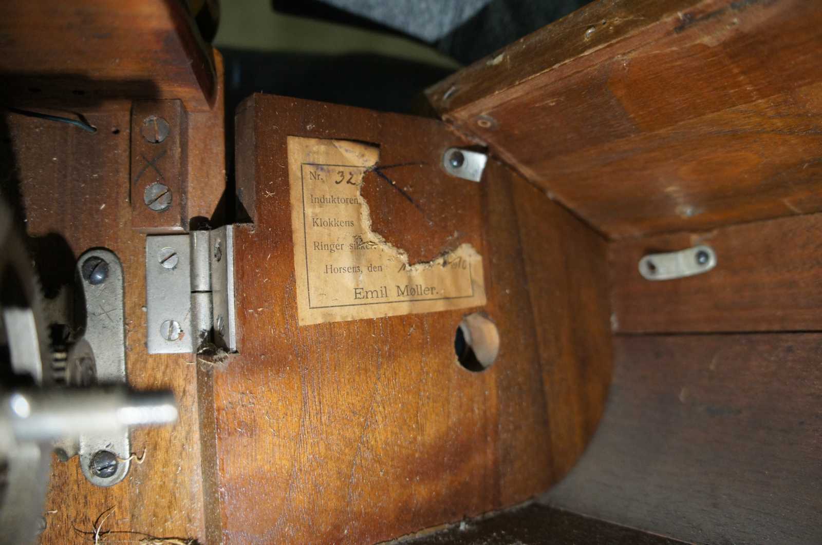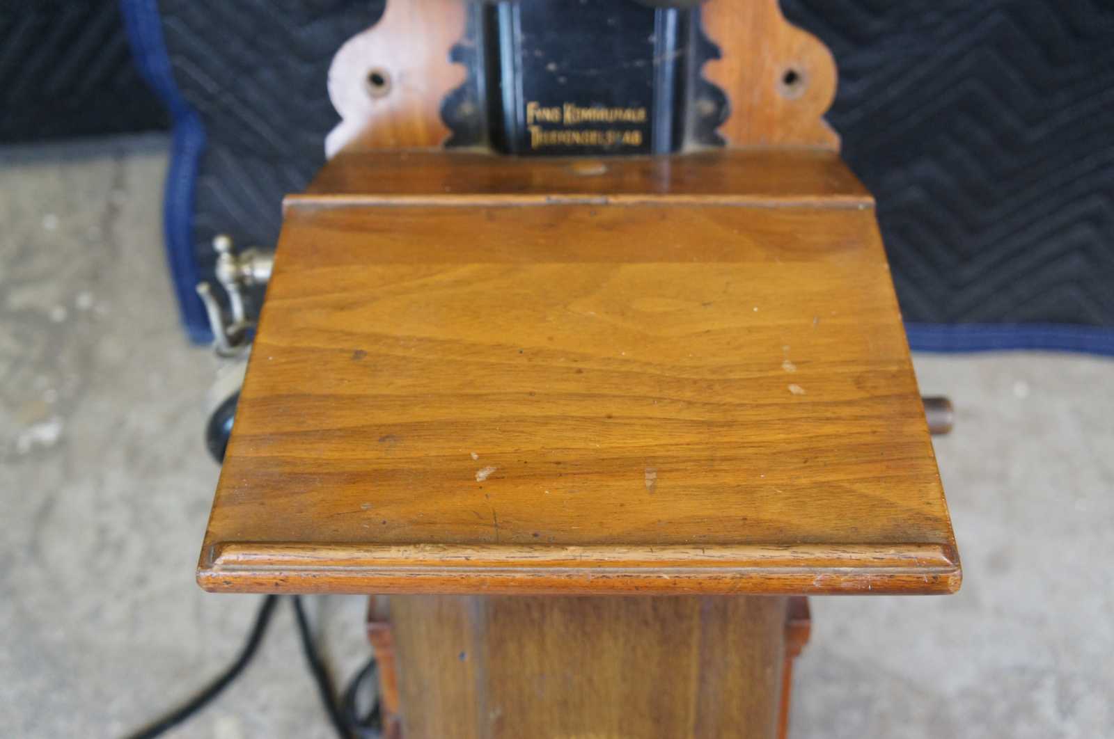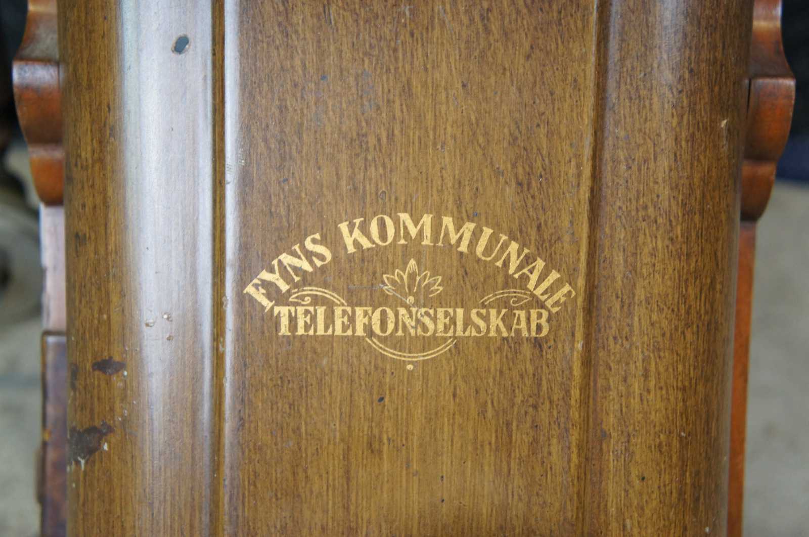 Antique Danish Edwardian Emil Moller wall phone featuring oak case with Aesthetic styling and double bell.. Fyrs Kommurale. Circa 1910.