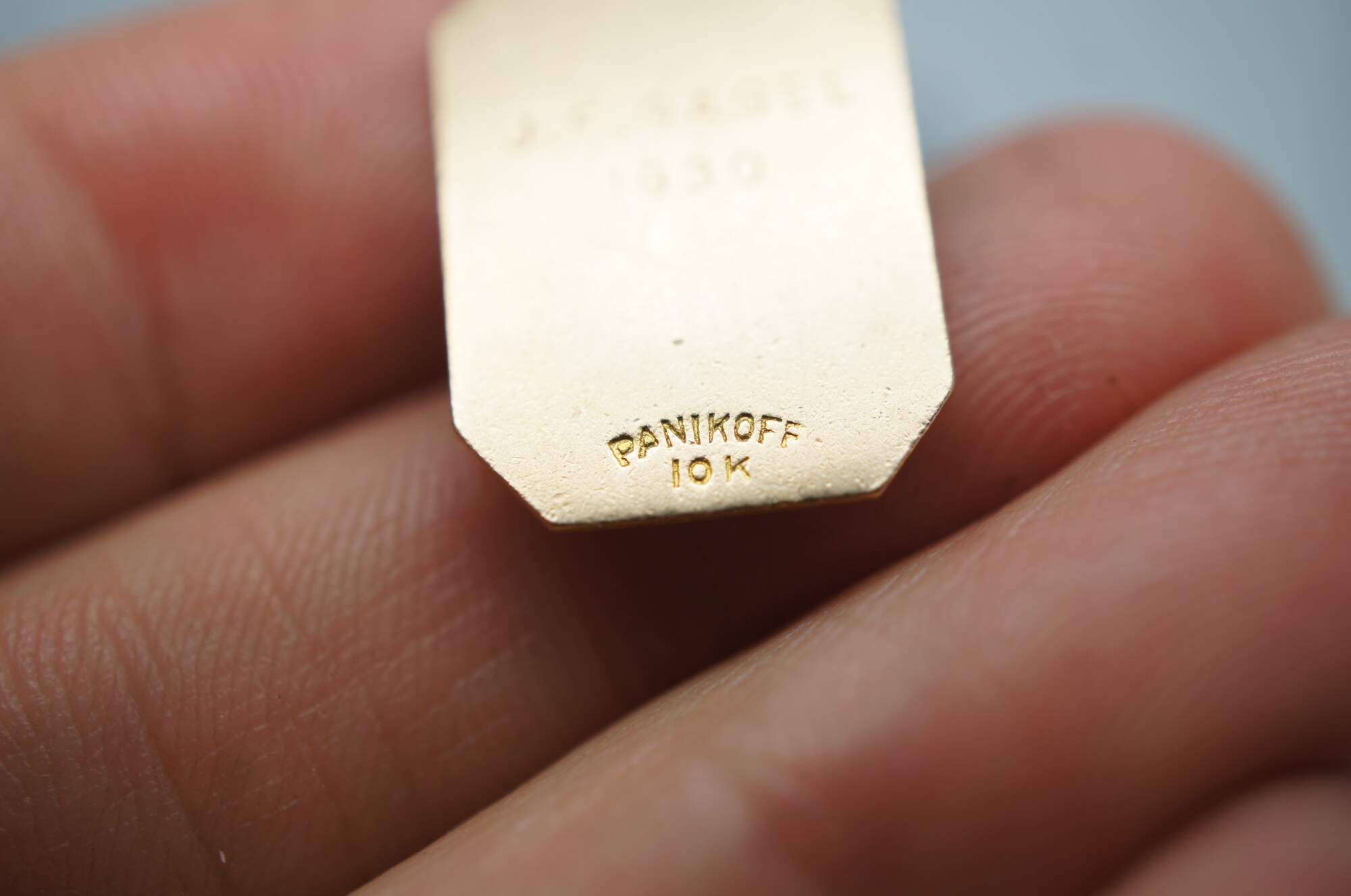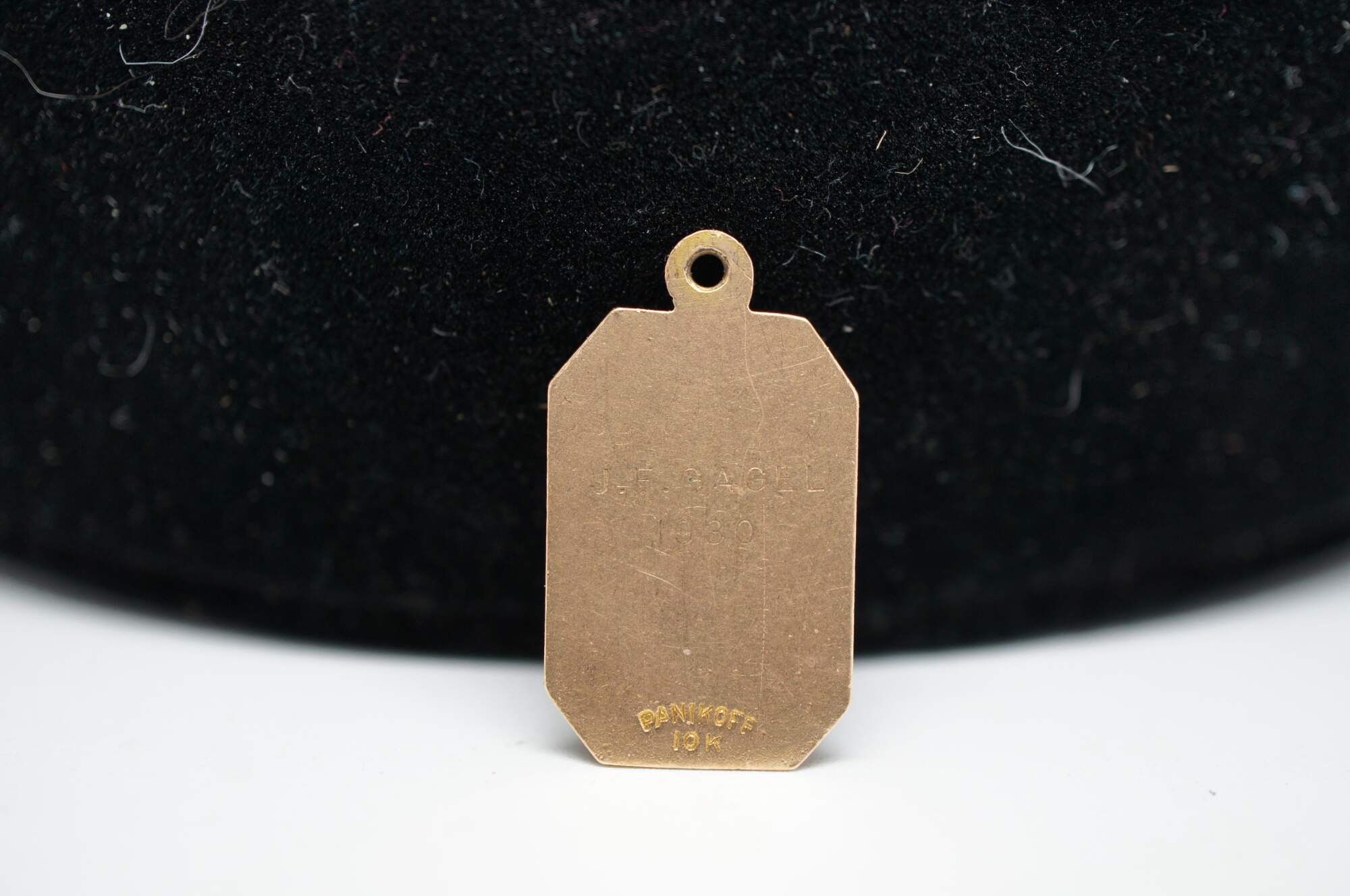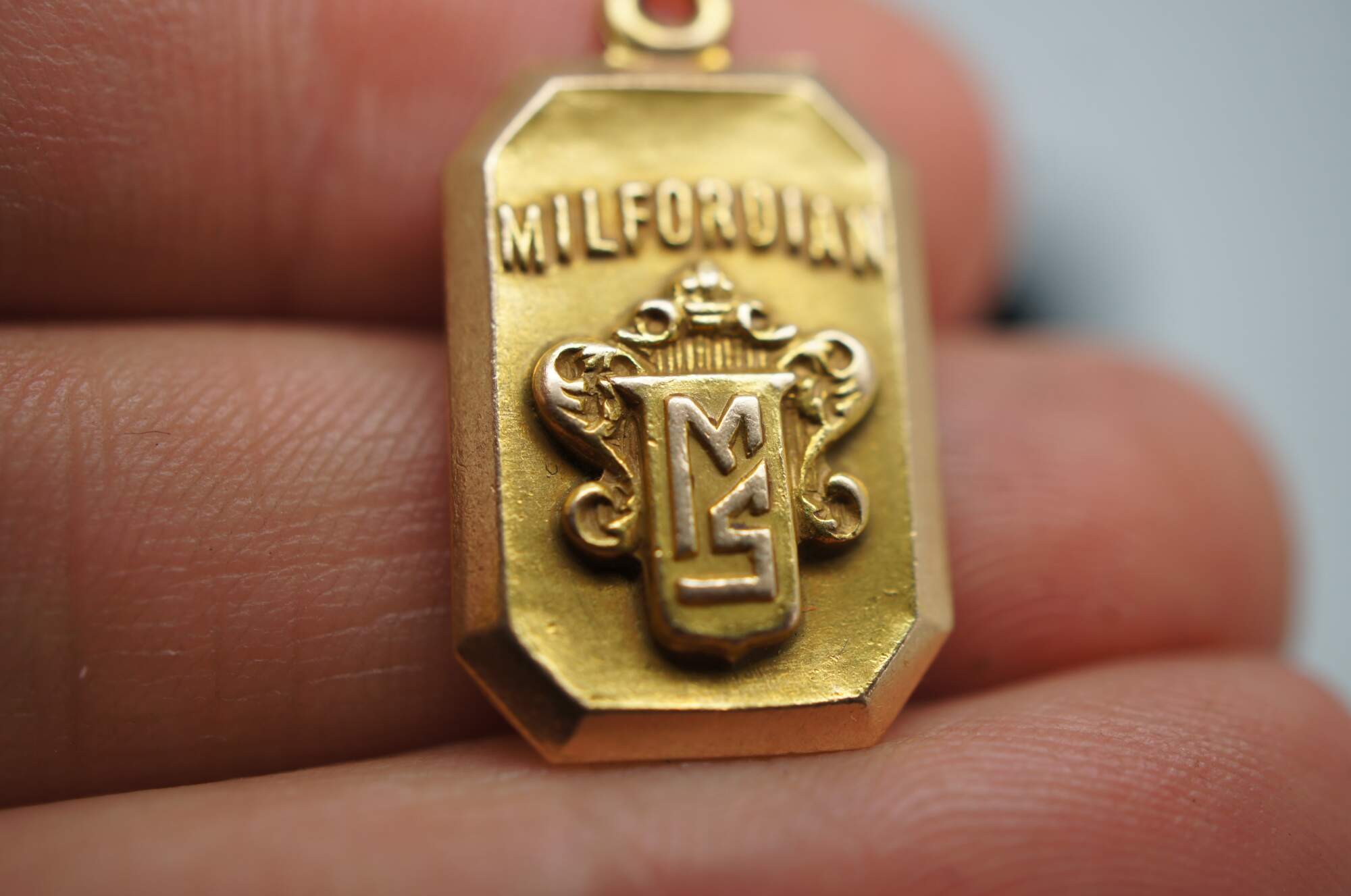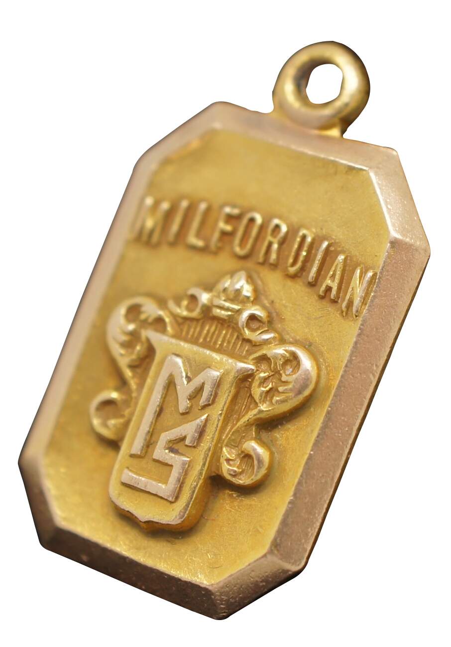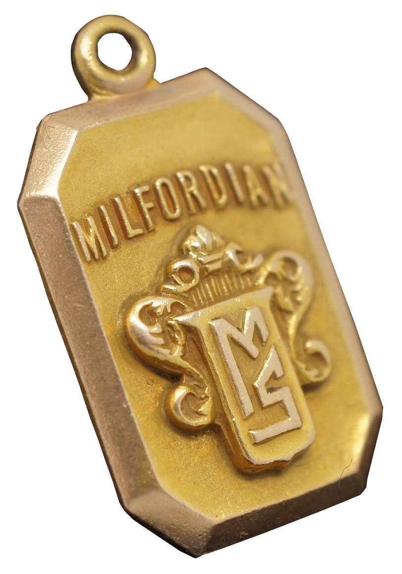 Antique Panikoff 10k yellow gold charm with the word “Milfordian” and the coat of arms of the Milford School. Engraved on the back “J.F. Gagel 1930.”