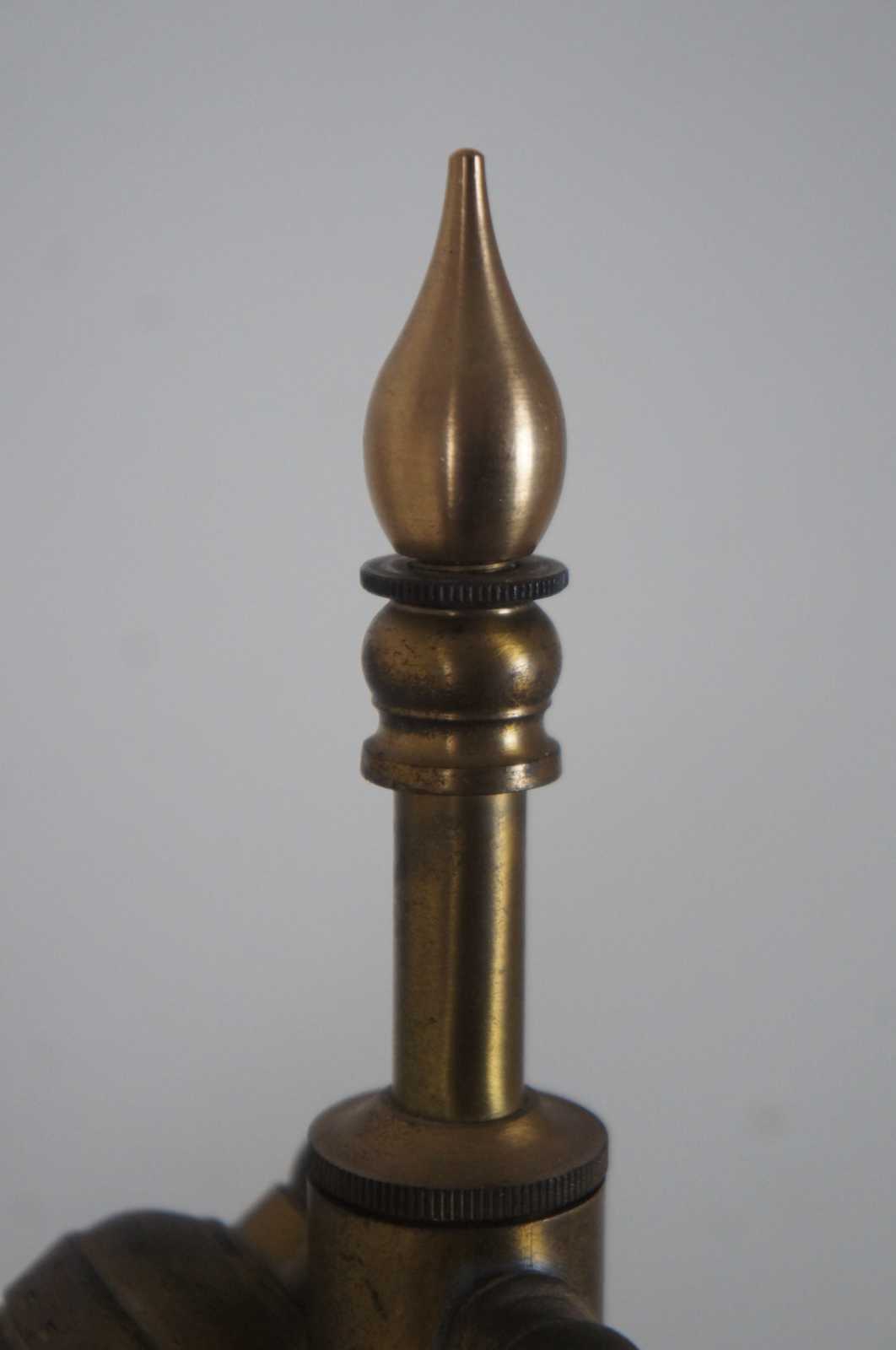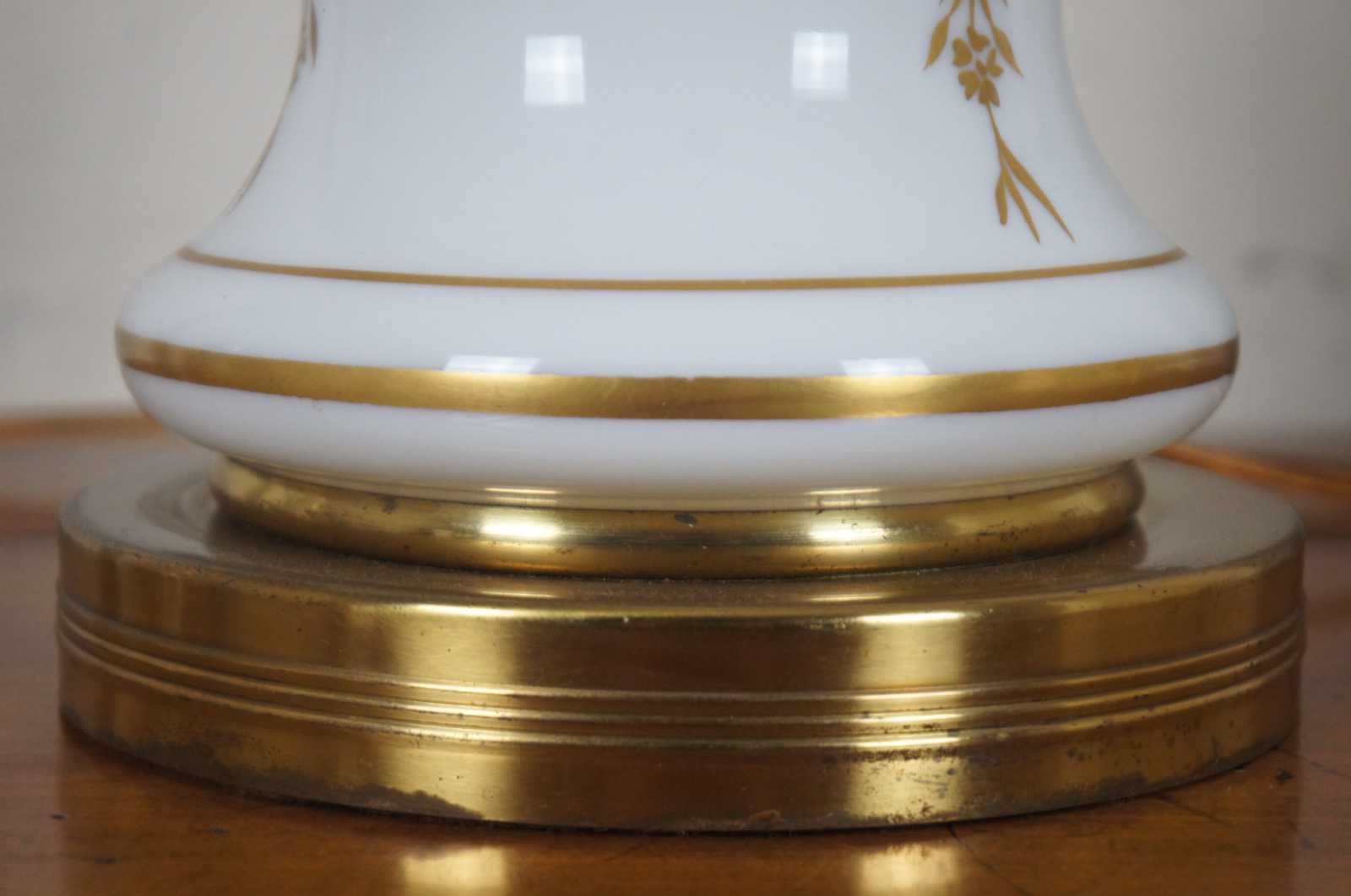 Pair of mid century two light white milk glass table lamps with French styling, painted gold floral, ribbon, wreath and swag designs, brass base and oil lamp style top with brass key.