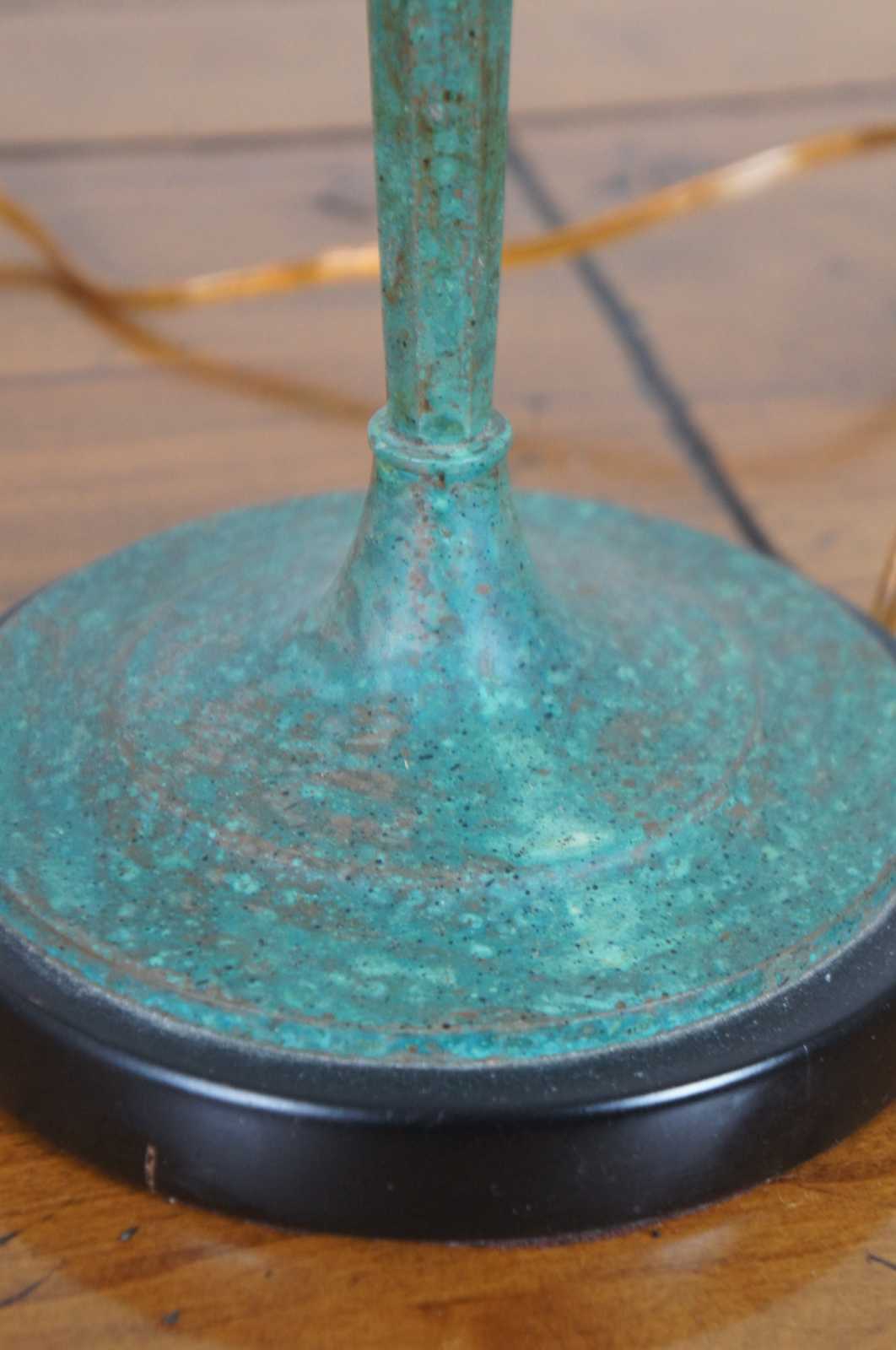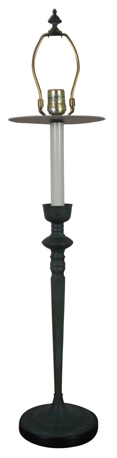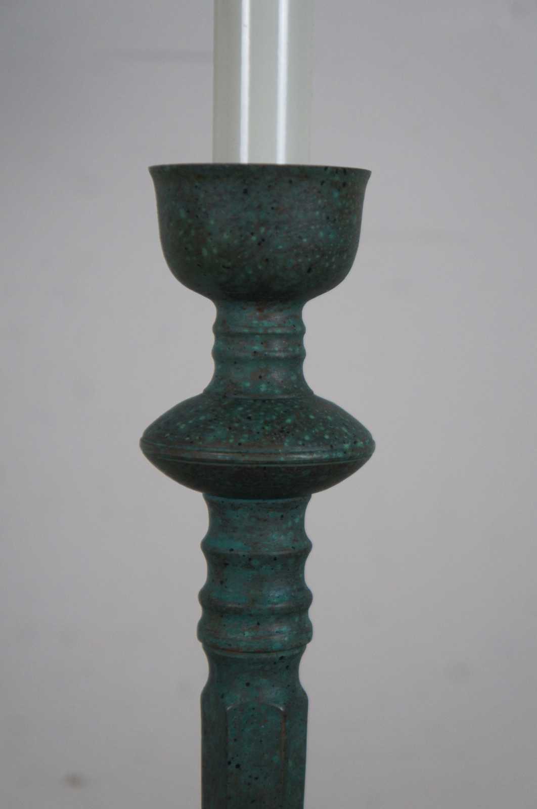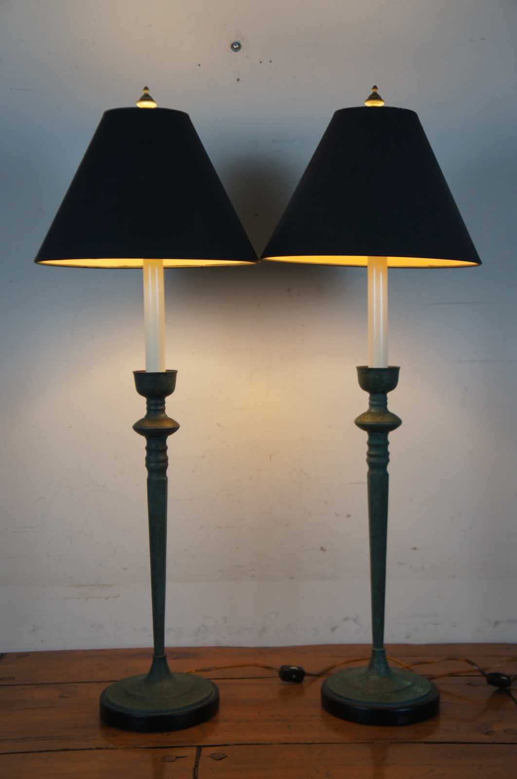 Pair of vintage Frederick Cooper buffet or banquet table lamps with candlestick tops set in metal bases painted with a mottled copper green patina.