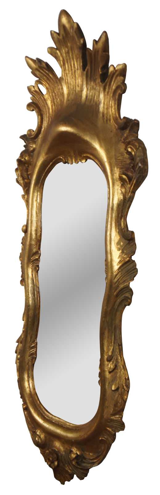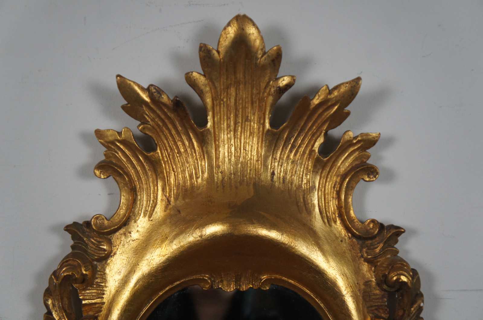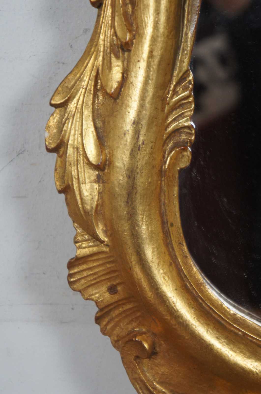 Vintage Italian rococo / baroque / Florentine oval gilt wall vanity mirror by Palmira Art Company, with a motif of scrolling leaves and a splash shape at the crest.