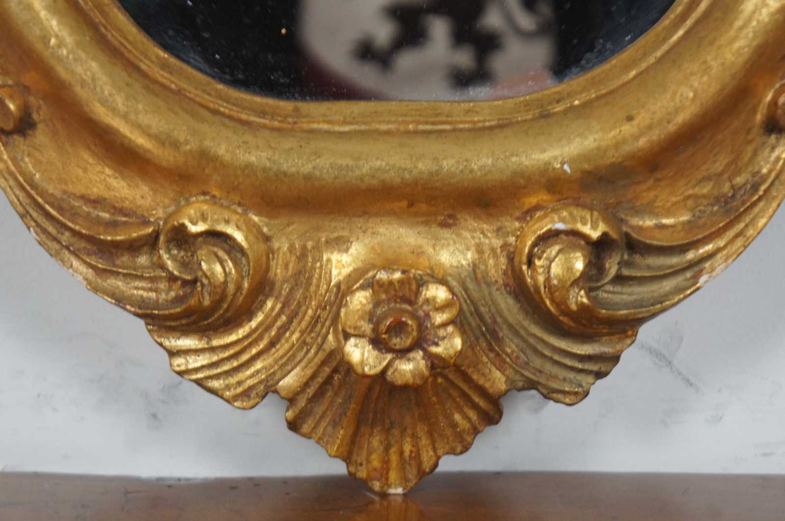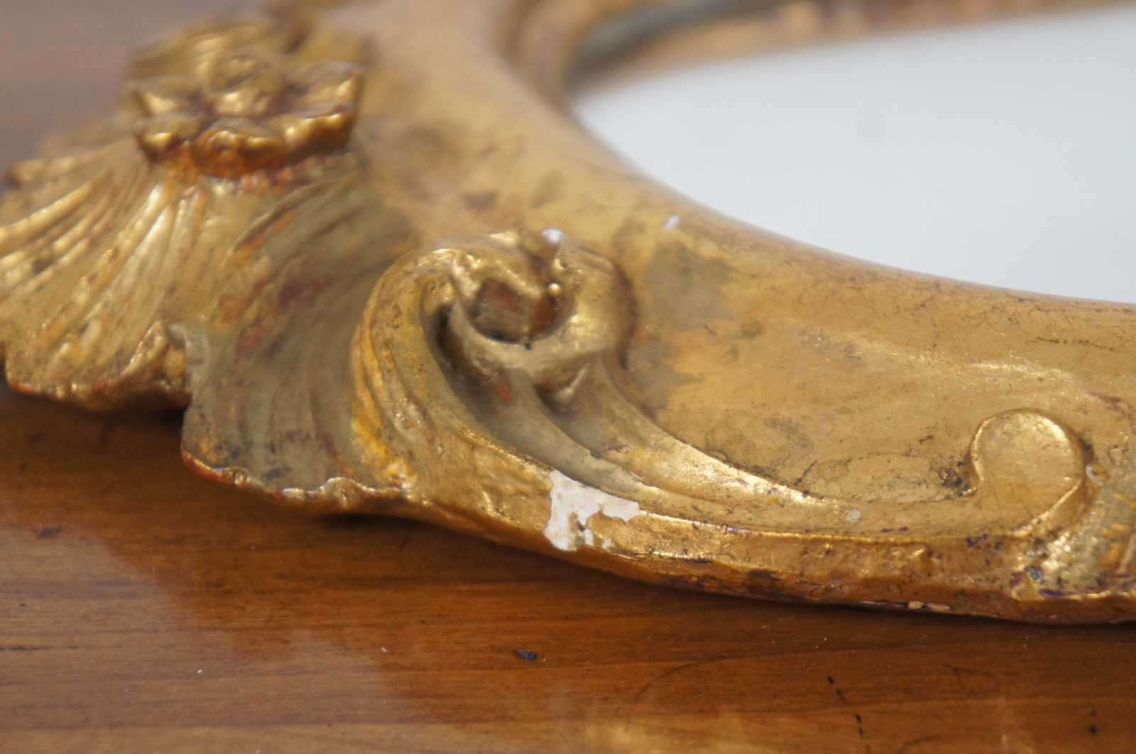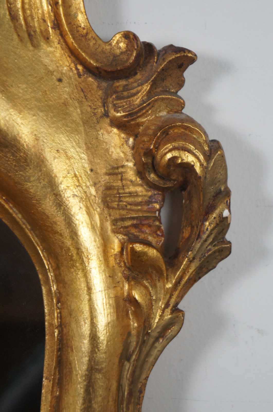 Vintage Italian rococo / baroque / Florentine oval gilt wall vanity mirror by Palmira Art Company, with a motif of scrolling leaves and a splash shape at the crest.