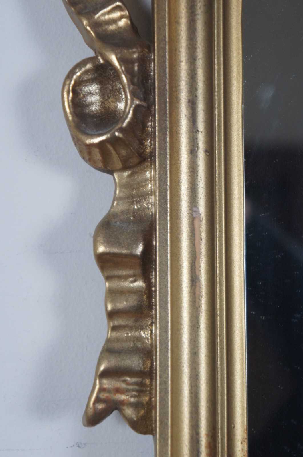 Vintage French Neoclassical Napoleon III style gold gilt wall mirror with beveled rectangular frame topped with carved ribbons.