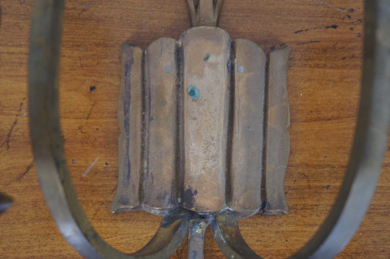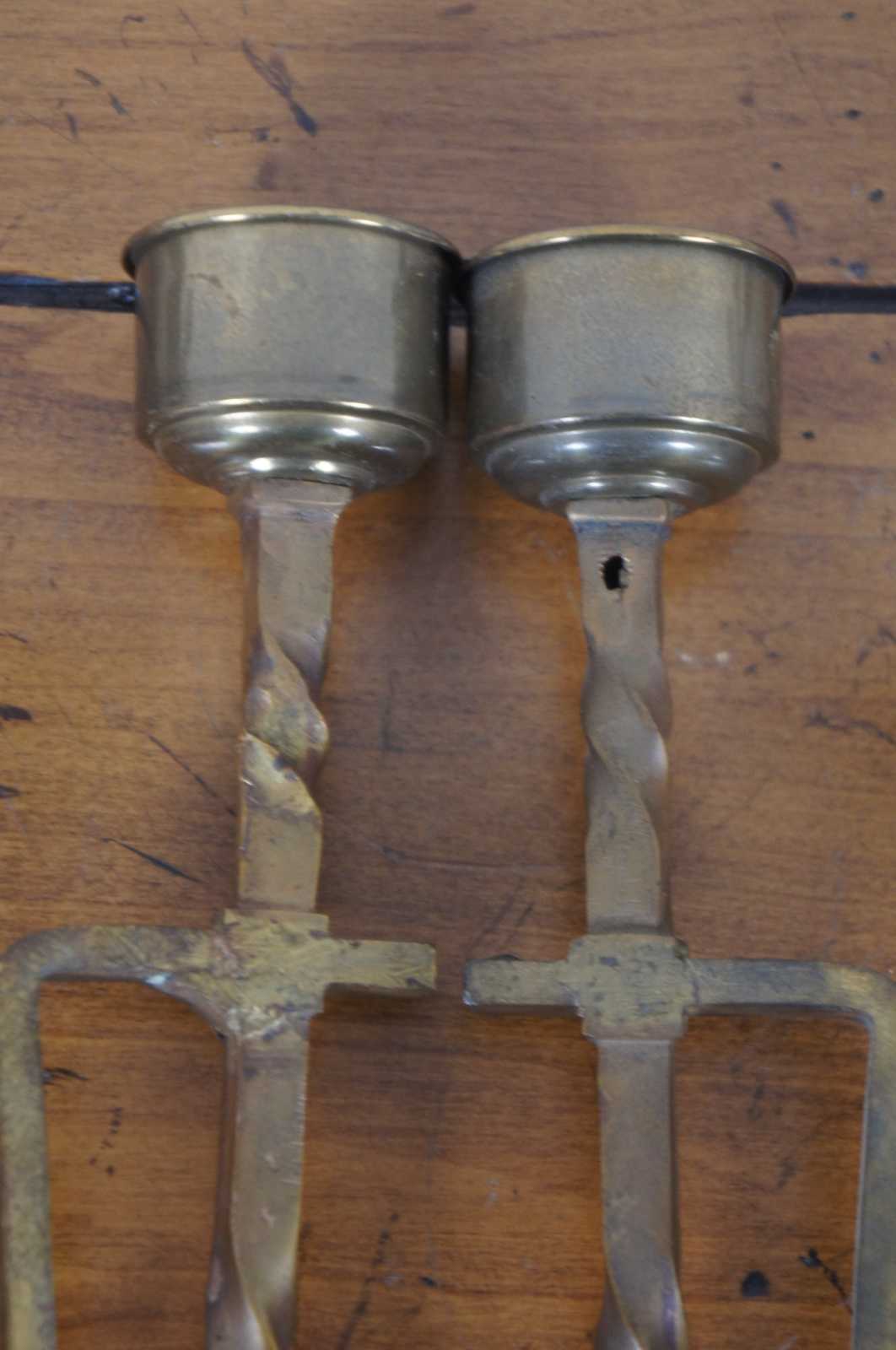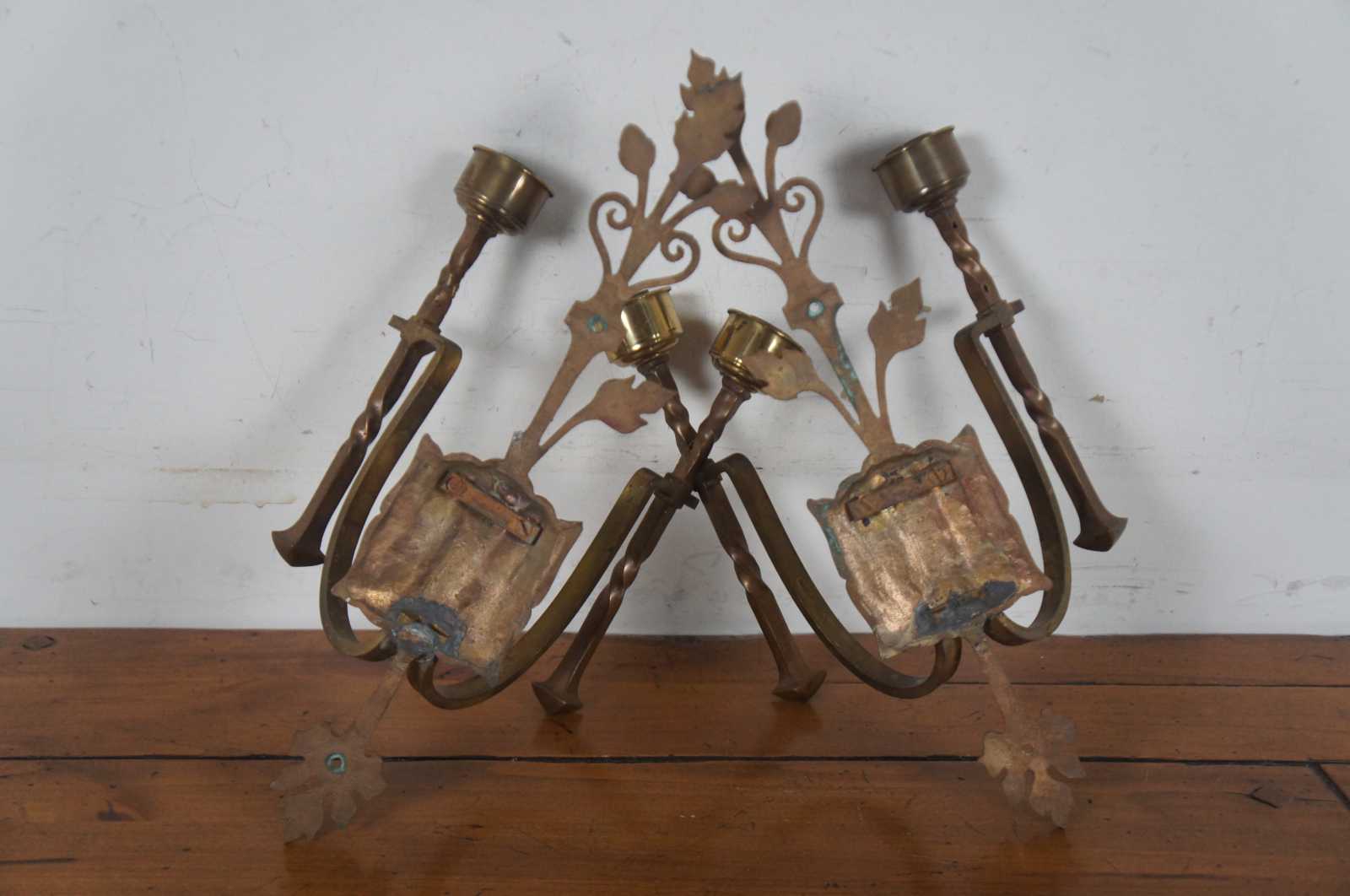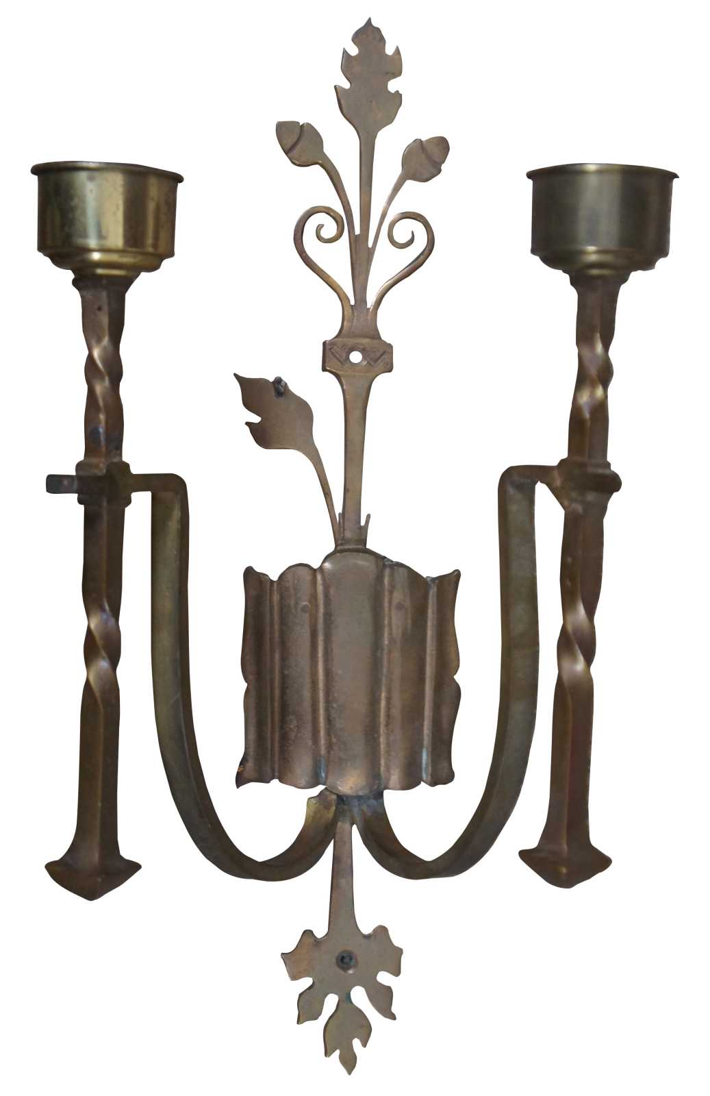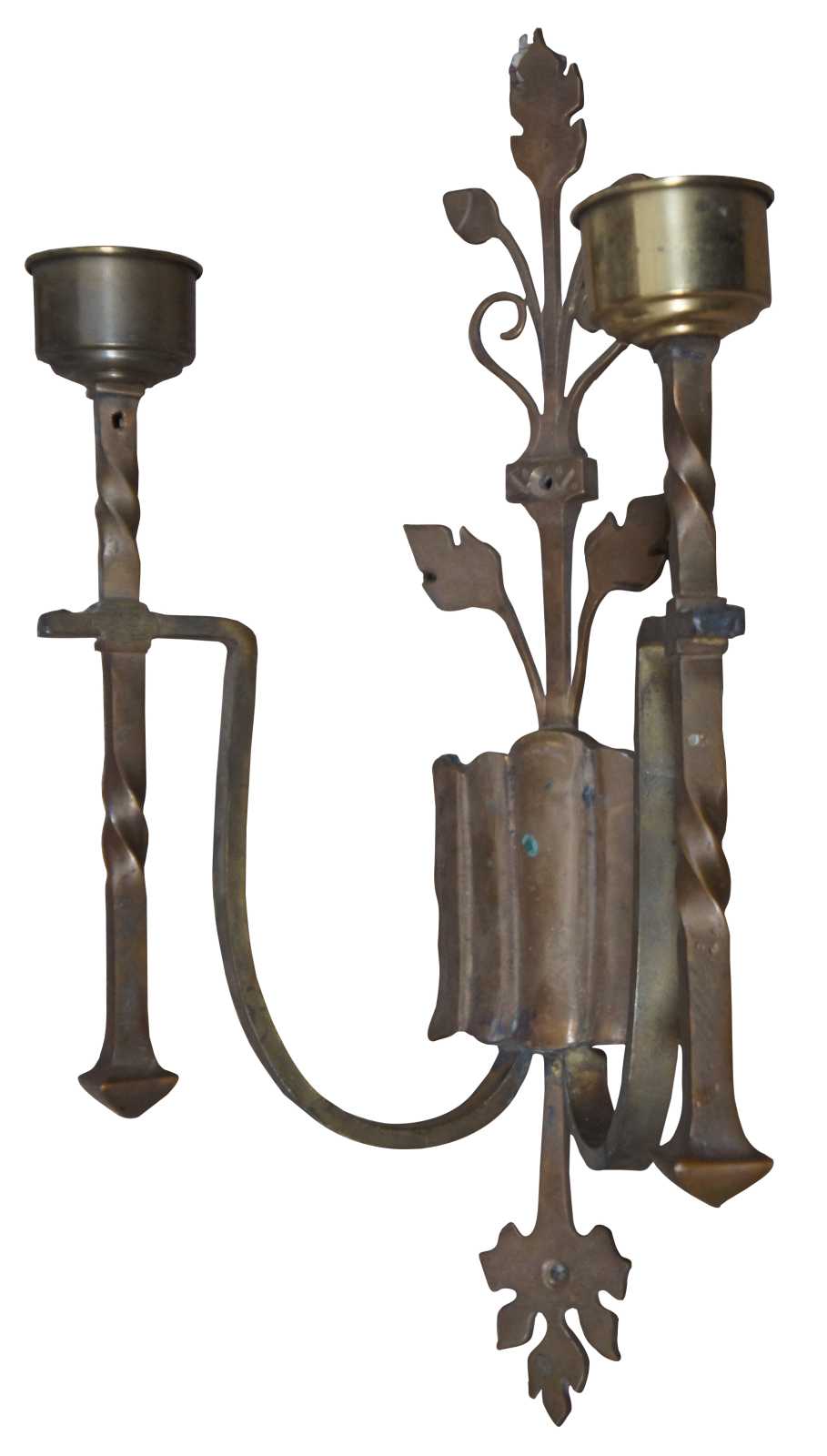 Pair of two antique brass candelabra or candle holder wall sconces accented with oak leaves and acorns.