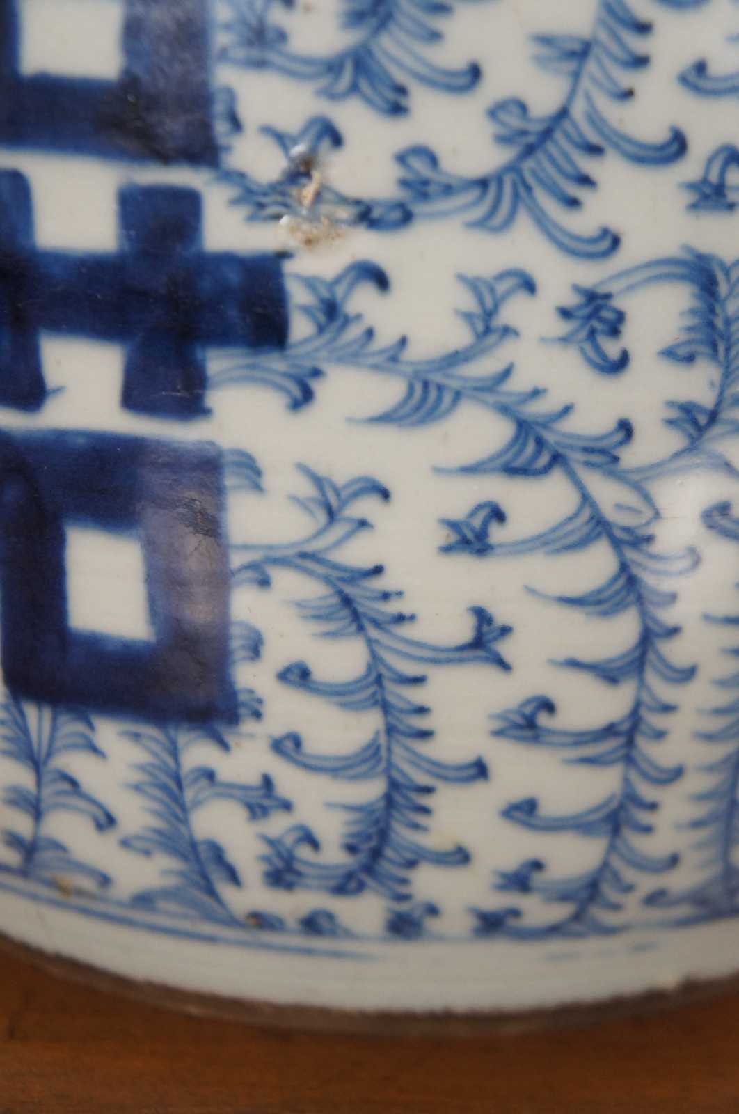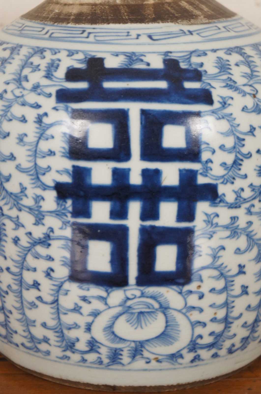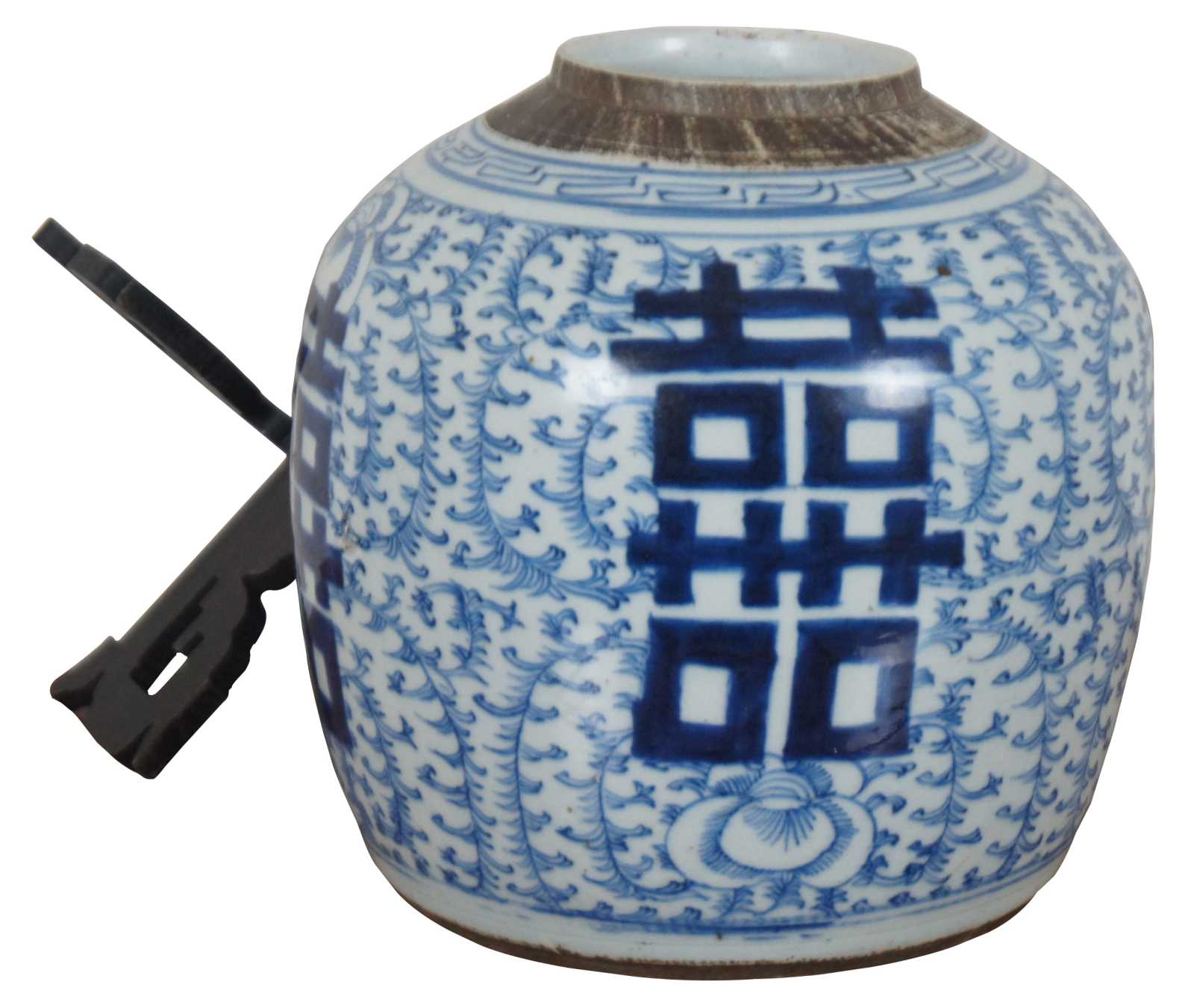 Antique 19th century wedding gift ginger jar on a two piece carved wood stand. The white and cobalt blue decoration is of sweet pea vines, symbolizing "forever" and "many children". The main decorative item is a "shuang (double) xi" (joy/bliss/happiness) character which is the recognized symbol of wedded bliss.