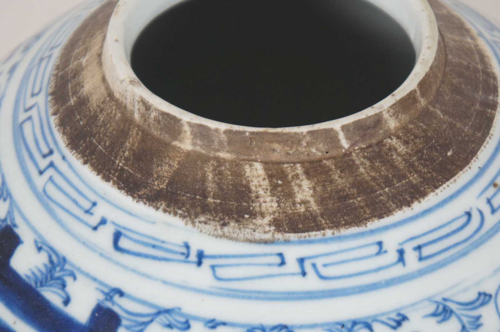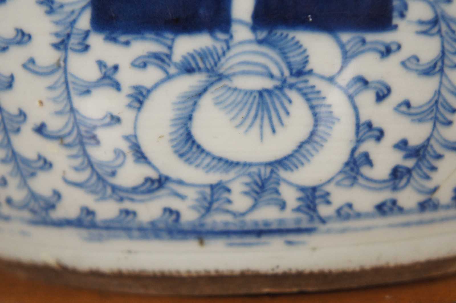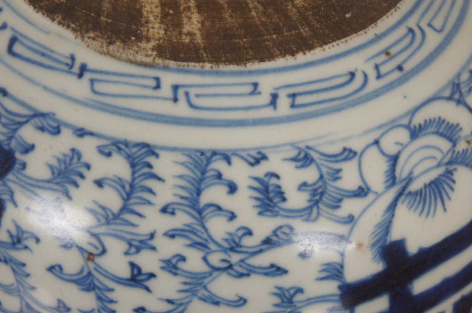 Antique 19th century wedding gift ginger jar on a two piece carved wood stand. The white and cobalt blue decoration is of sweet pea vines, symbolizing "forever" and "many children". The main decorative item is a "shuang (double) xi" (joy/bliss/happiness) character which is the recognized symbol of wedded bliss.