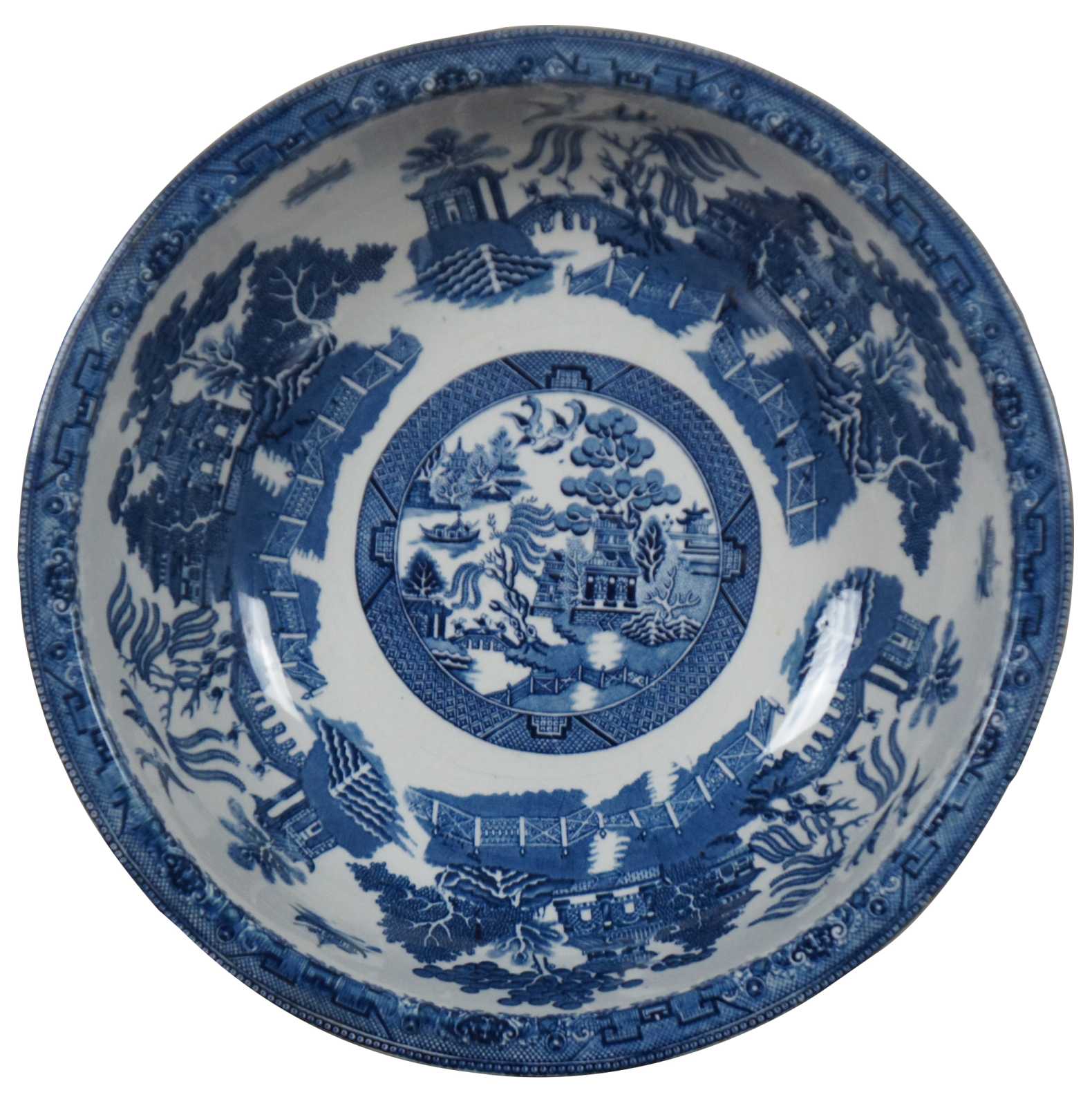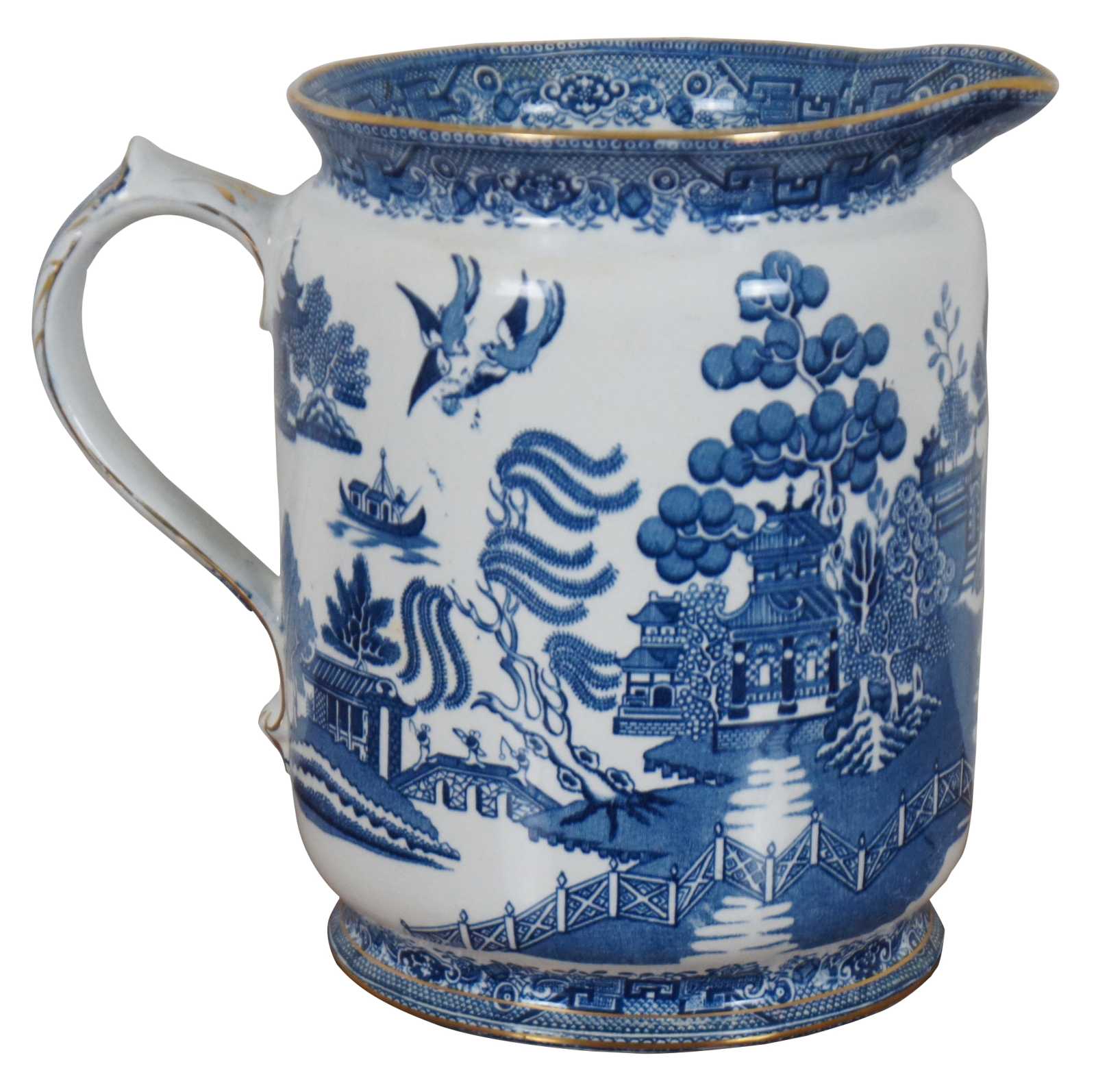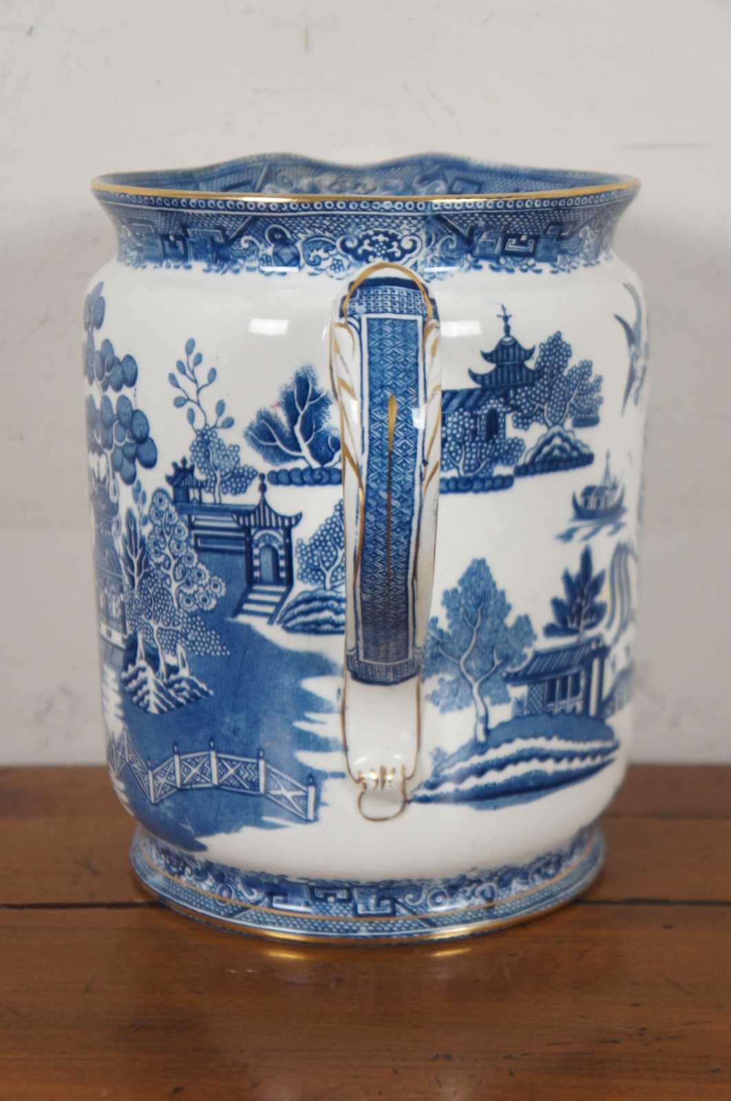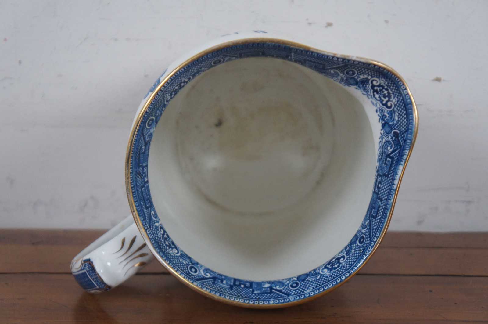 Antique early 20th century Victorian Cetem Ware blue willow pattern with gilded edge chamber wash bowl and pitcher / basin and ewer. “Maling pottery was produced in the north east of England for just over two centuries. The name of the pottery derives from the French surname of Malin. The family were Protestant Huguenots who fled their native land in the sixteenth century to escape the threat of religious persecution. They settled in England and prospered in a variety of business enterprises including coal, shipping and timber. Somewhere over the centuries the name was anglicized by the addition of a final ""g"". The pottery was founded at North Hylton, Sunderland in 1762,[1] and transferred to Newcastle upon Tyne in 1817.[2]