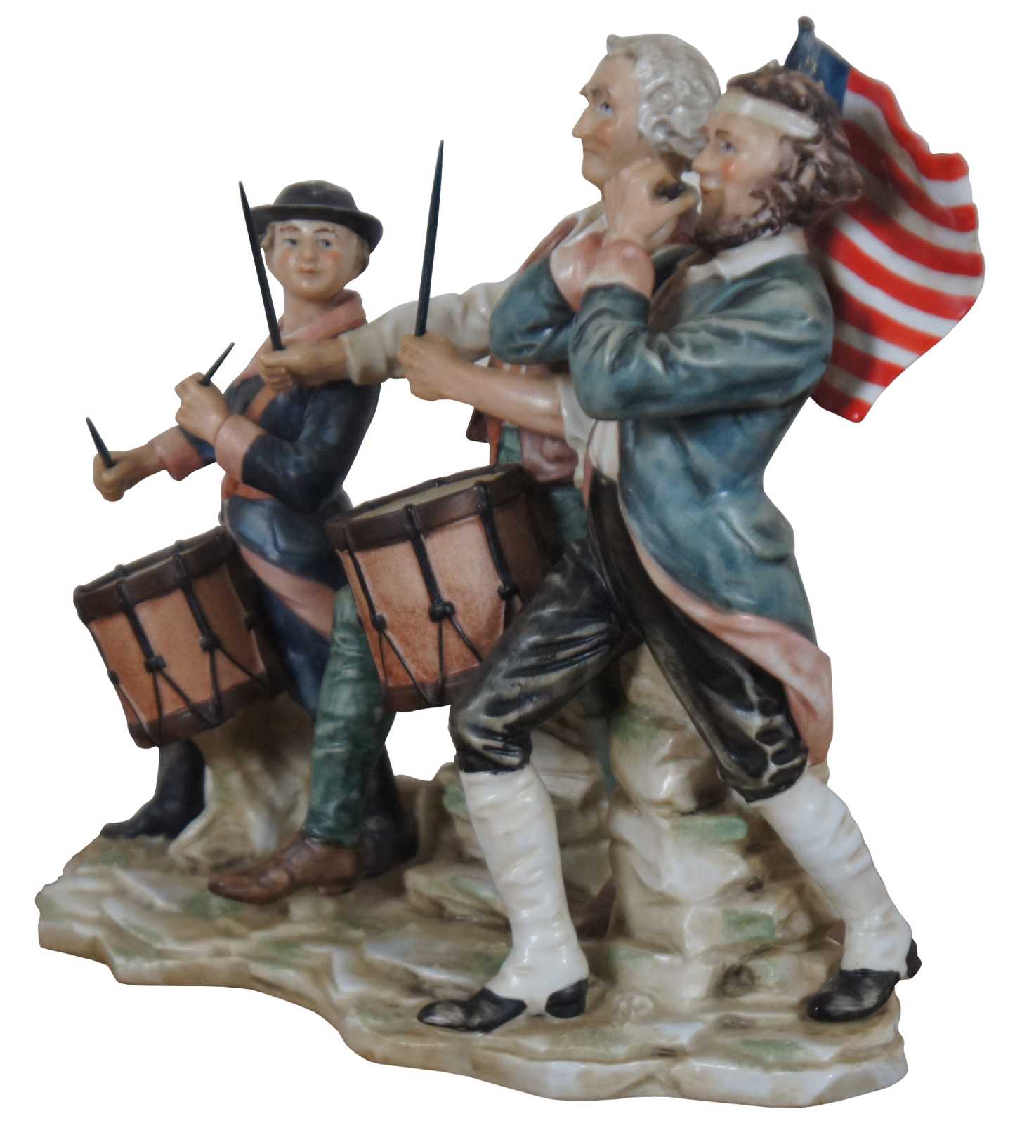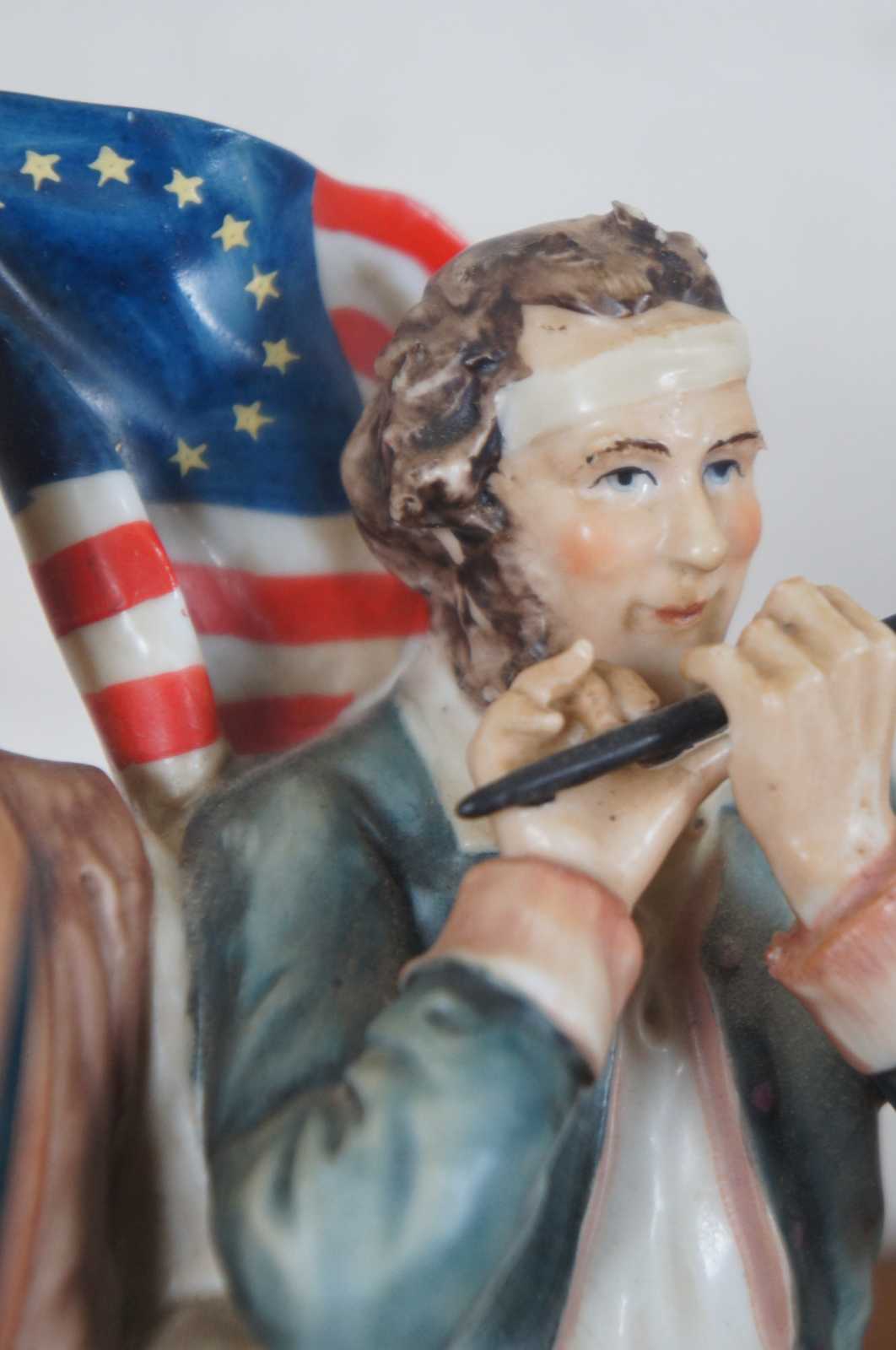 Vintage hand painted porcelain figurine after the painting Spirit of 1776 by Archibald Willard, showing George Washington marching triumphantly with two Revolutionary fife and drum playing soldiers. Crafted by Andrea by Sadek.