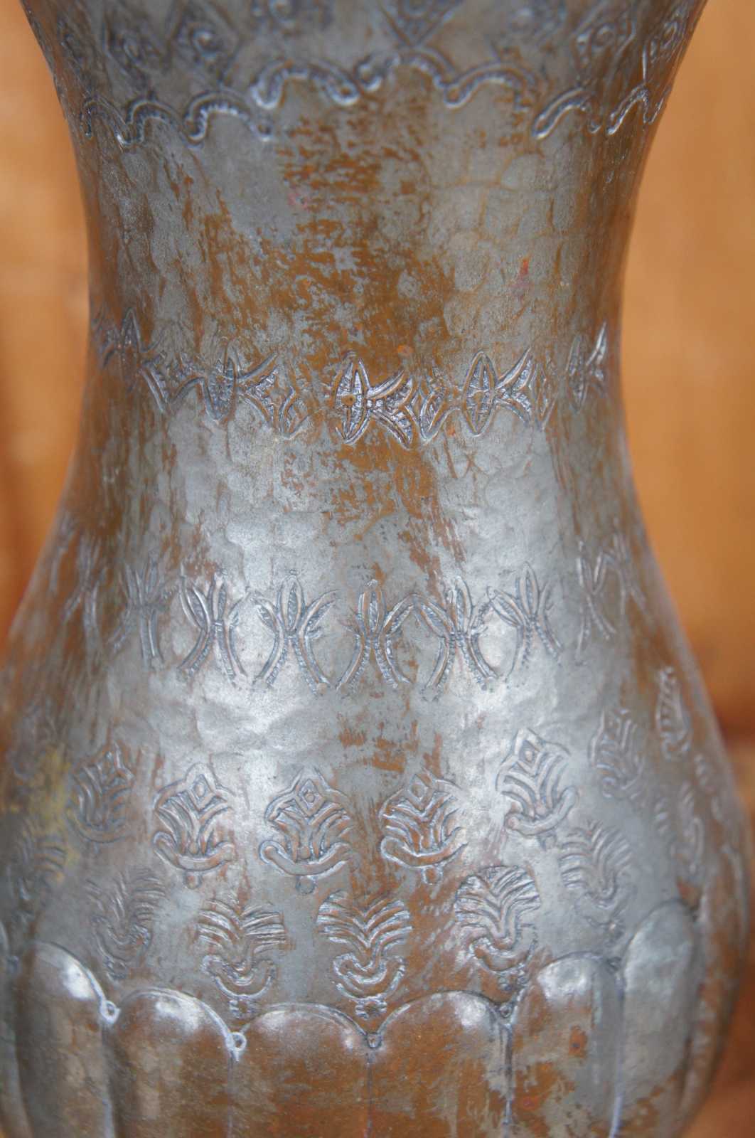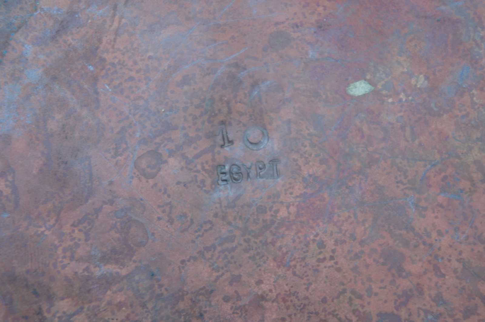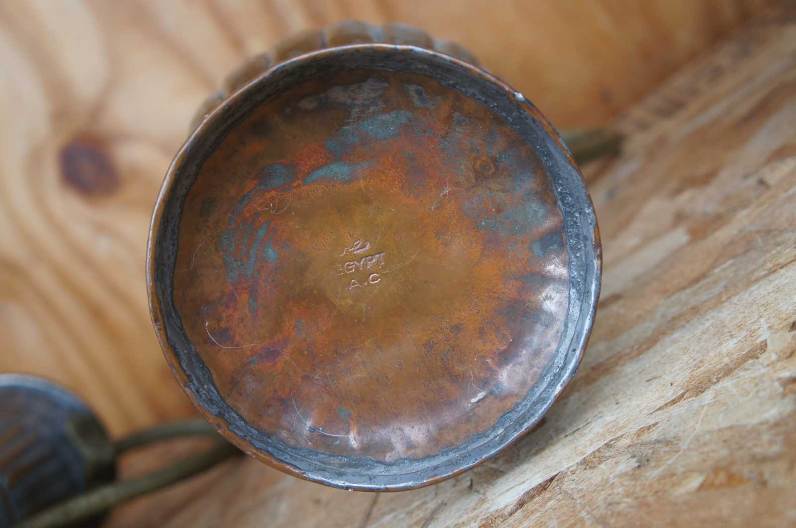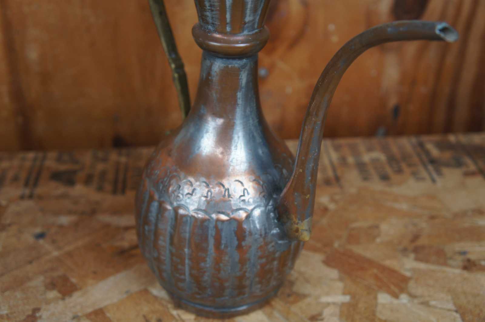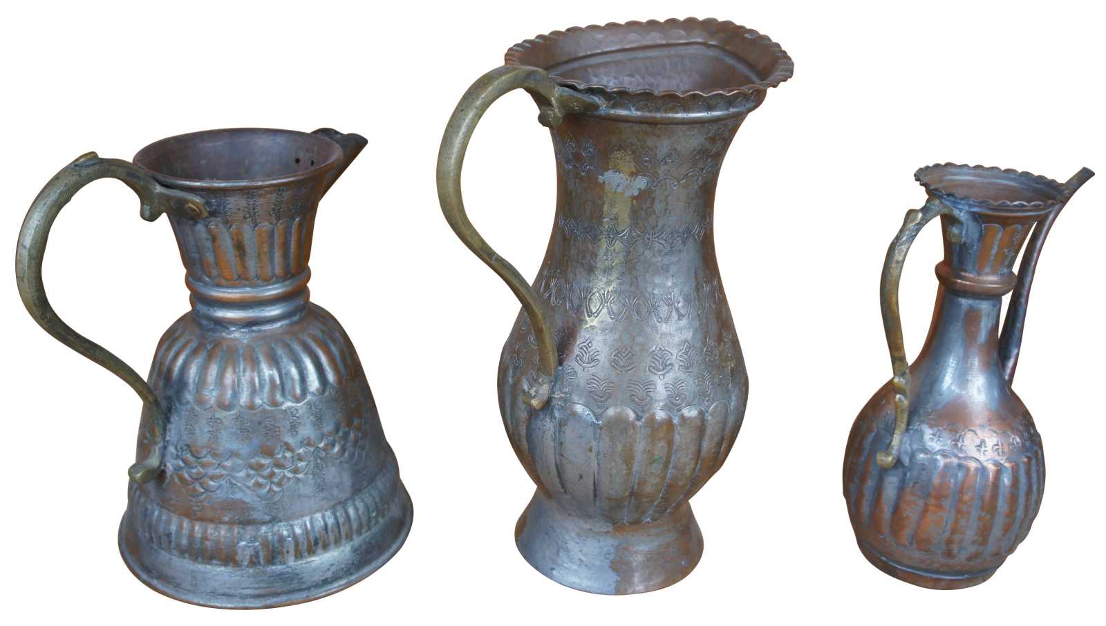 Three of assorted hammered copper pitchers featuring various designs and styles with fleur de lis and ribbed accents, and scrolled handles. One features a bonsai gooseneck spout. Stamped with ‘Egypt’ on the bottom.