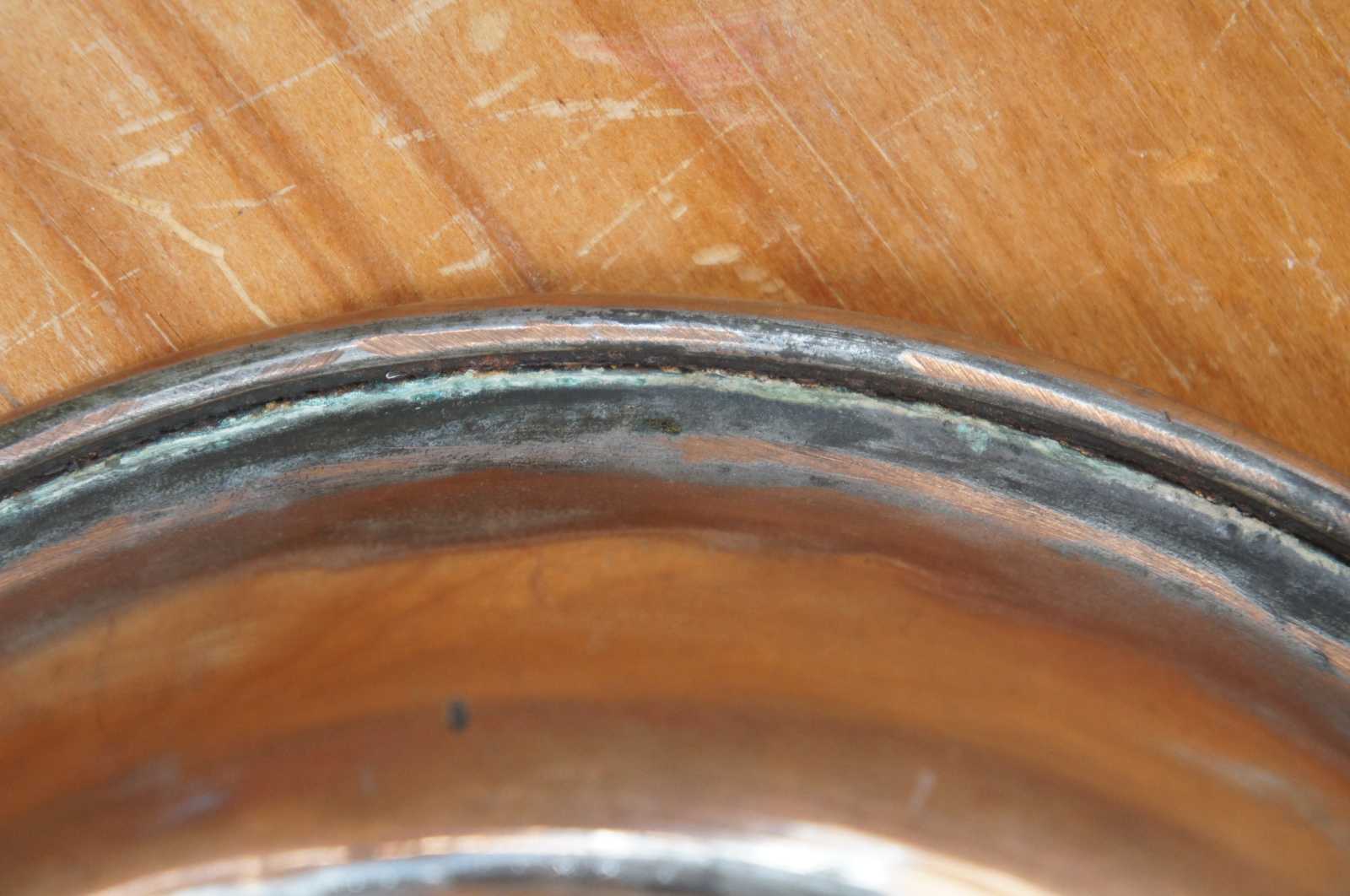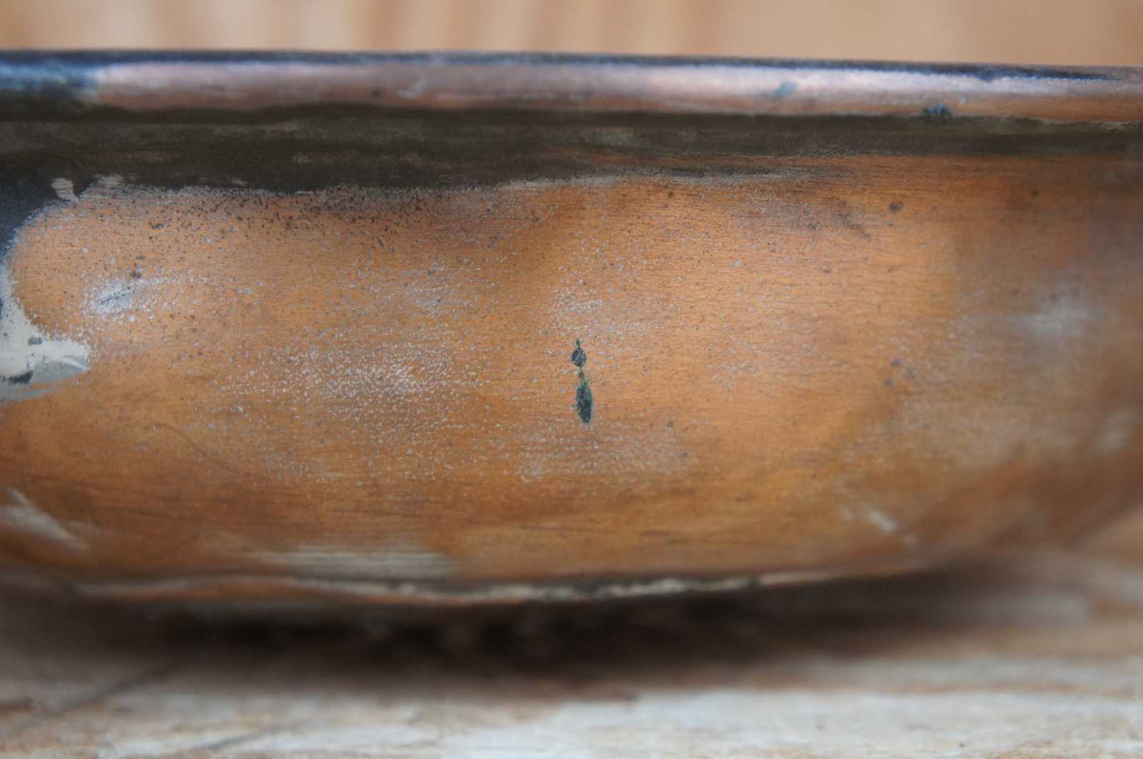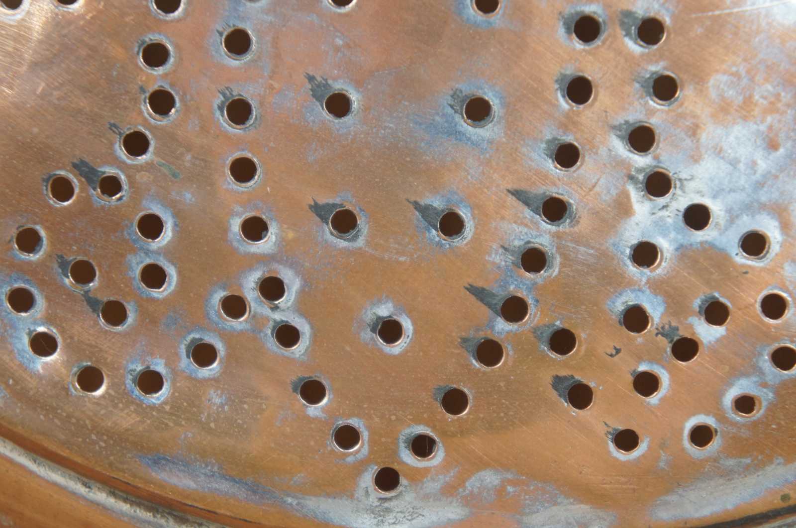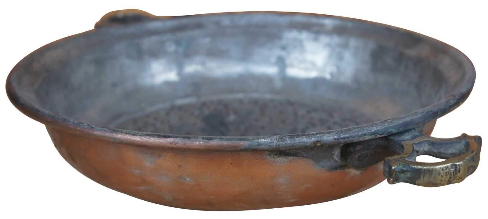 Antique tin lined copper colander with brass handles and star or flower shaped strainers.