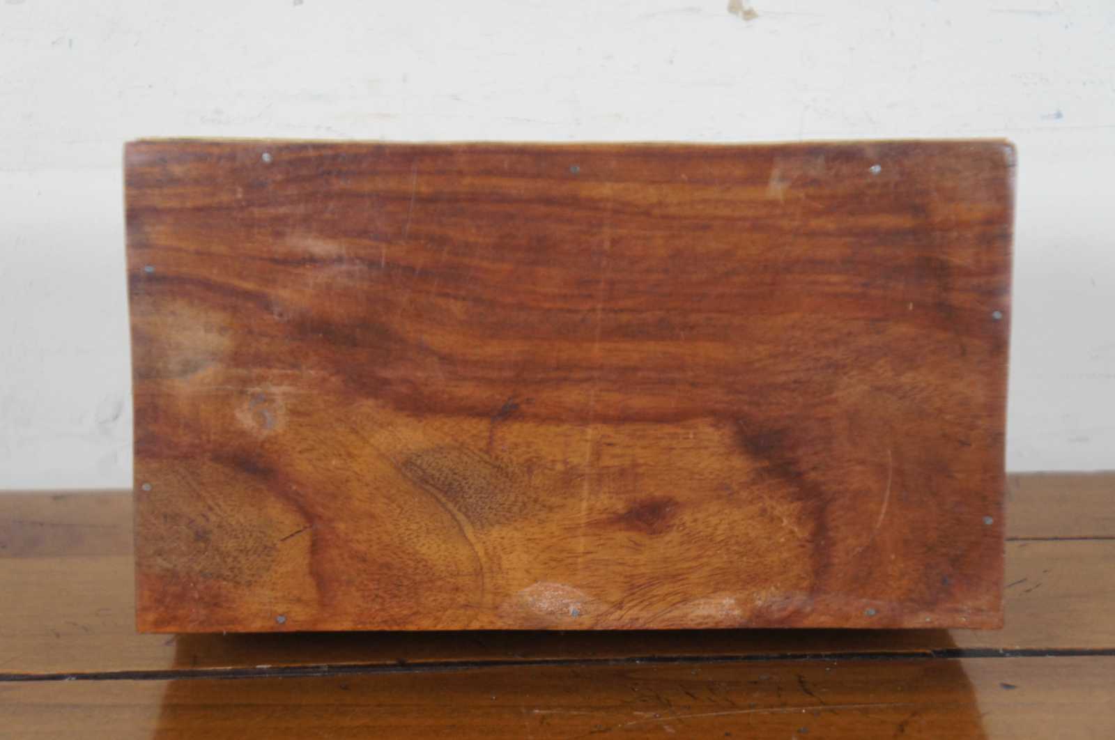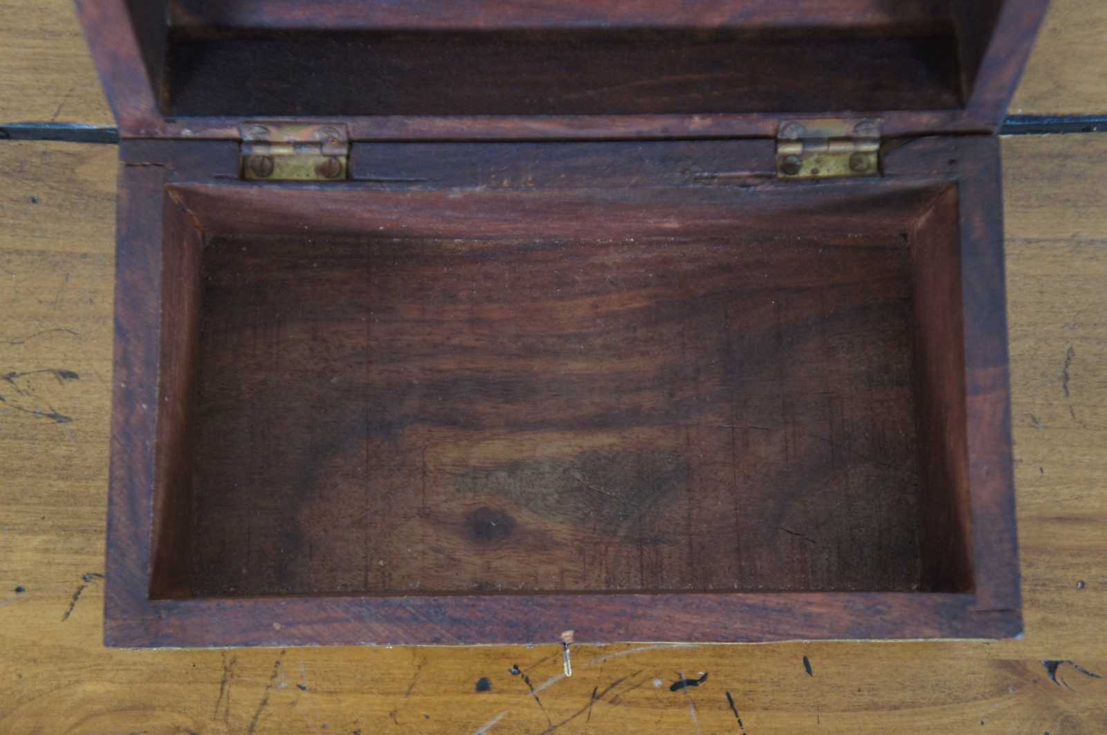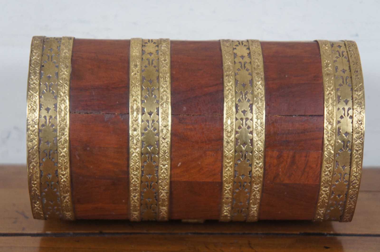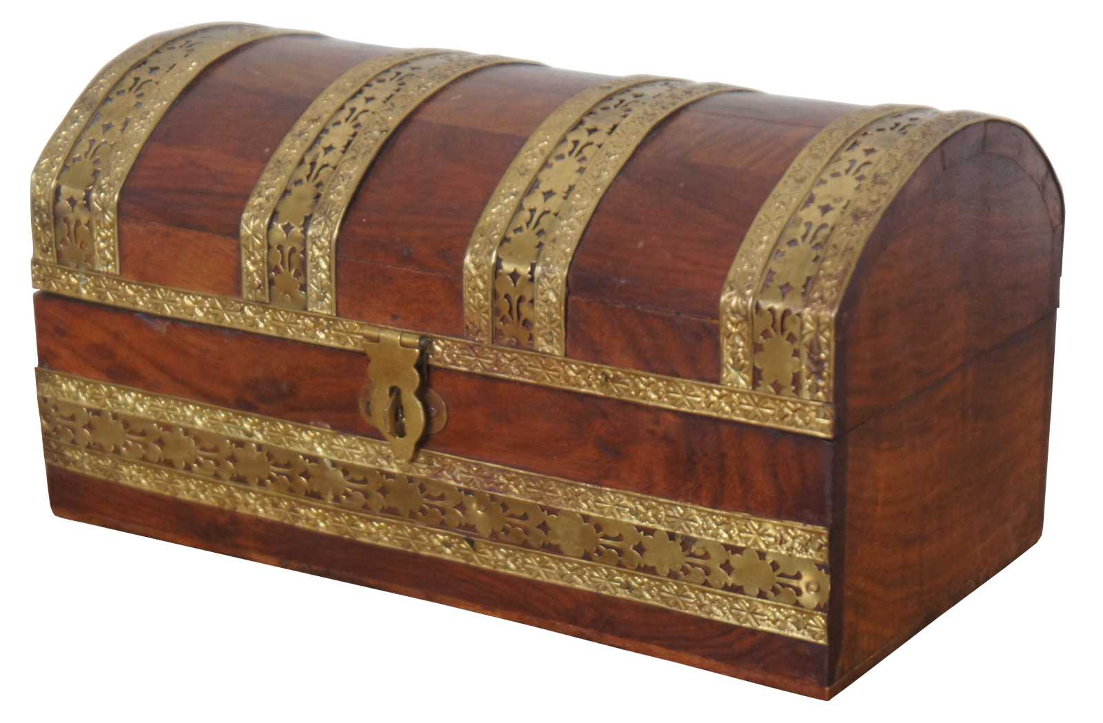 Antique dome top wooden trinket box or tea caddy with ornate floral brass banding.
