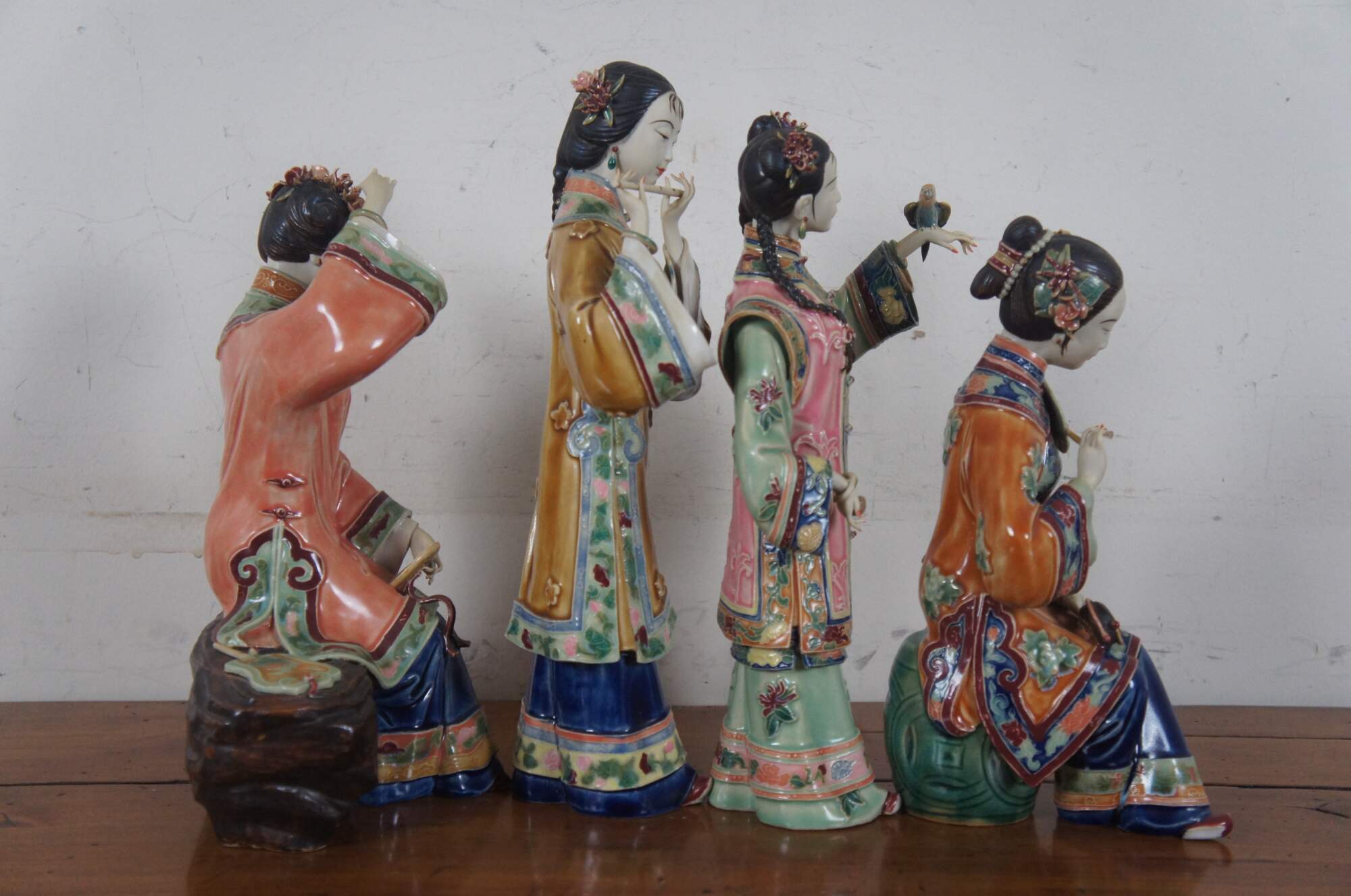 Set of four vintage Shiwan / Shi Wan / Shinwa signed Chinese ceramic maiden figurines in a variety of outfits and cultural styles from Imperial China, with delicate details and beautifully colored glazes. “China has a long history of ceramic production dating back over 3,000 years. The most famous Chinese ceramic town is Shiwan. It accounts for approximately 40% of China's ceramic production and around 25% of the world's capacity.
