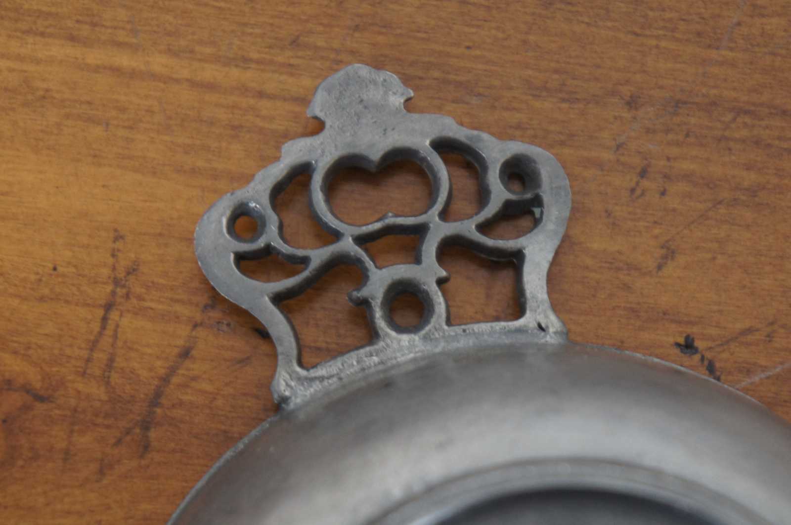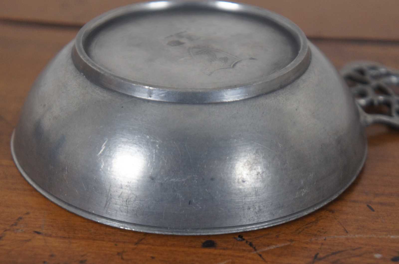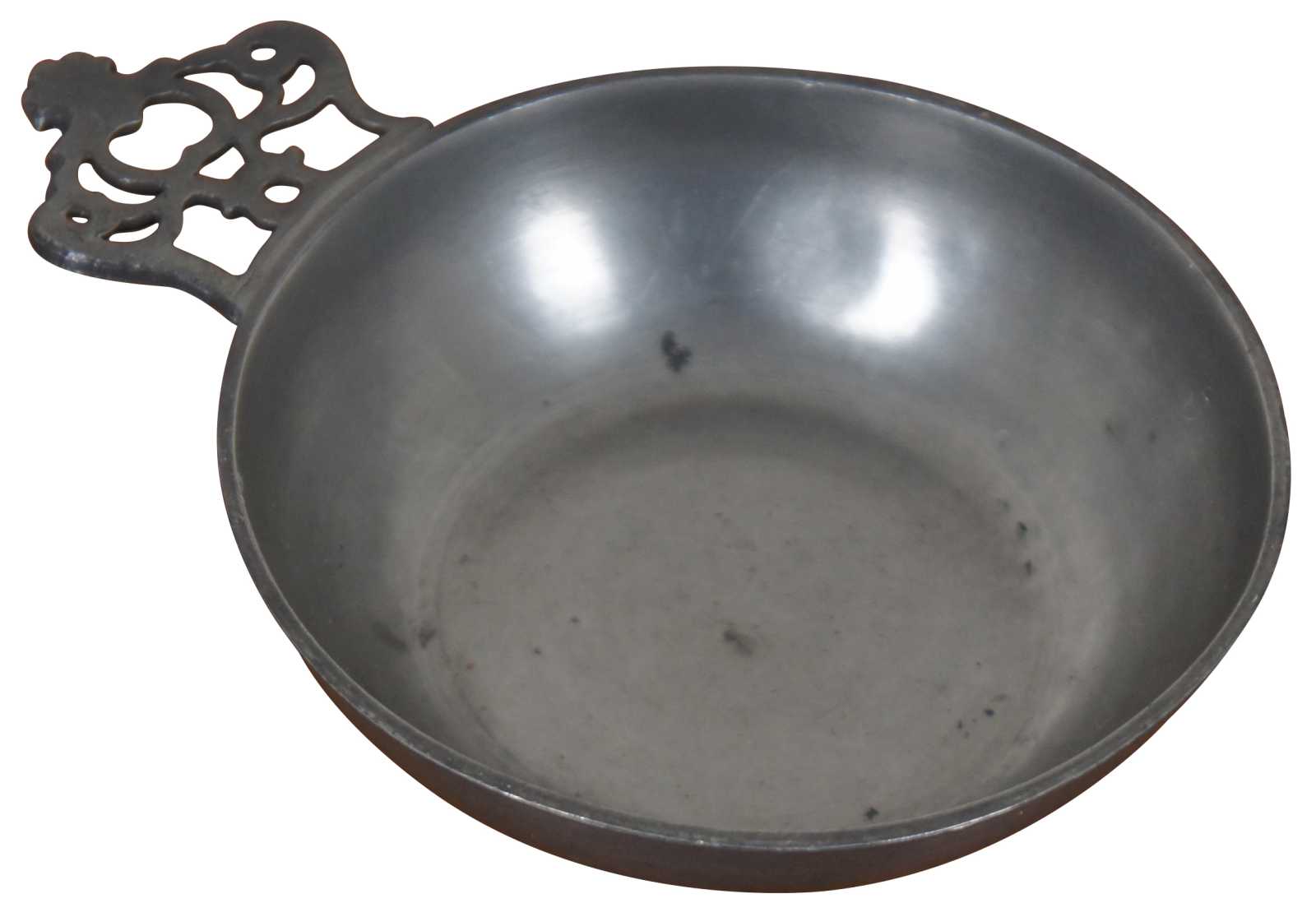Late 18th Century Antique English Georgian pewter porringer soup or stew bowl, dish or cup with crown handle / ear by William Wright of Little Minories, London, England. Wright was elected to the London Guild in 1764.
