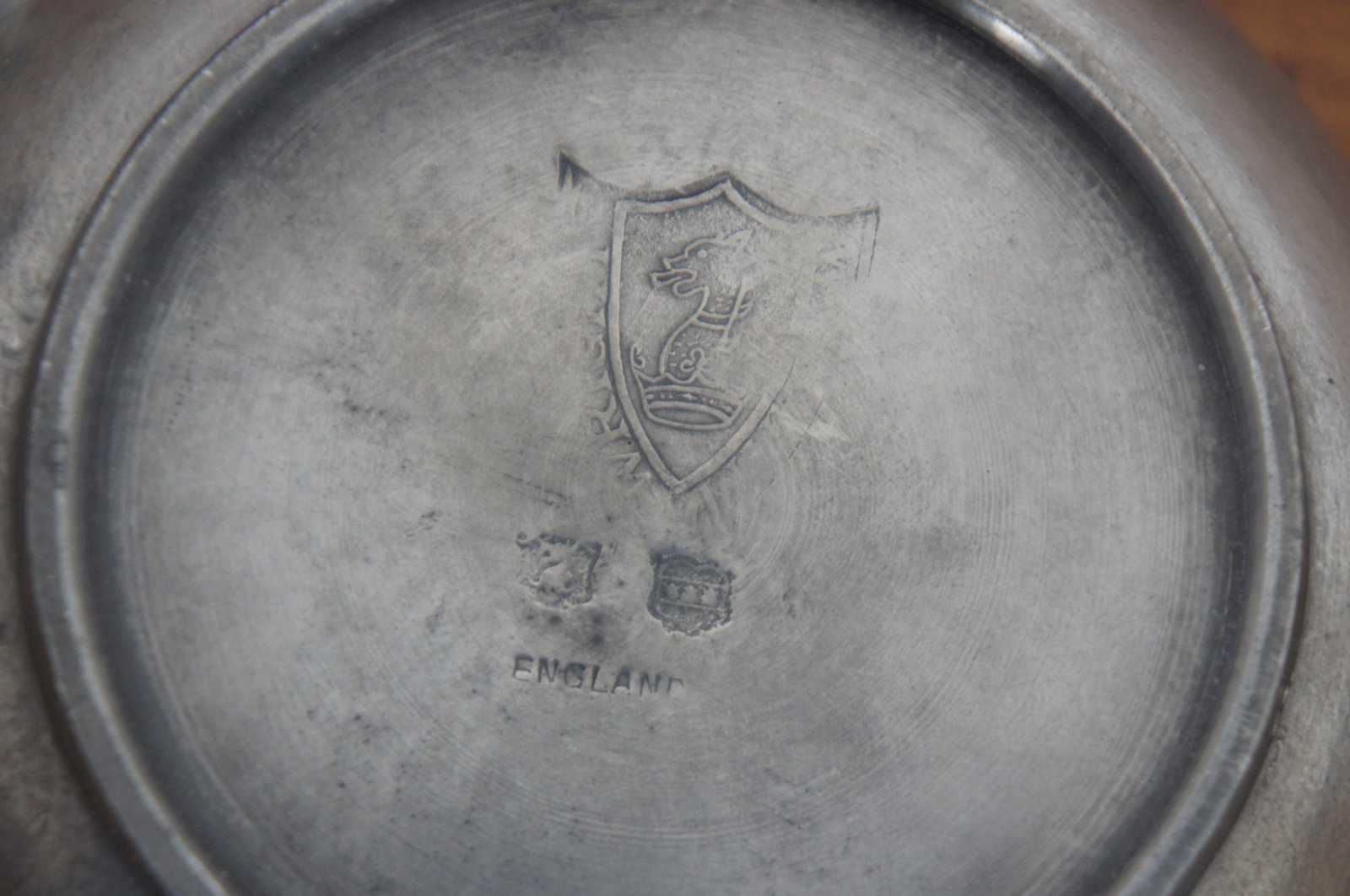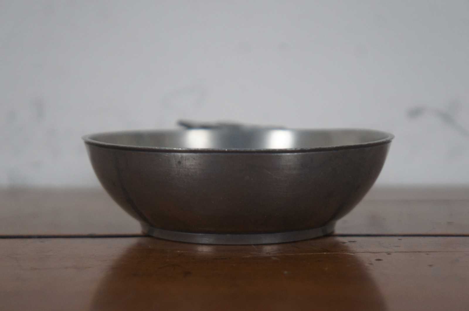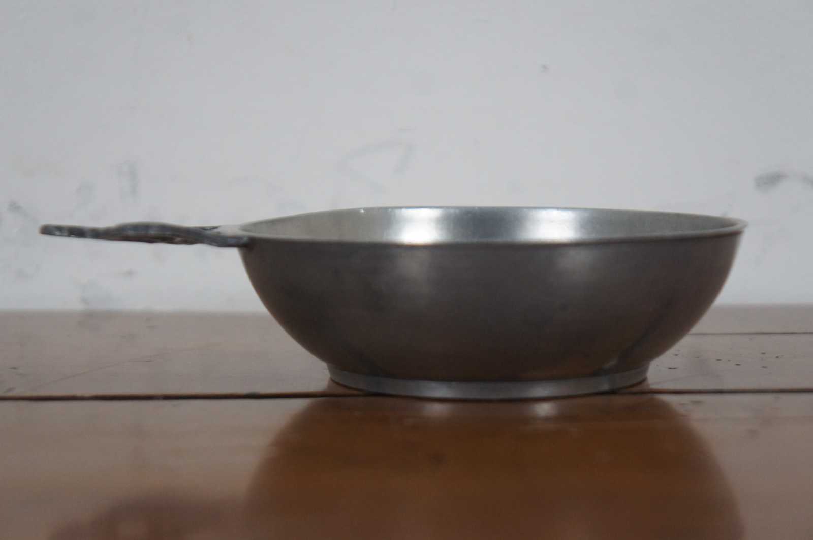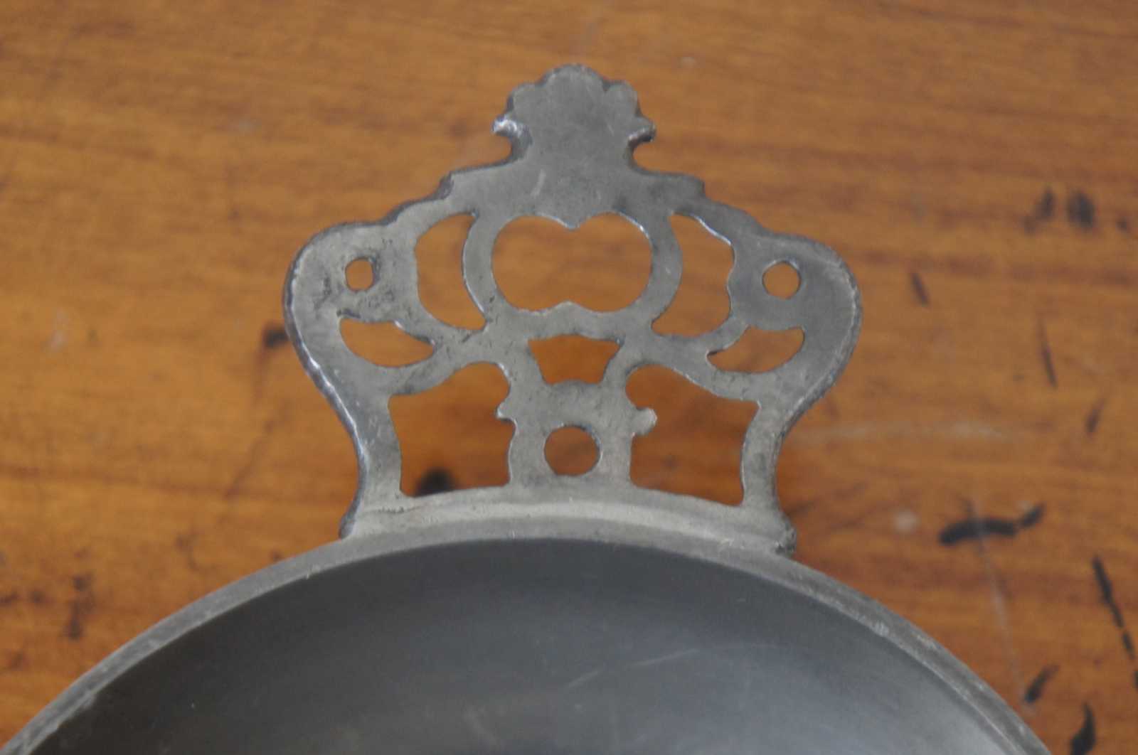 Late 18th Century Antique English Georgian pewter porringer soup or stew bowl, dish or cup with crown handle / ear by William Wright of Little Minories, London, England. Wright was elected to the London Guild in 1764.