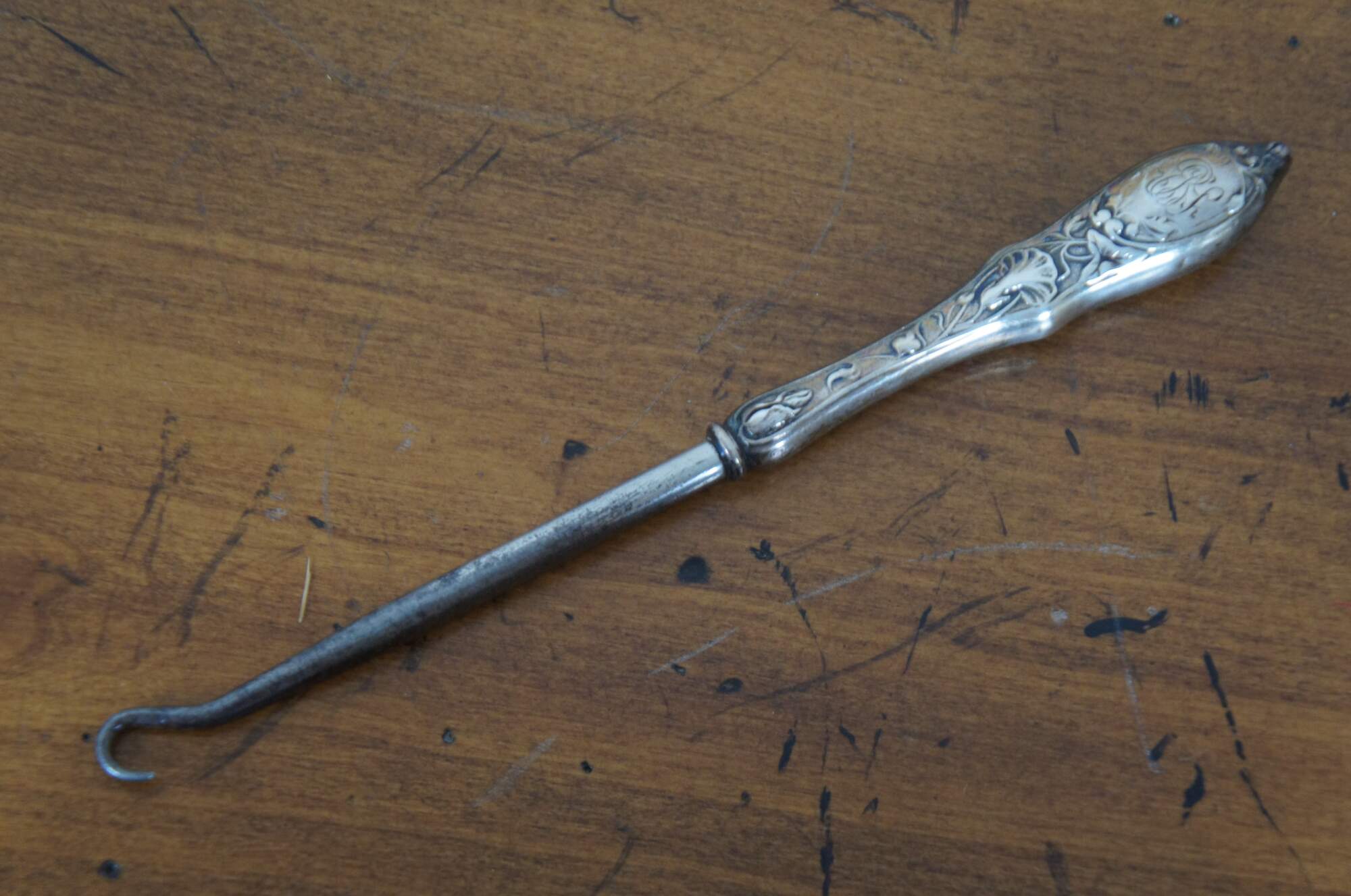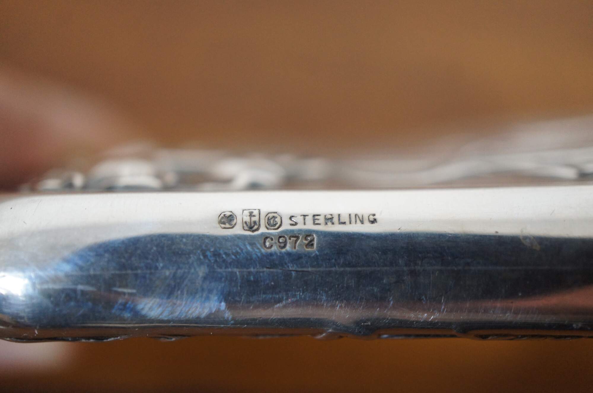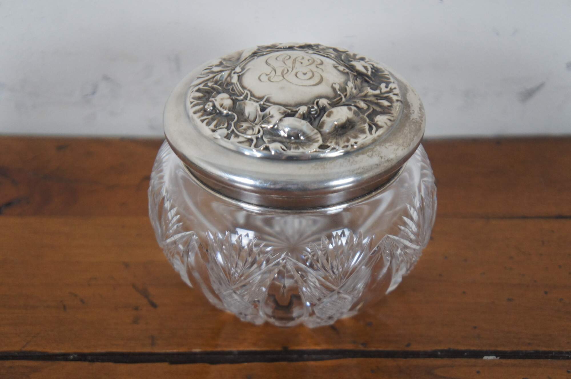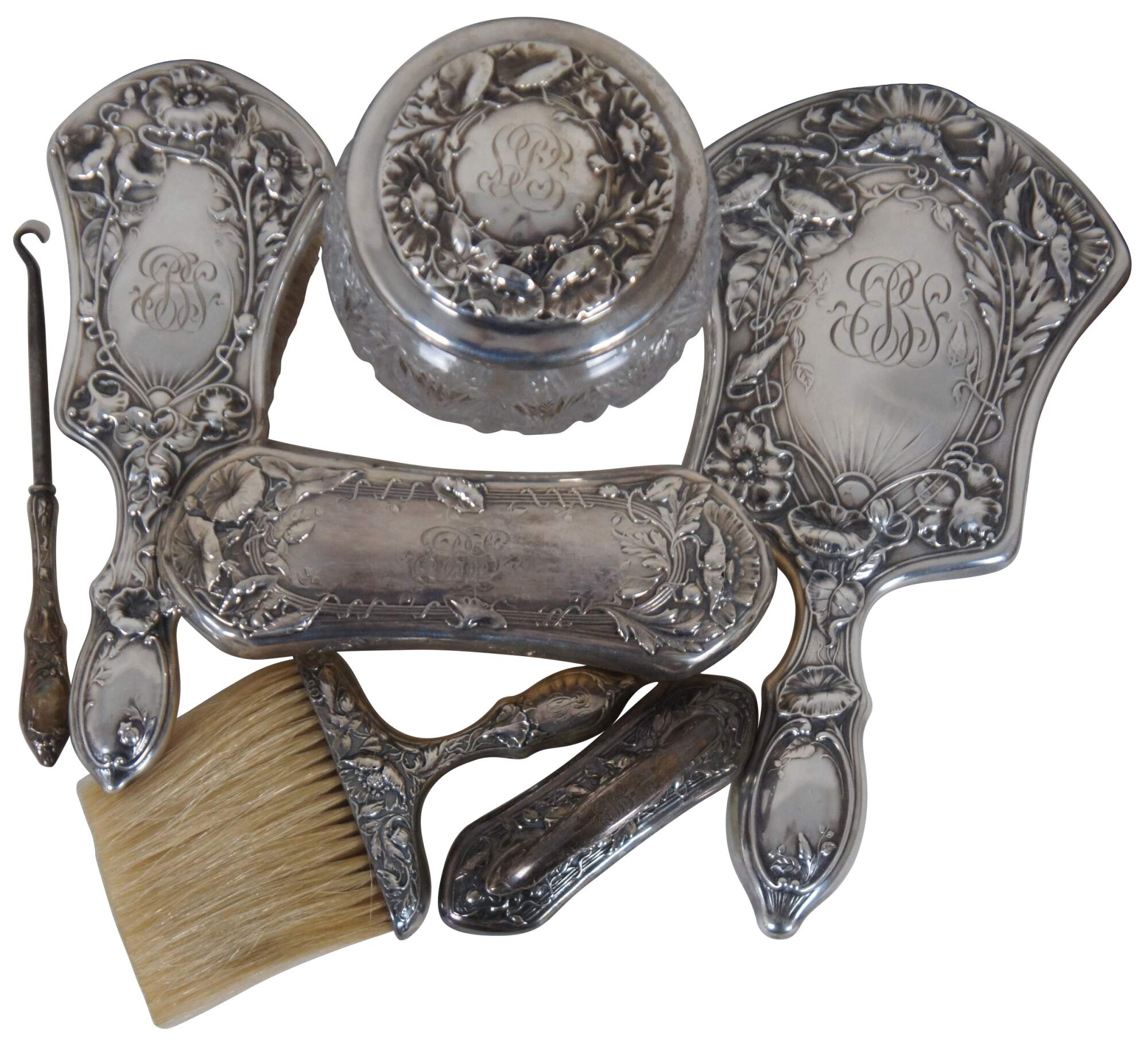 Antique seven piece Gorham sterling silver number C972 vanity and grooming set decorated with art nouveau style morning glories, engraved with the initials “ERS.” Set includes a cut crystal vanity jar with lid, hand mirror, hair brush, clothes brush, button hook, nail buffer, and hat brush.