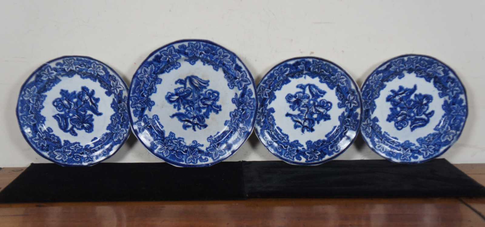 Twelve pieces of antique flow blue porcelain circa 1845 by George Phillips of Longport, Staffordshire, England in the Lobelia pattern. Lot includes a rectangular platter, a rectangular vegetable dish, one soup plate/bowl, one salad plate, three bread plates, two custard dishes, two teacups and one demitasse cup.