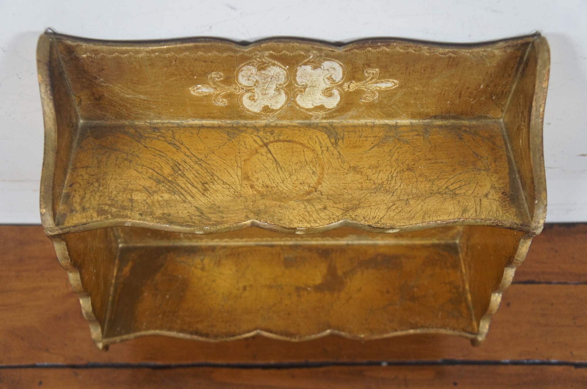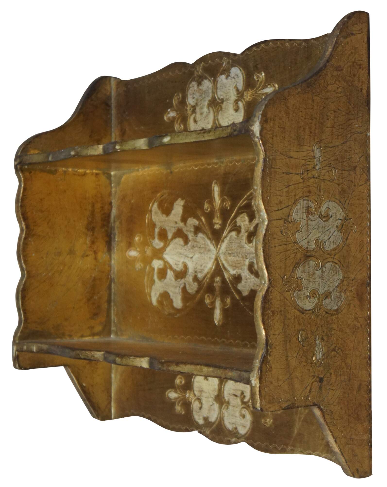 Vintage mid century gilt wood two tier wall shelf with designs accented in white, hand made in Italy by Florentia.
