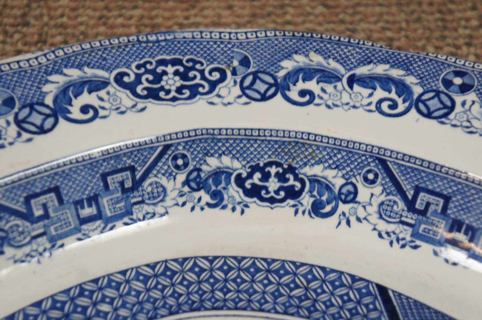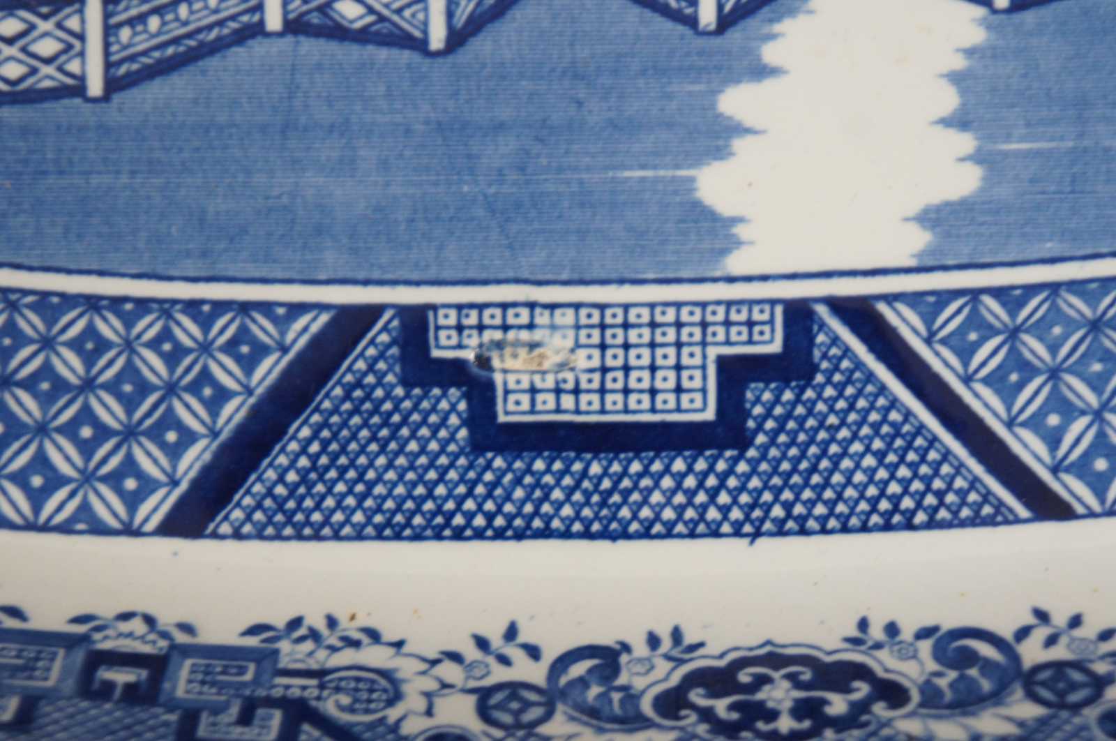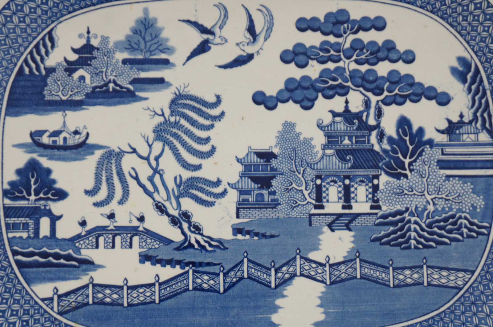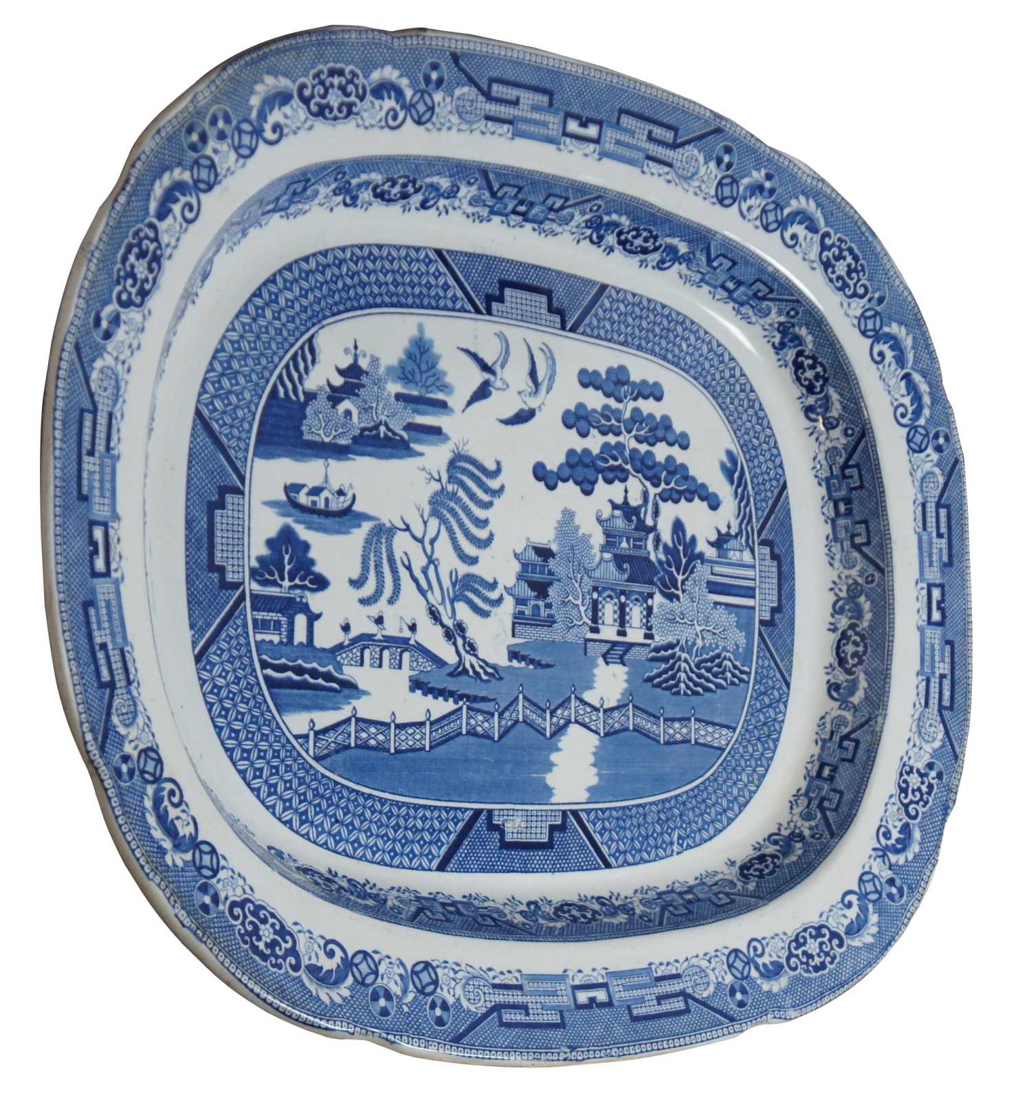 Massive antique blue willow porcelain serving platter with slightly squared off corners and impressed anchor mark on reverse. The traditional Blue Willow Chinoiserie design features scenes with willows, trees, boats, pavilions / pagodas, figures and birds.
