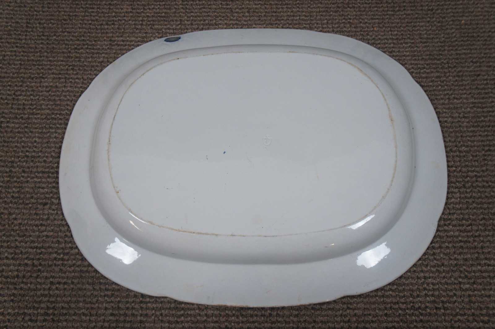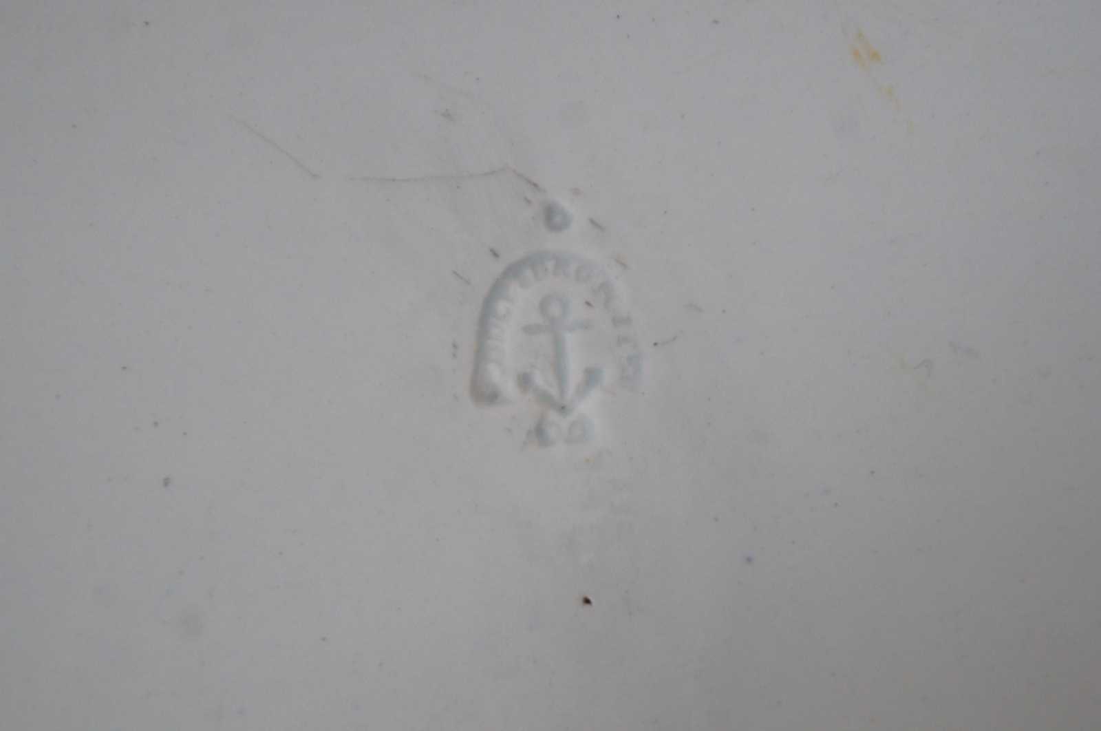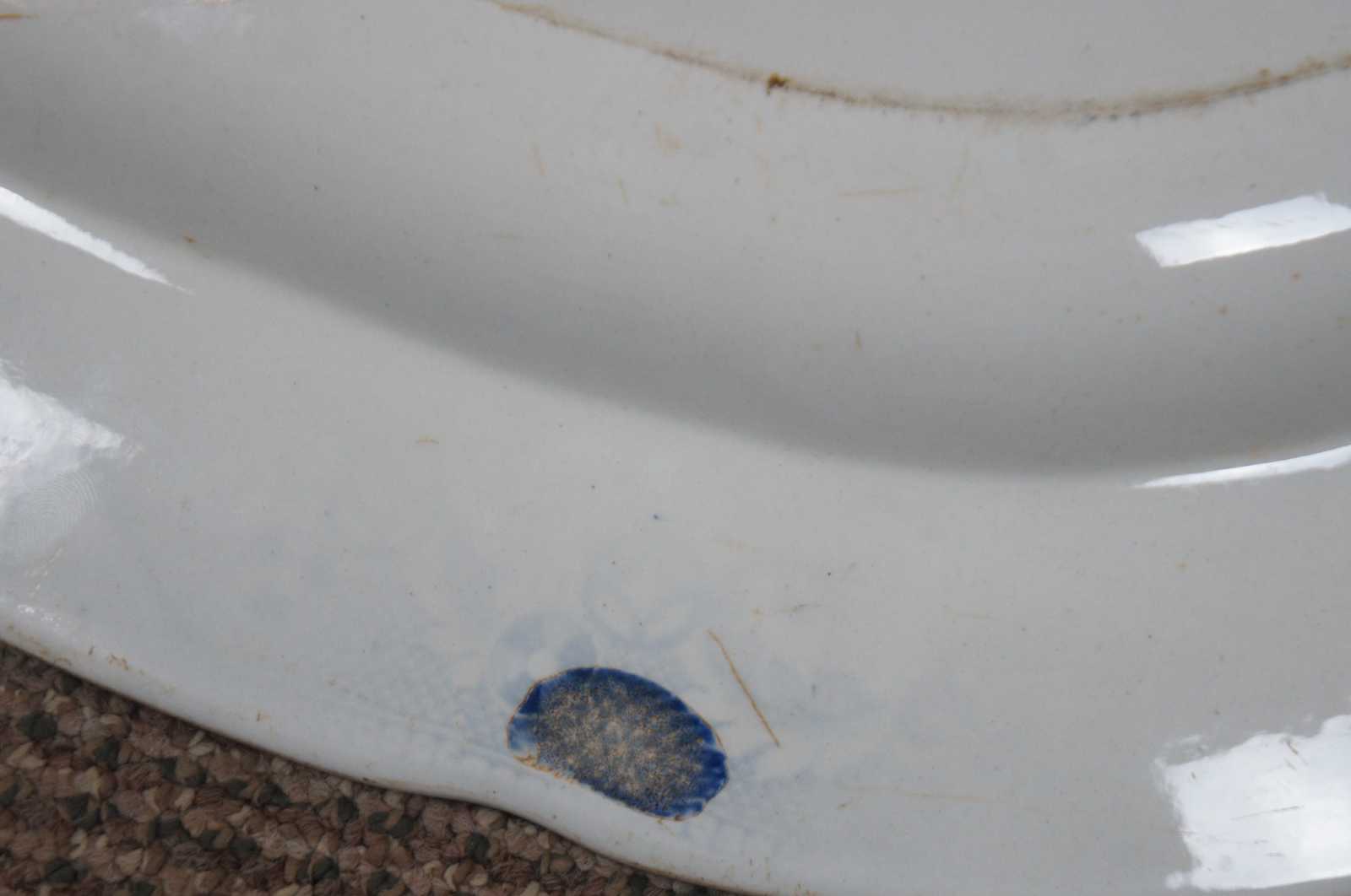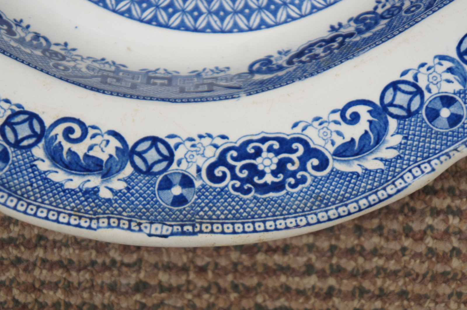 Massive antique blue willow porcelain serving platter with slightly squared off corners and impressed anchor mark on reverse. The traditional Blue Willow Chinoiserie design features scenes with willows, trees, boats, pavilions / pagodas, figures and birds.