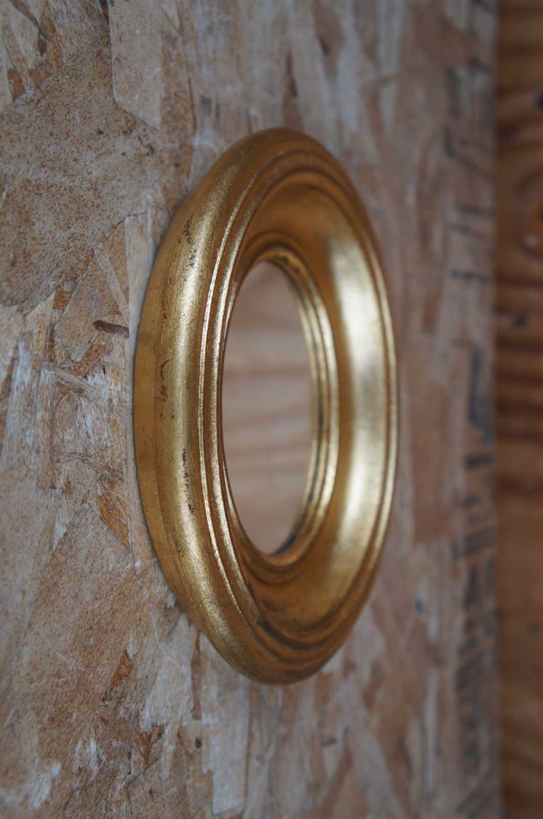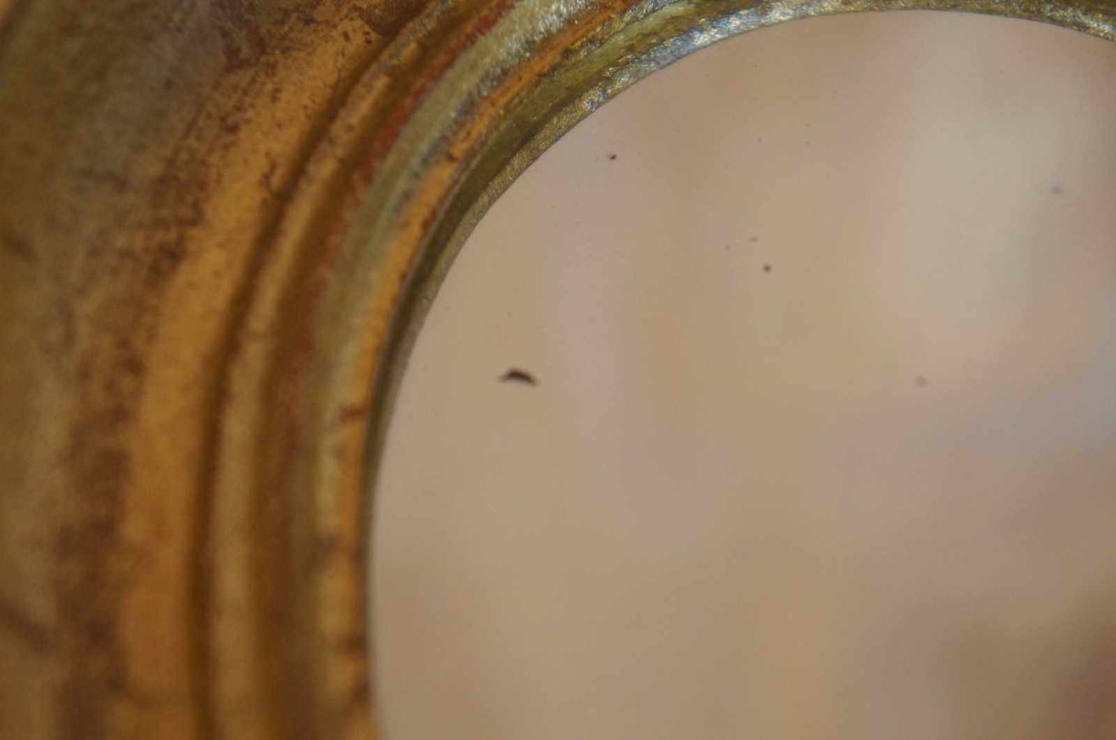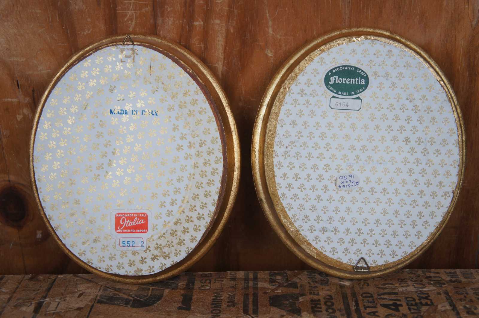 Pair of two mid century Hollywood Regency style Italian Florentine gold gilt mirror frames featuring oval form with beveled frame. Marked Italy, Italia, decorative craft, Florentia.