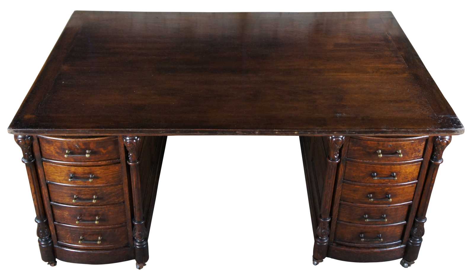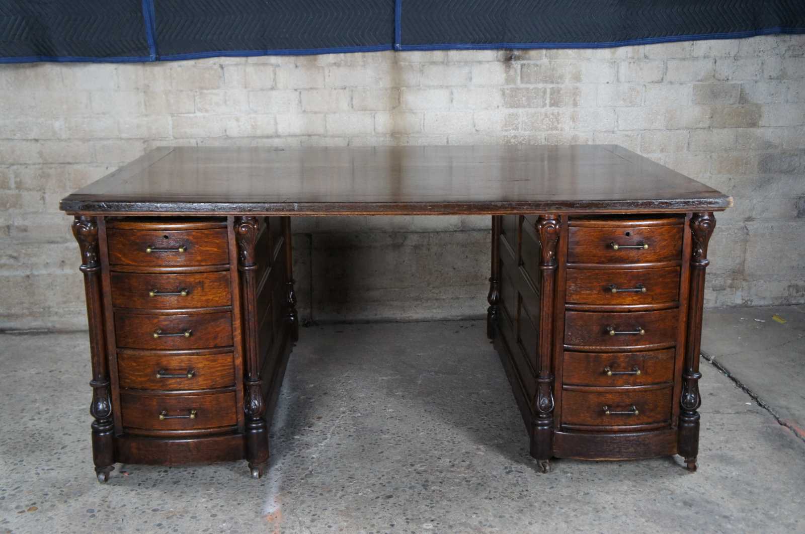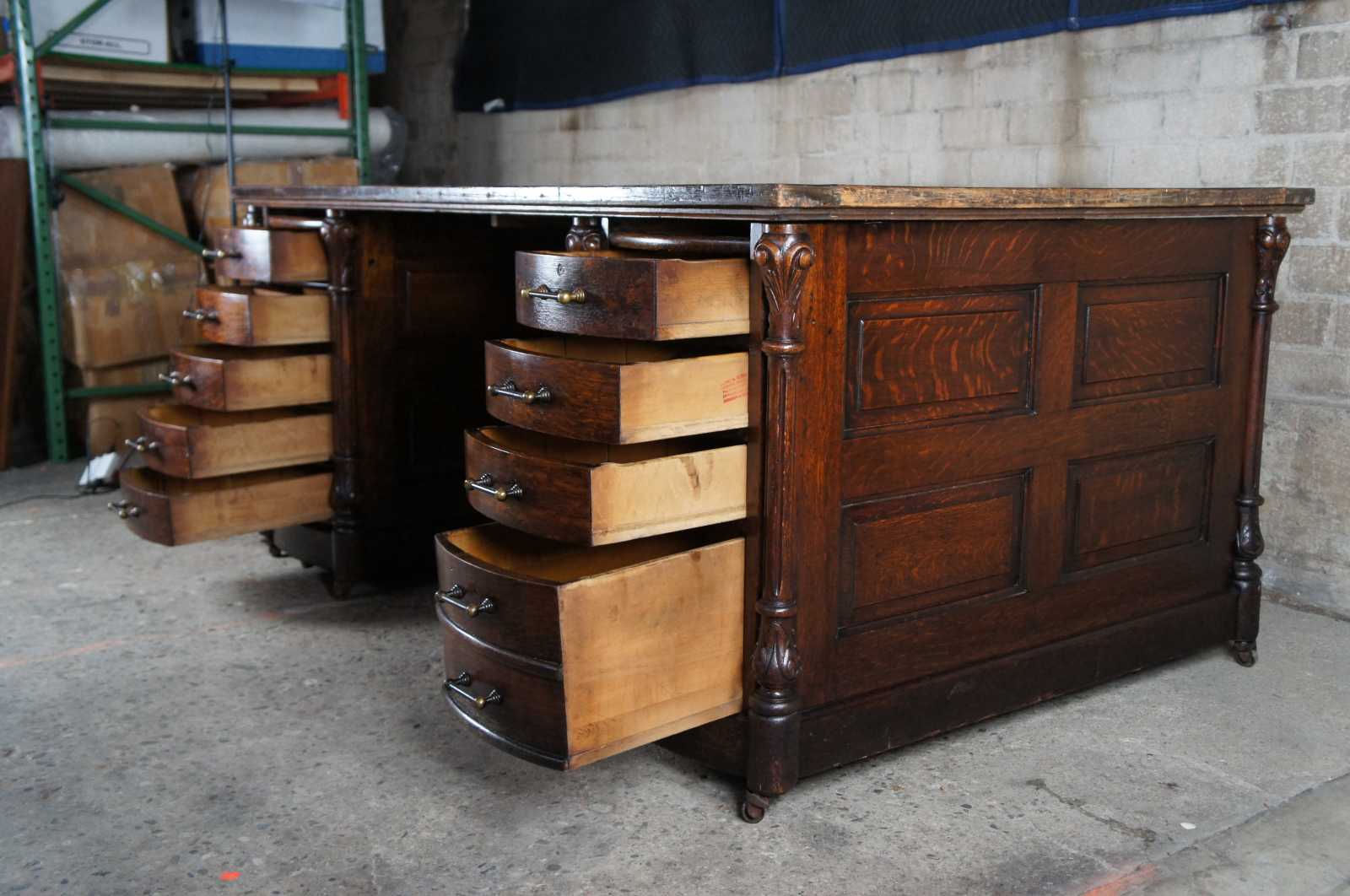 Monumental 19th century antique English partners desk. Made of quartersawn oak featuring 18 drawers with paneled sides, turned and fluted columns and large inner area for leg space.