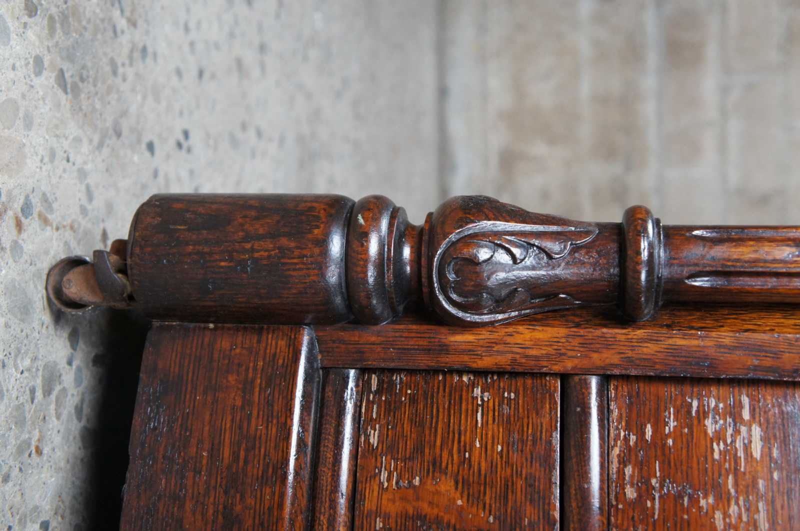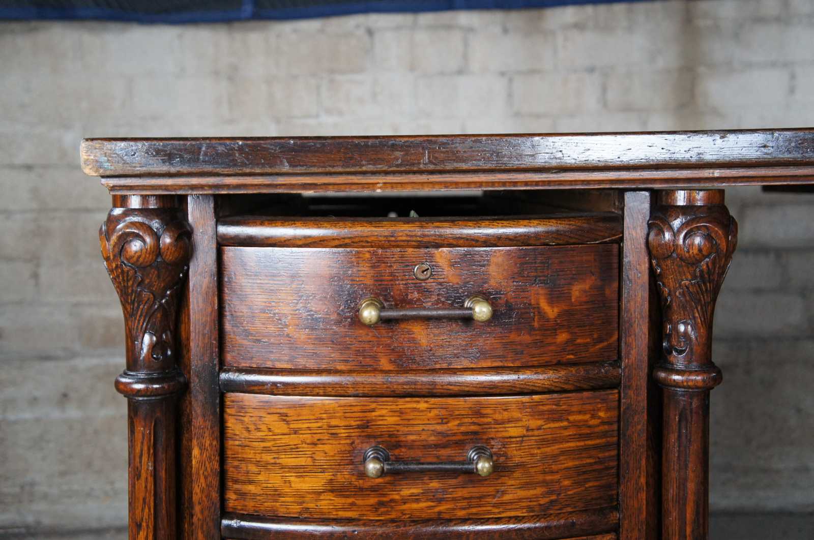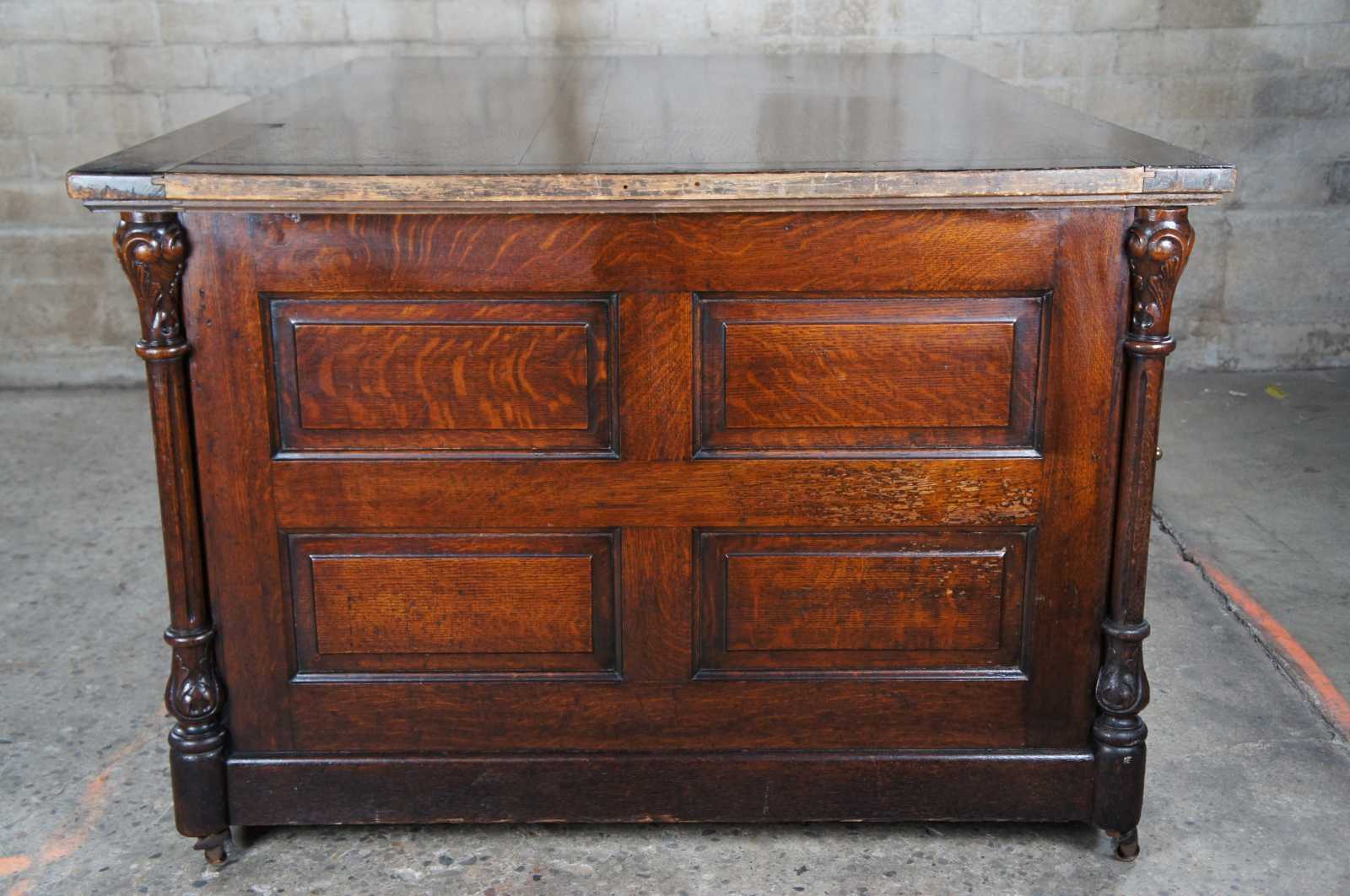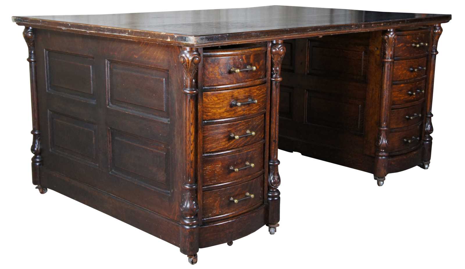 Monumental 19th century antique English partners desk. Made of quartersawn oak featuring 18 drawers with paneled sides, turned and fluted columns and large inner area for leg space.