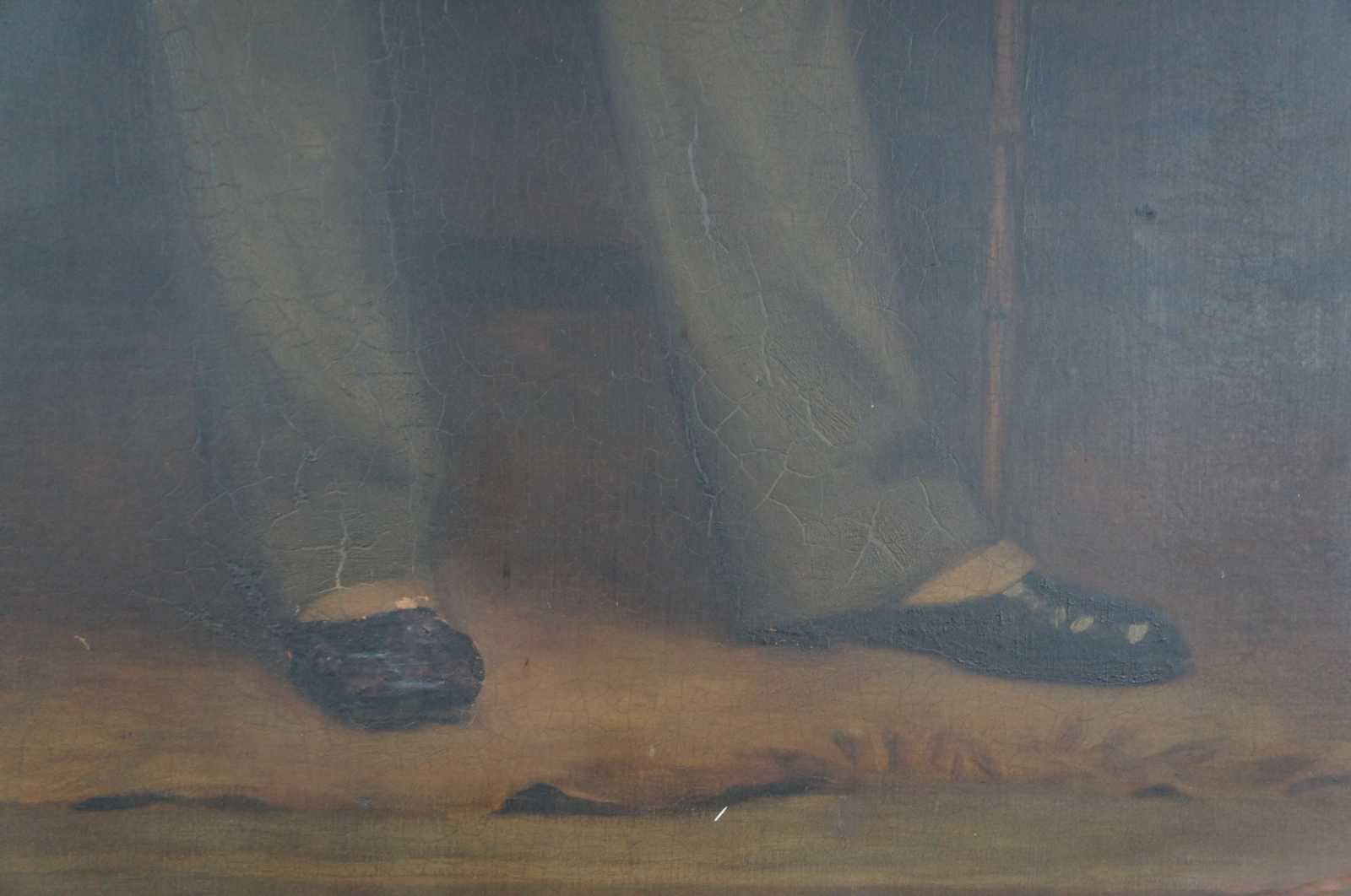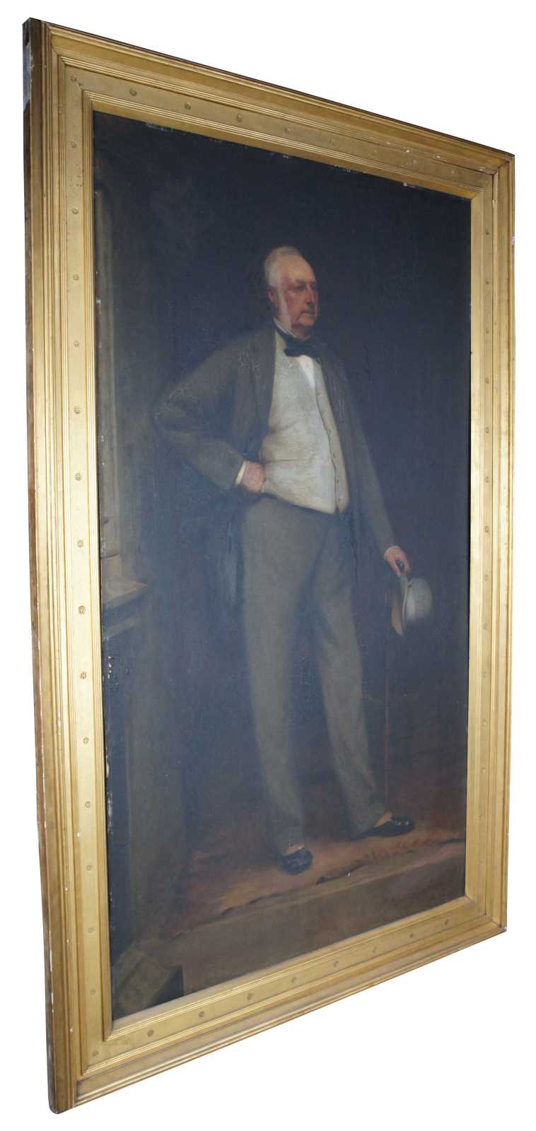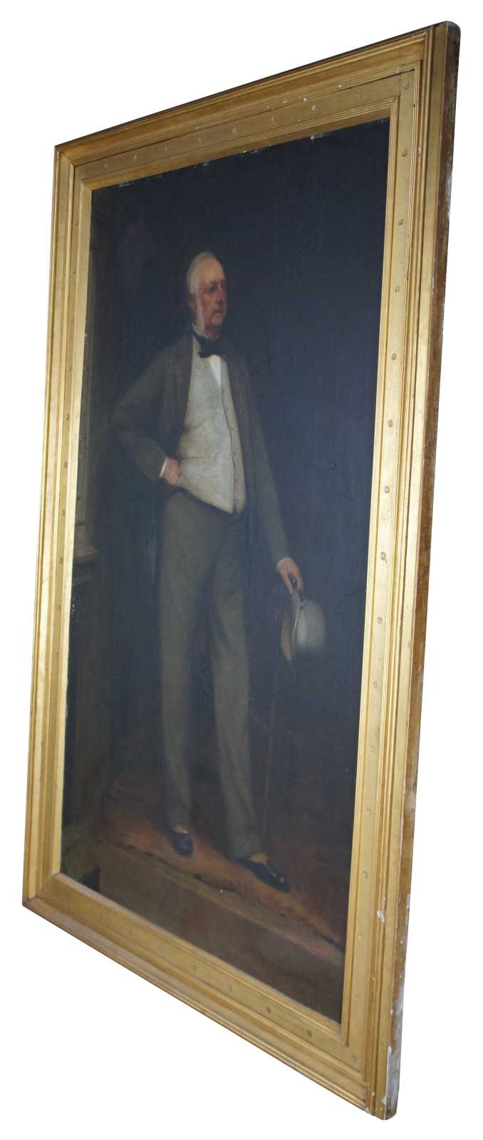 Monumental antique 1890 oil painting on canvas of Robert Heath (1816-1893) by Hugh de Twenebrokes Glazebrook (1855-1937). Painted a few years before Heath's death featuring a full length portrait of him dressed in formal attire with hat, cane and mutton chops. Displayed in gold gilt frame by Chapman Bros Carvers, Gilders, & Frame Makers of London England.