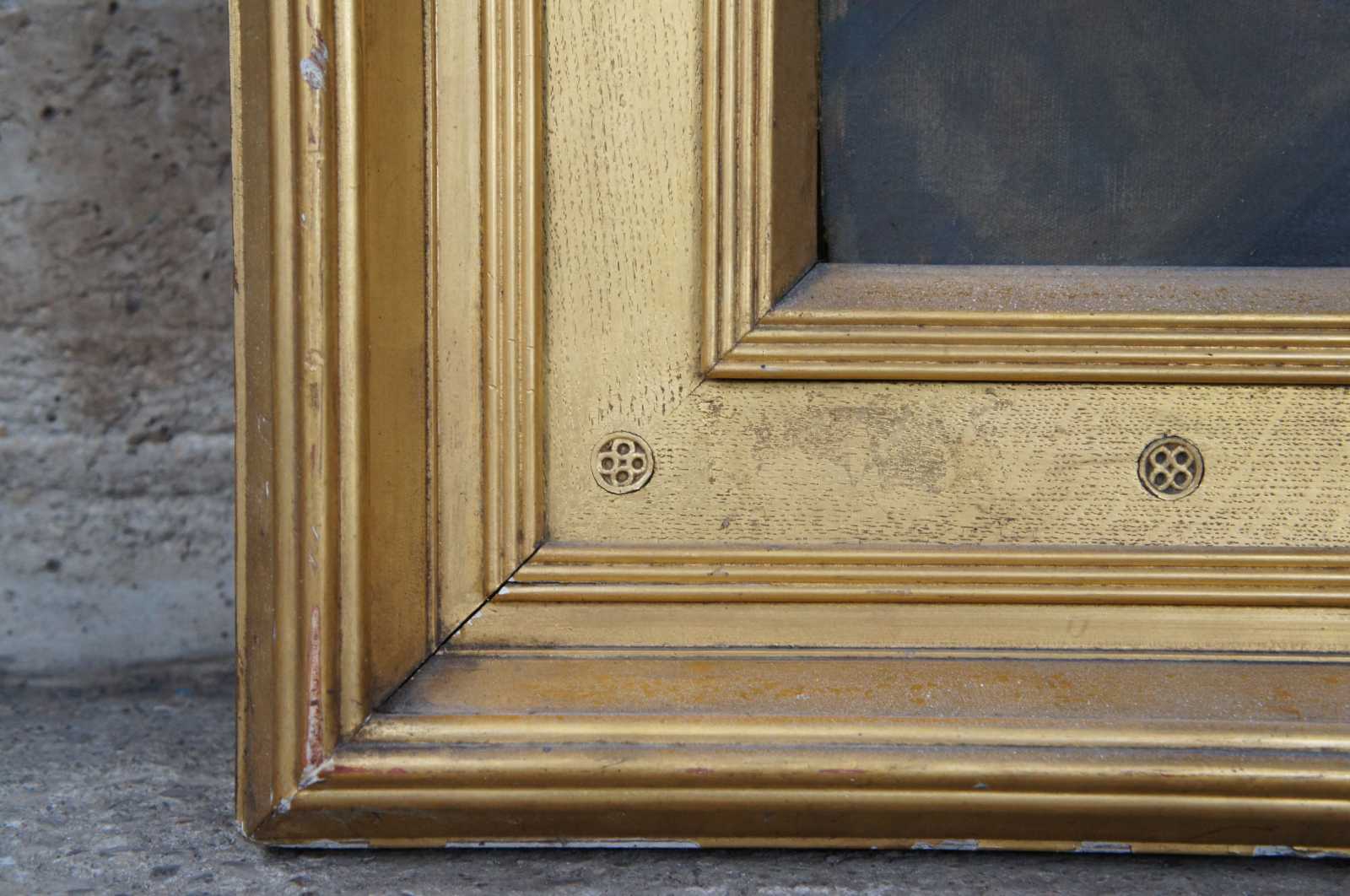 Good Overall condition, wear and distressing commensurate with age and use. Some paint loss, crazing and past repairs to canvas. Canvas applied to board. Wear to frame.