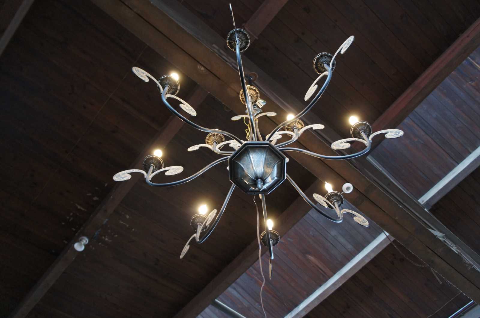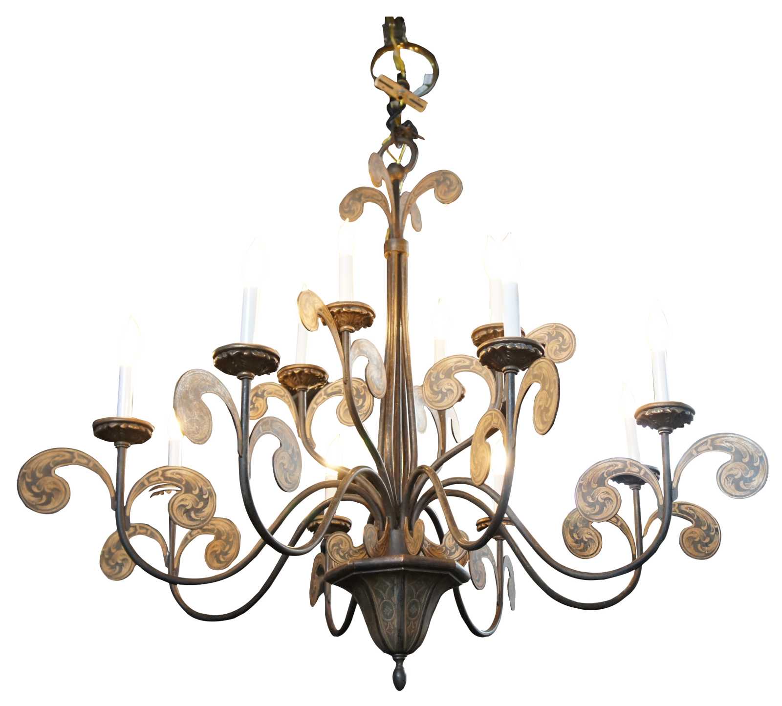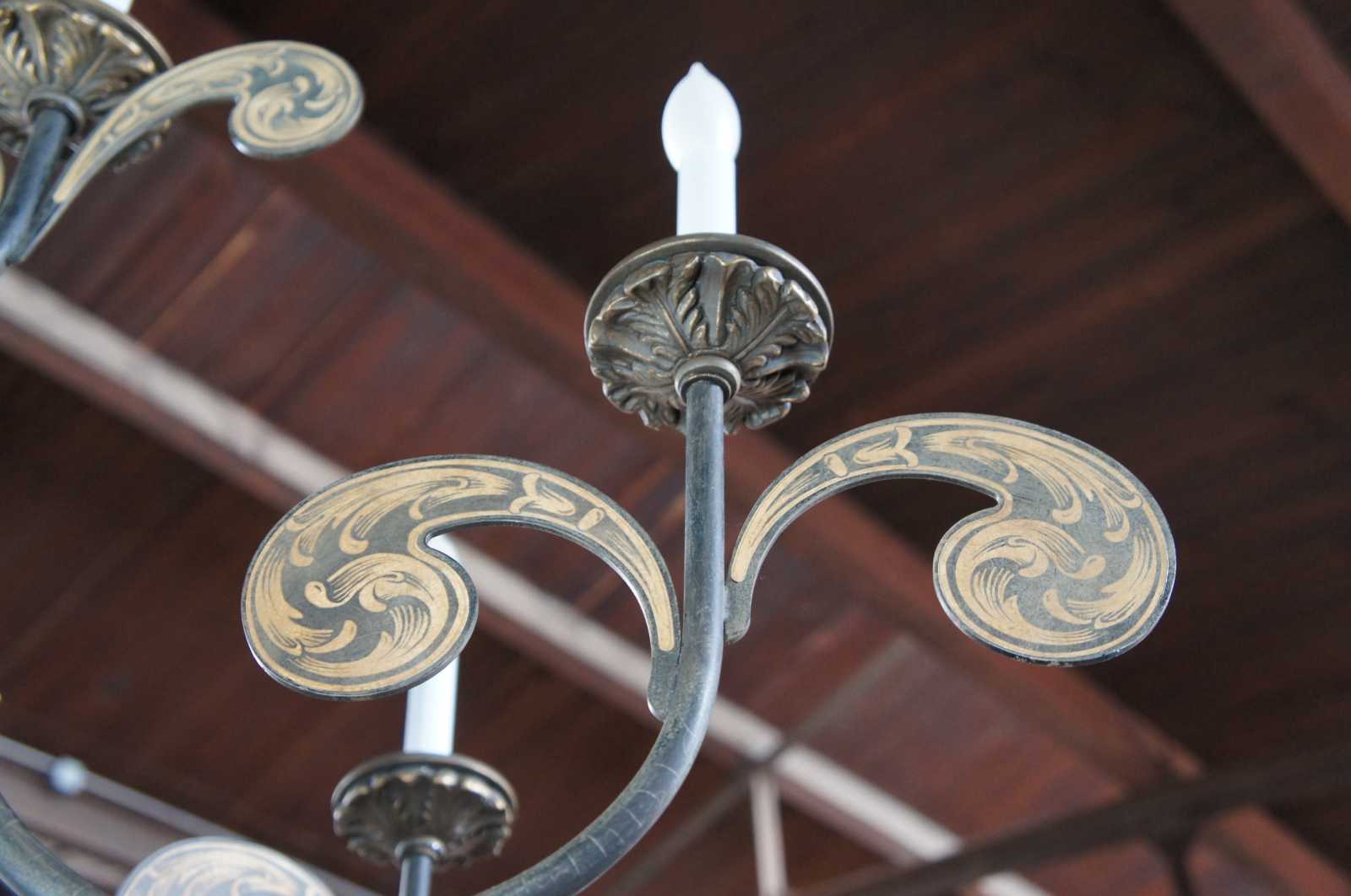 Two-tier chandelier with Antiqued medieval acathus leaf pattern in timeworn tea-stain and ebony.