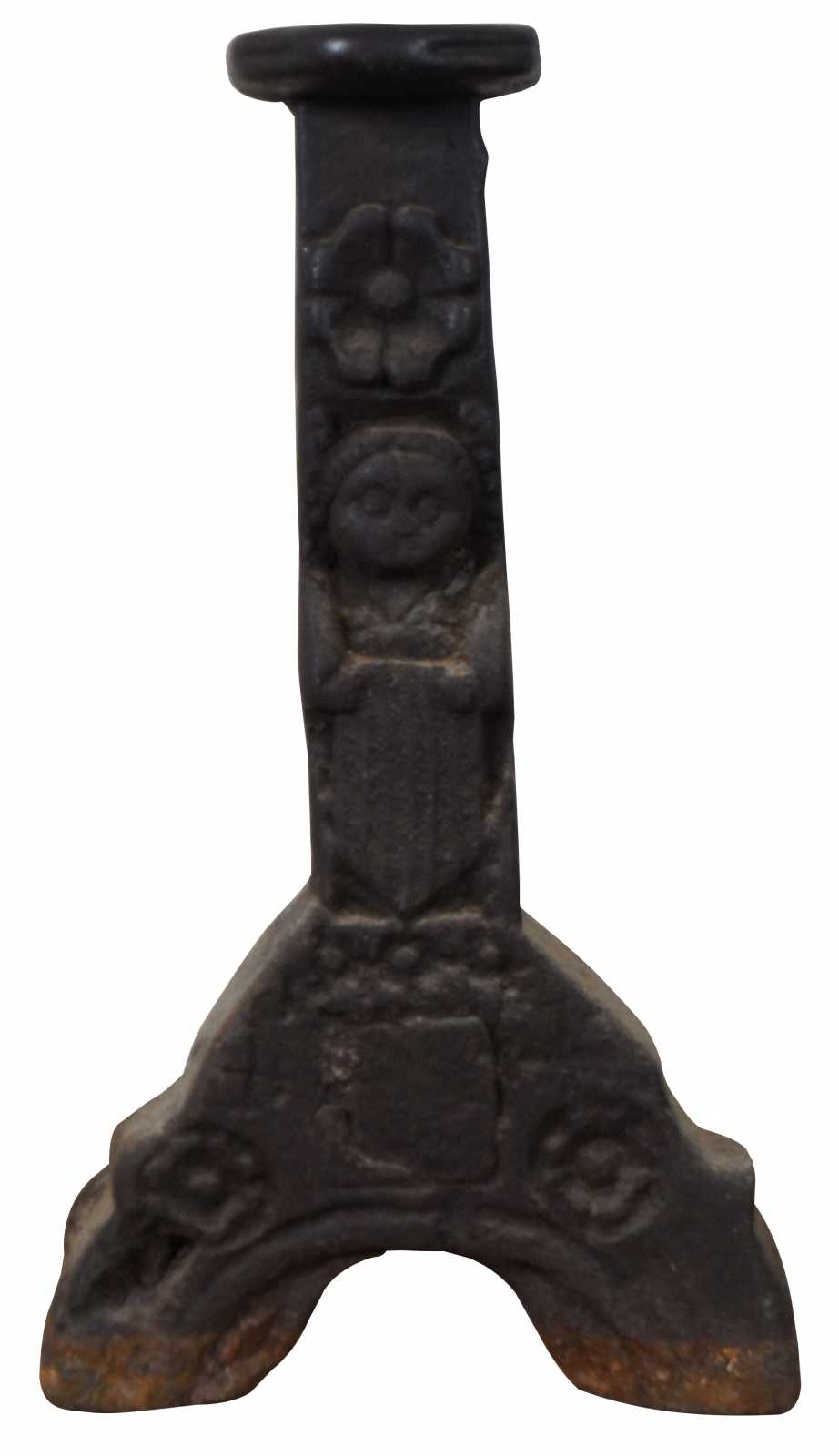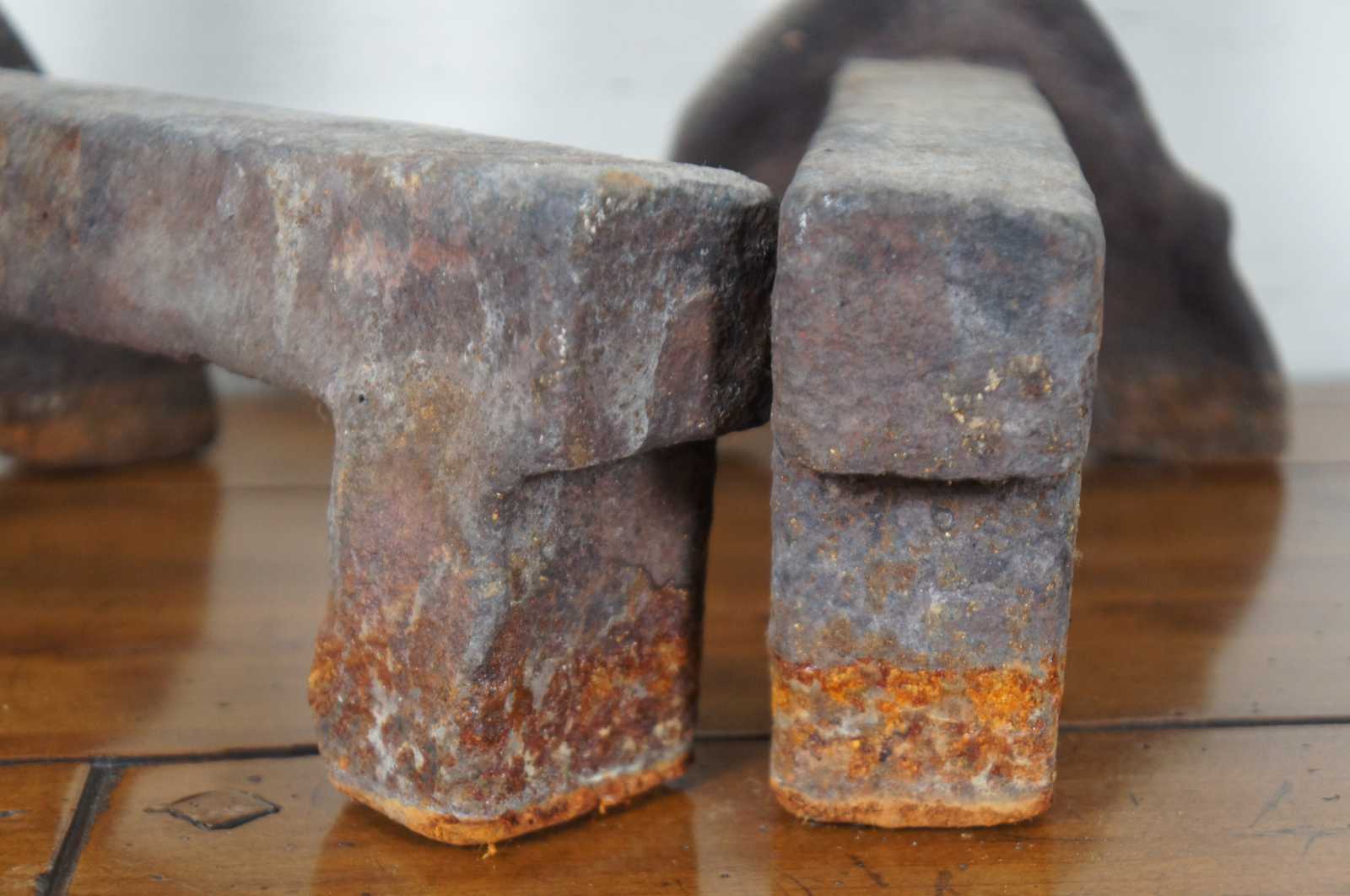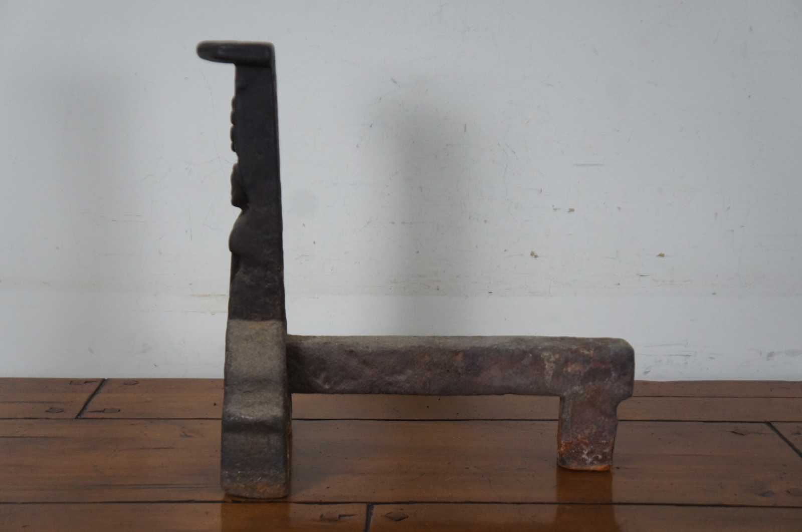 Pair of rare antique French 16th century forged iron andirons / chenets / fire dogs featuring a very heavy gothic form decorated with heraldic flowers / roses and figures holding shields. Made in France, circa 1500s