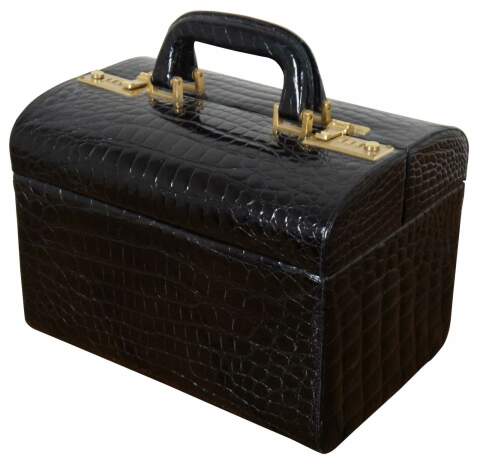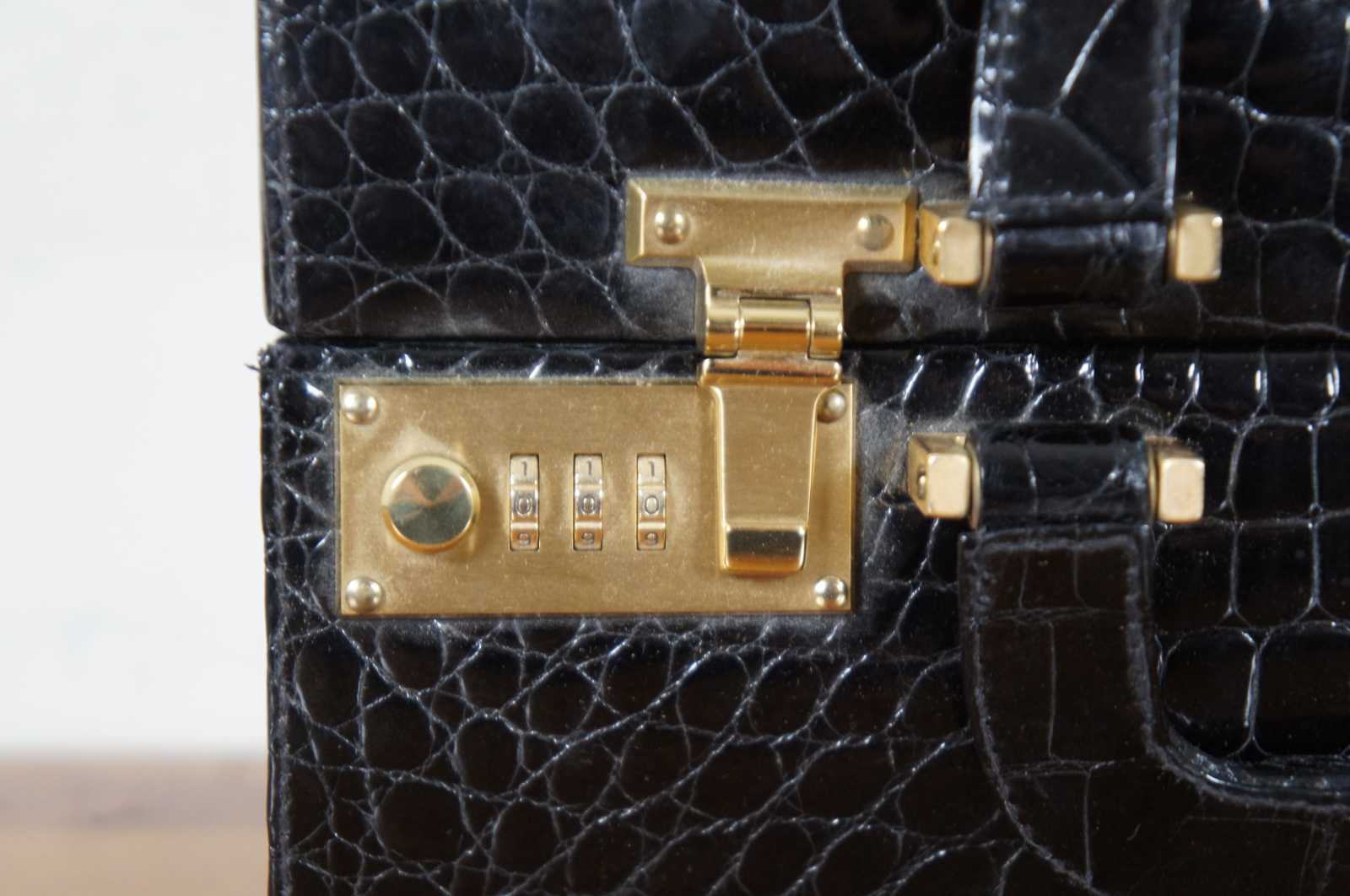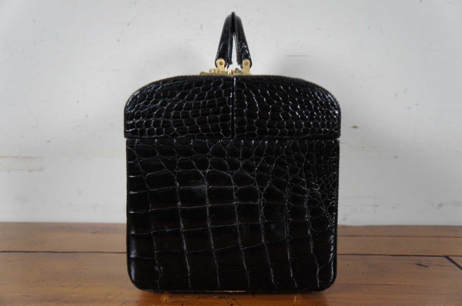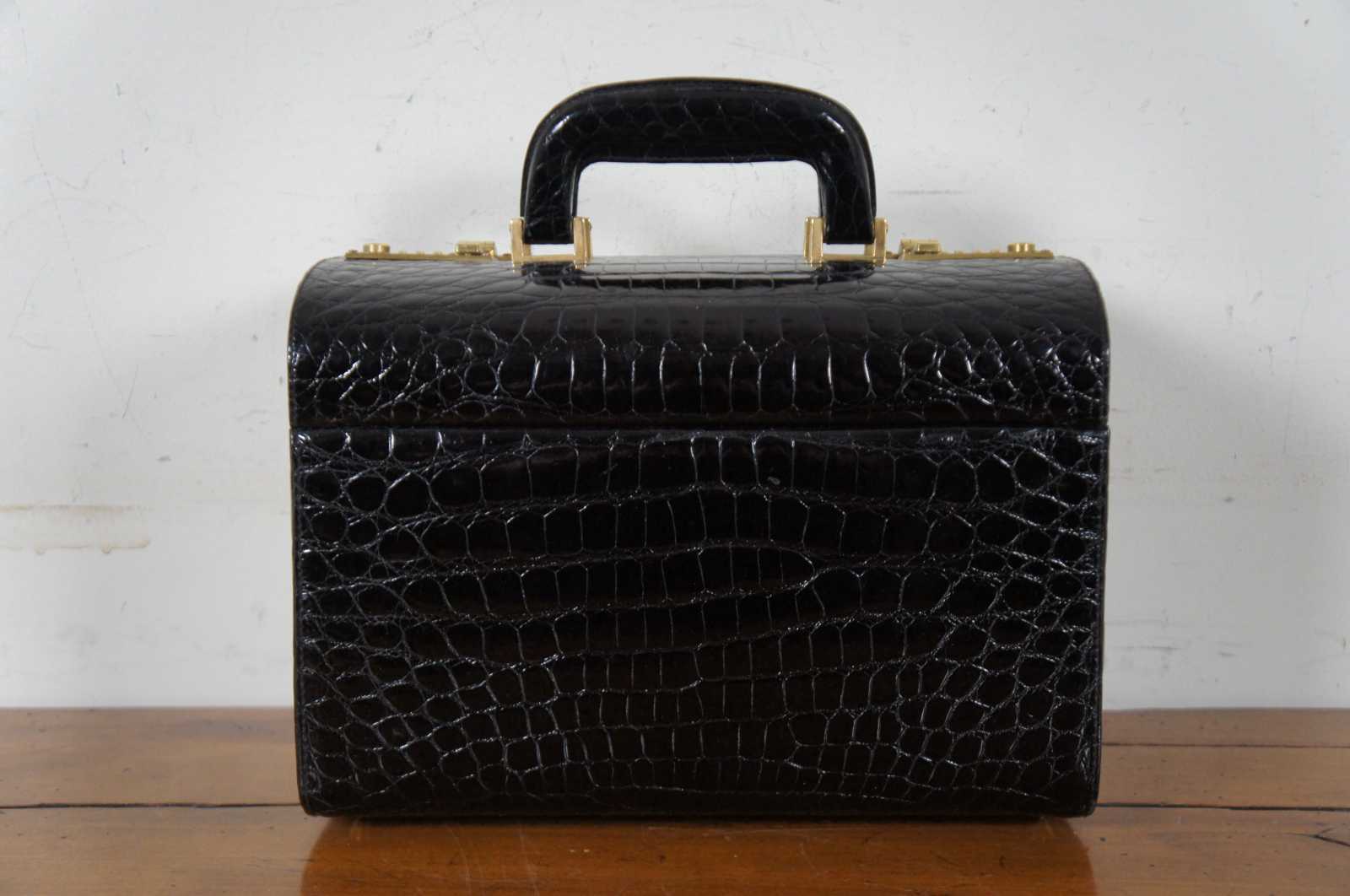 Rare vintage Creazioni Parapini for Antonio da Pescara, made in Italy, black alligator skin leather train, beauty / cosmetics / jewelry / doctor travel case or luggage with combination lock clasps, split center lid, and tan interior.