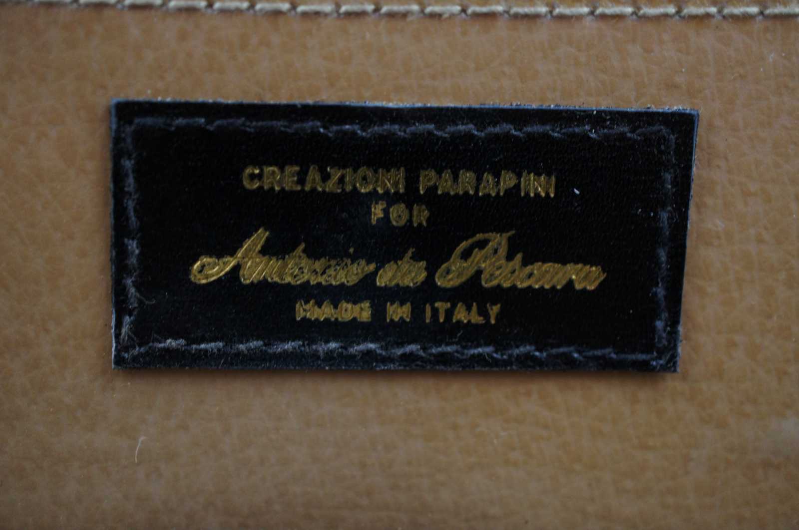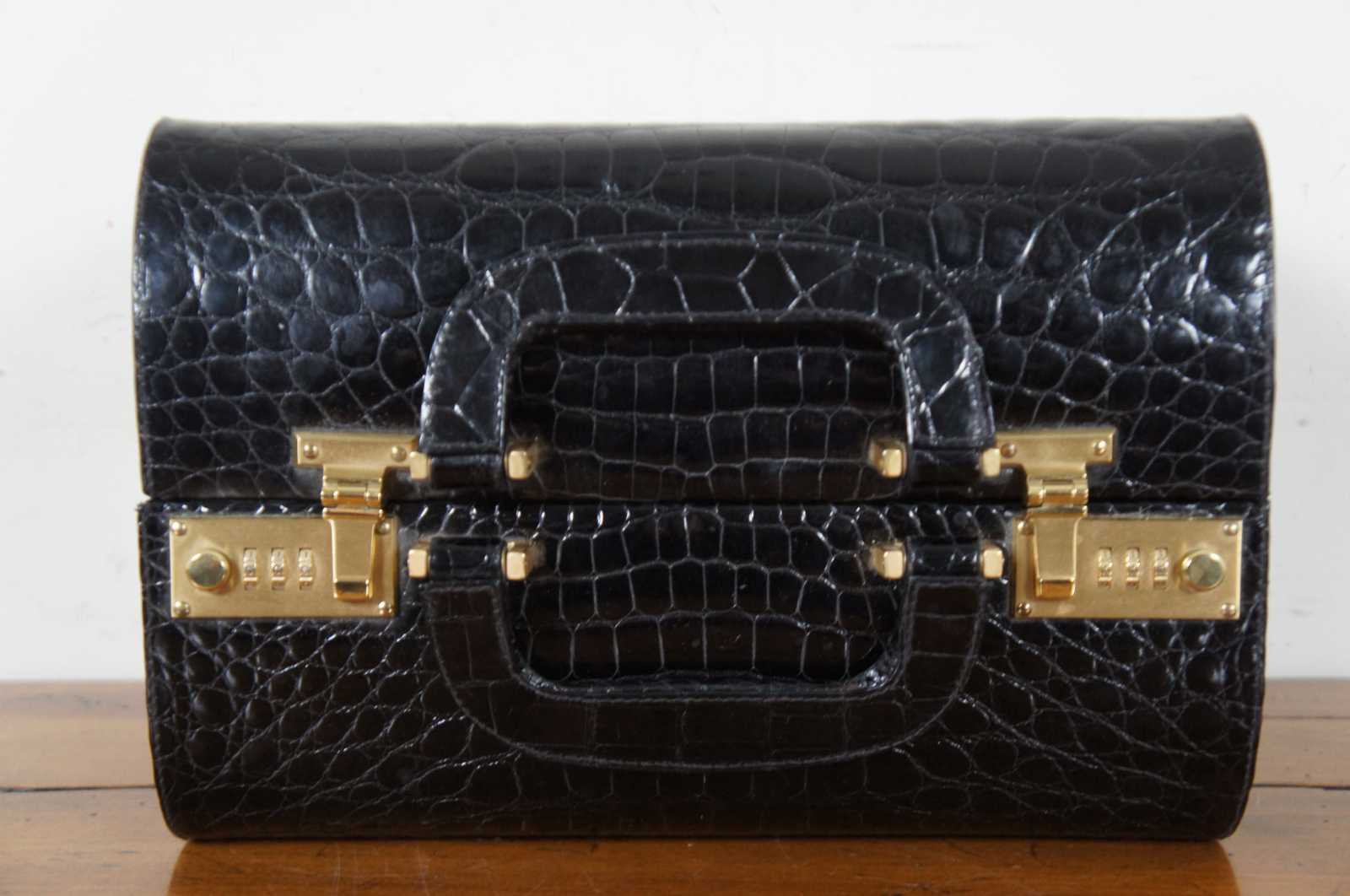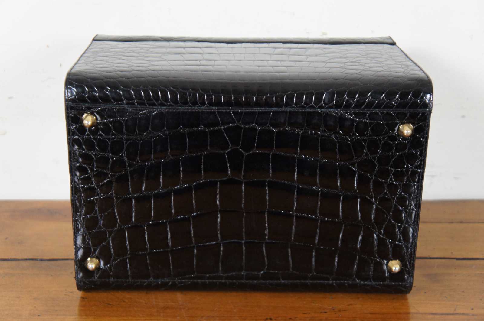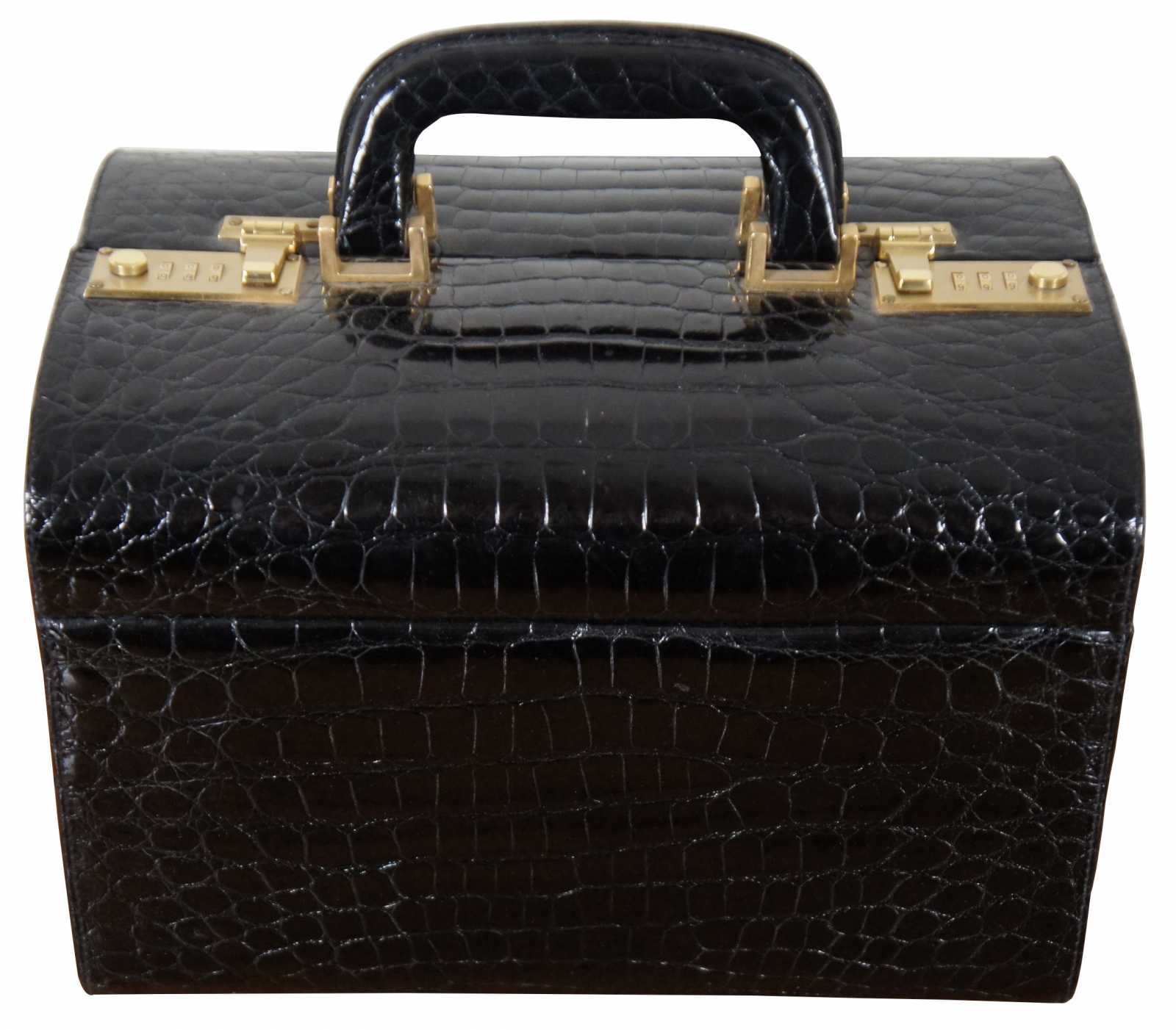 Rare vintage Creazioni Parapini for Antonio da Pescara, made in Italy, black alligator skin leather train, beauty / cosmetics / jewelry / doctor travel case or luggage with combination lock clasps, split center lid, and tan interior.