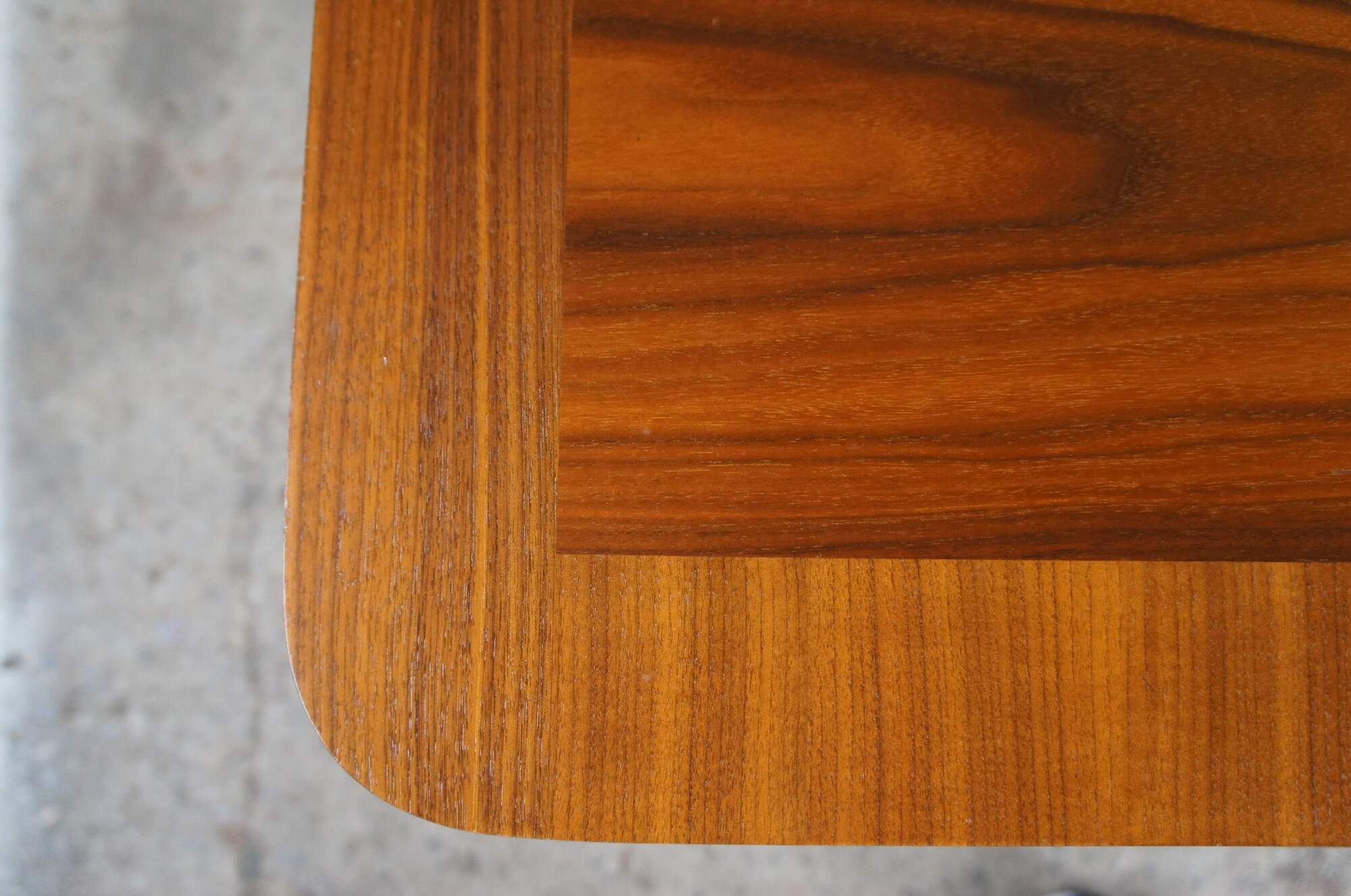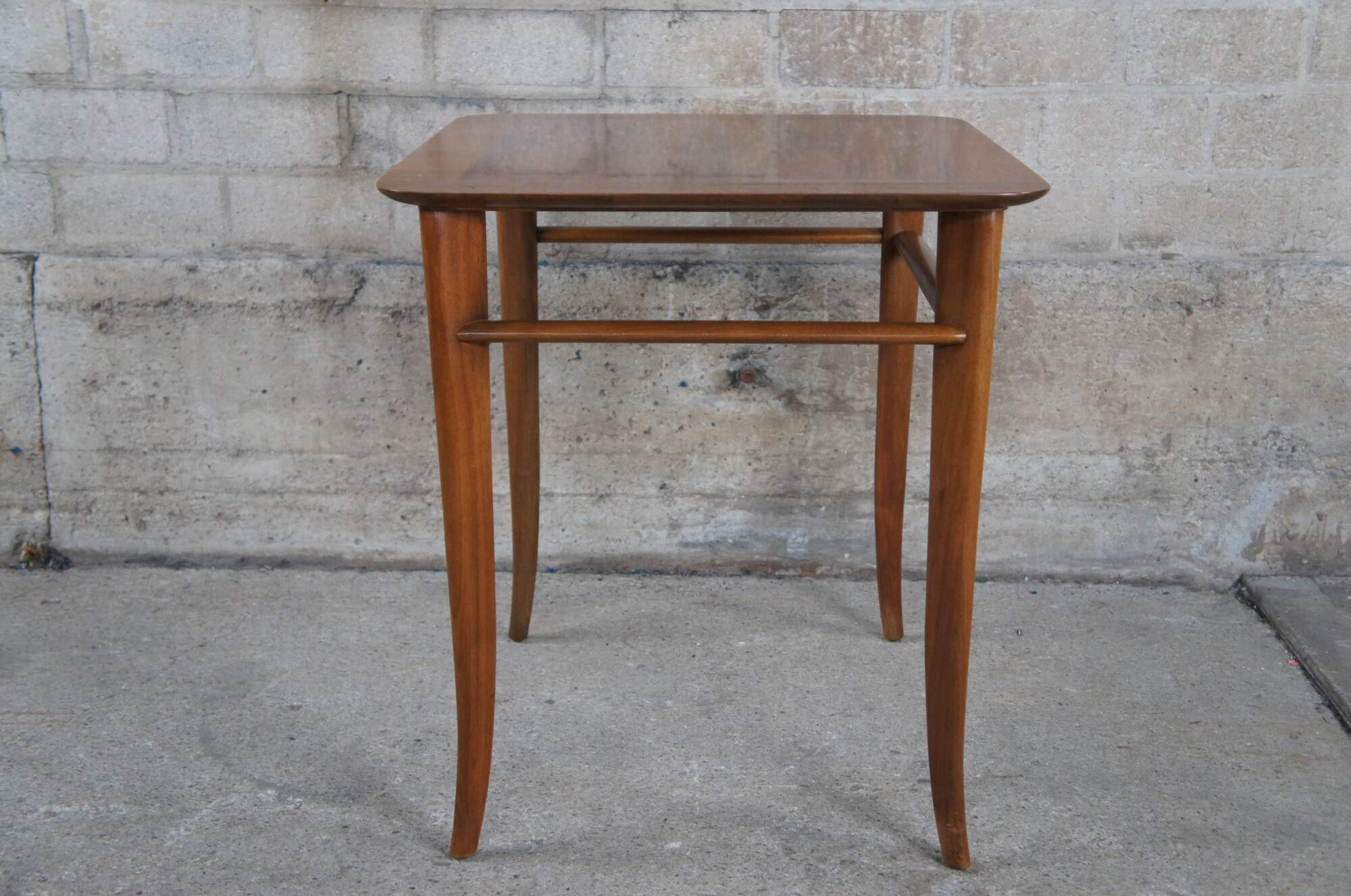 Mid century modern natural walnut side table by John Widdicomb of Grand Rapids. Made of Natural walnut featuring Danish styling with banded top, rectangular form, and tapered flared legs.