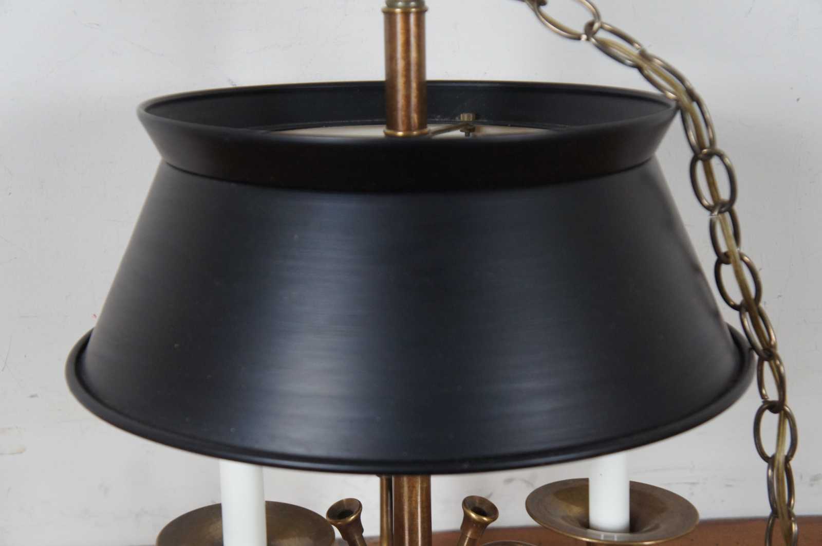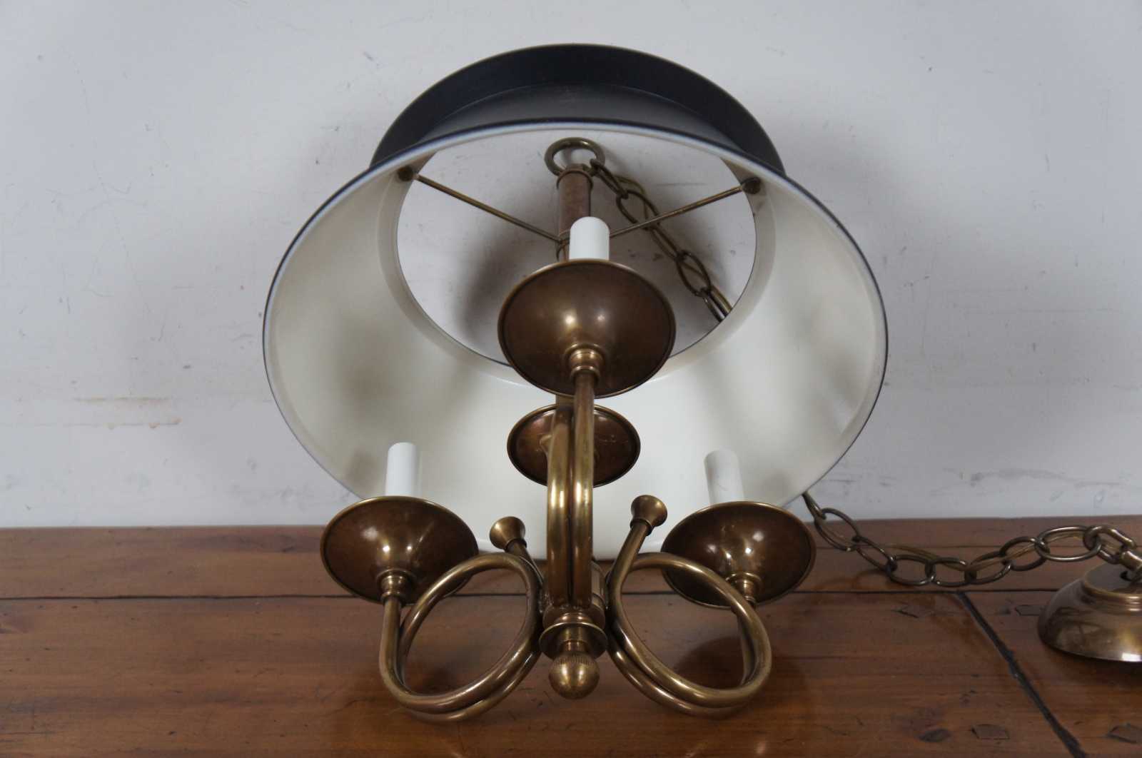 Vintage Frederick Cooper brass bouillotte chandelier with three French Horns supporting candletick shaped bulb sockets with a black metal shade.