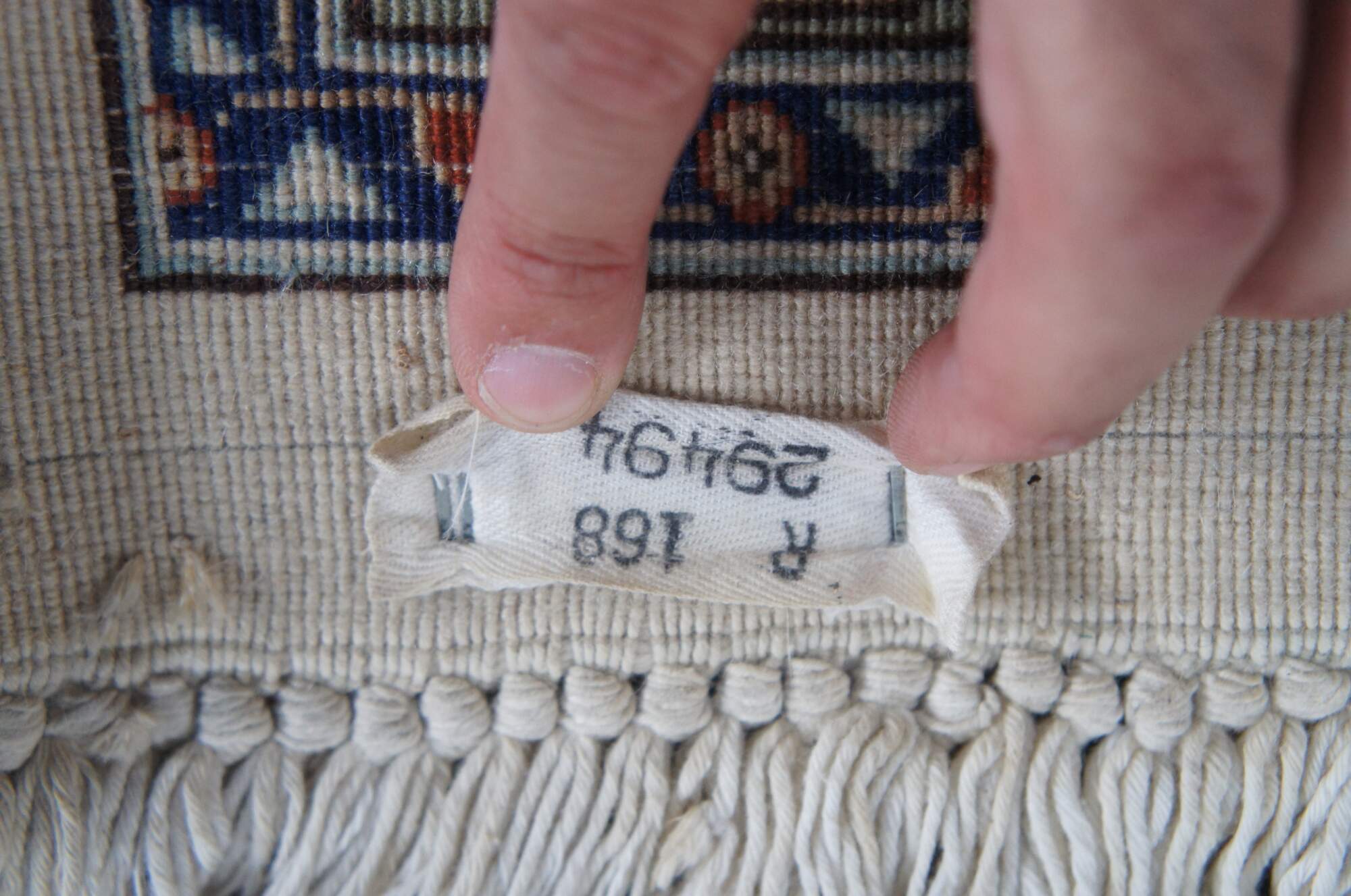A large and impressive 100% wool pile area rug featuring a floral scene with animals (Deer, Birds) on a beige field with pinks, greens, browns, reds, tans, blues and greens.