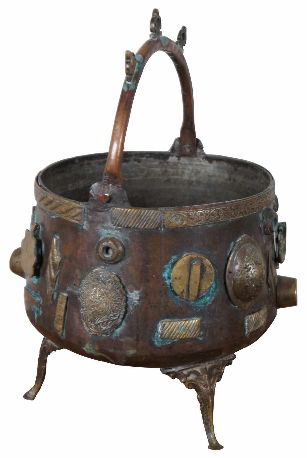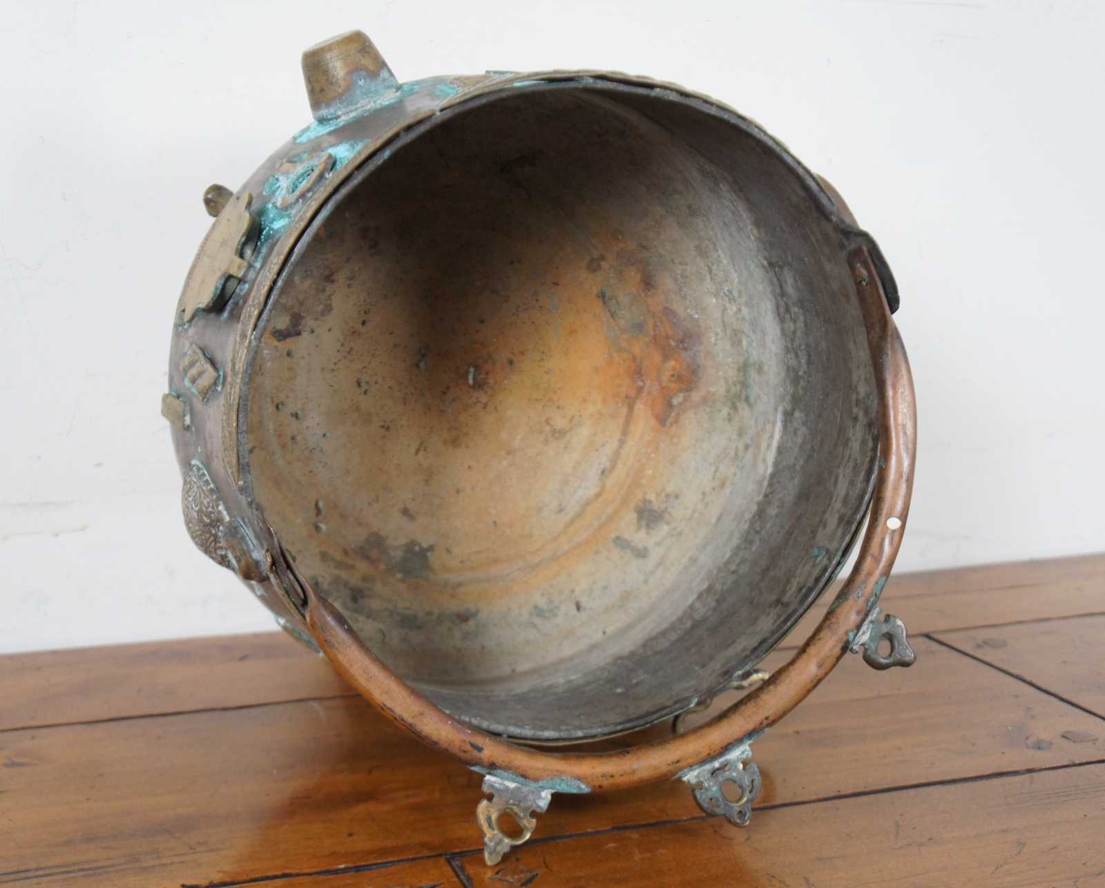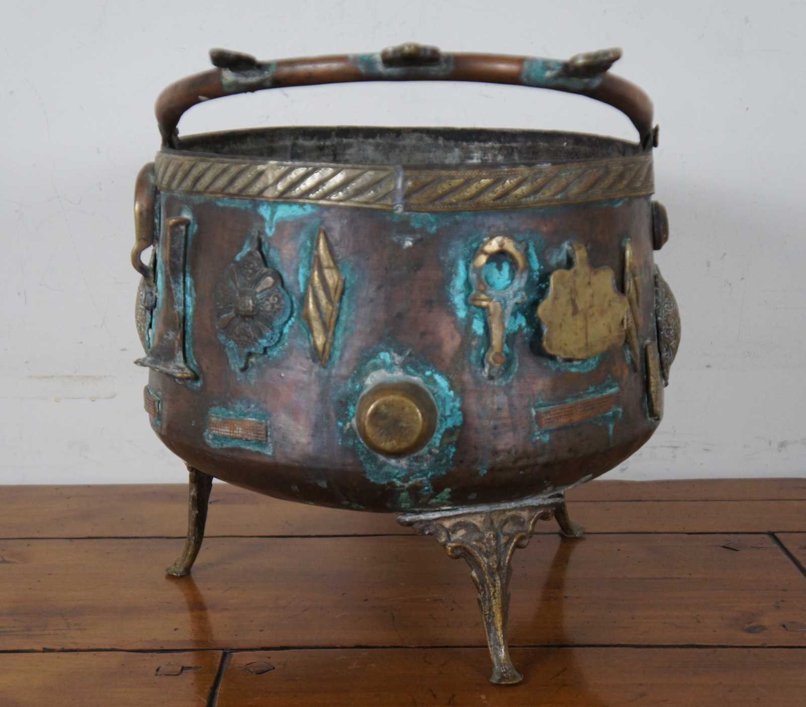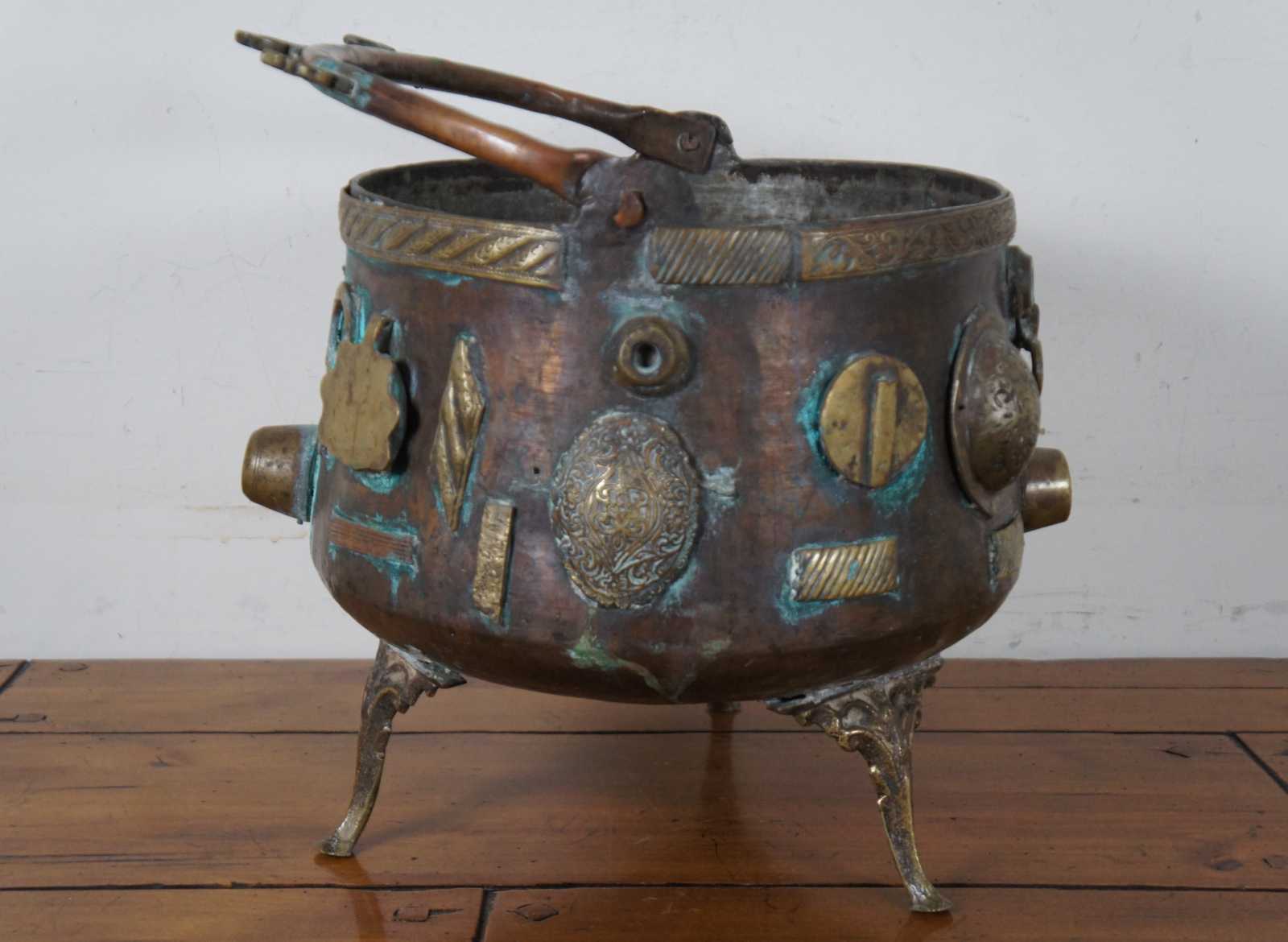 Antique bronze cauldron with tripod base and swivel handle, decorated with etched ornate medallions going along the body. Circa 19th century.