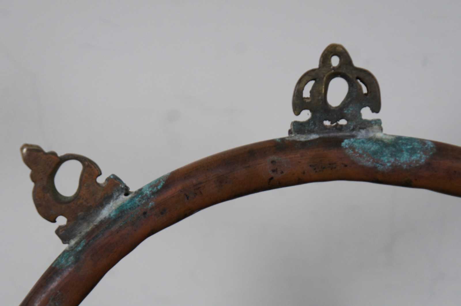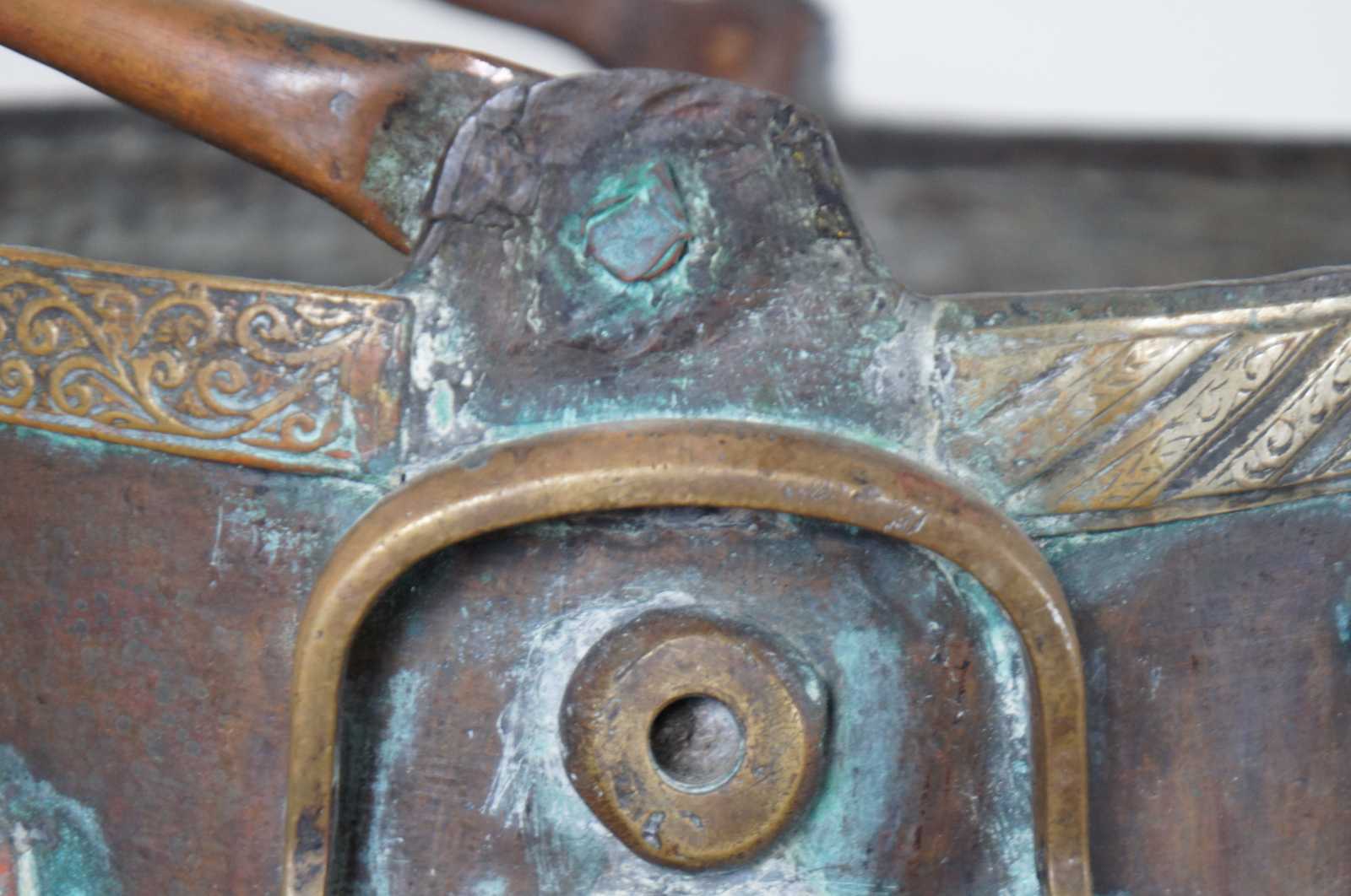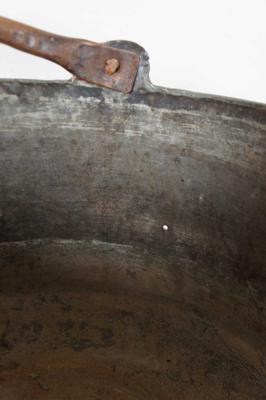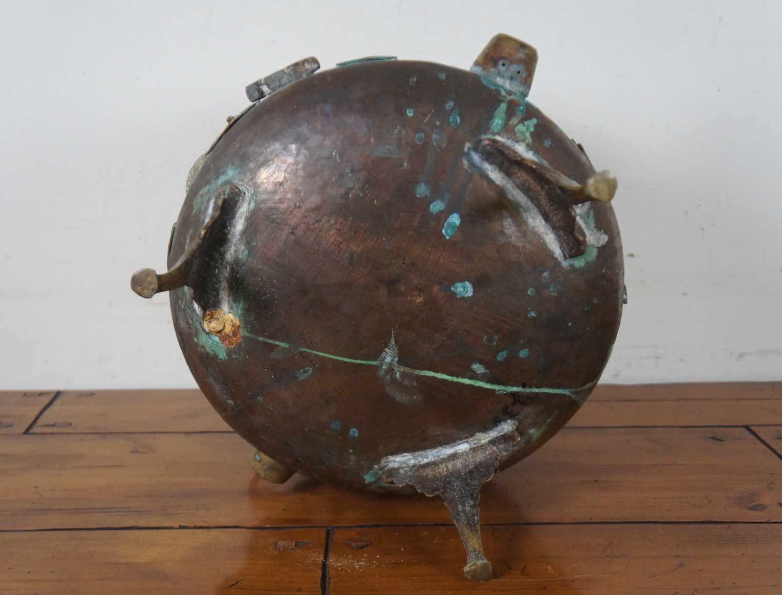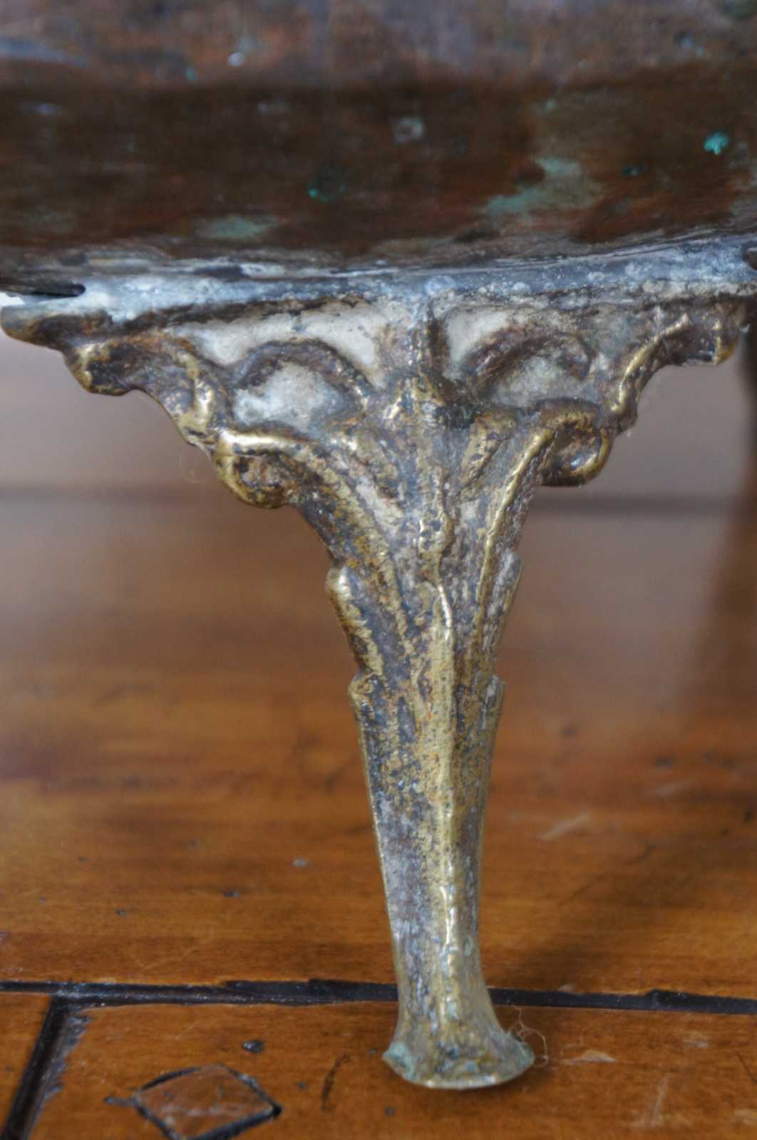 Antique bronze cauldron with tripod base and swivel handle, decorated with etched ornate medallions going along the body. Circa 19th century.