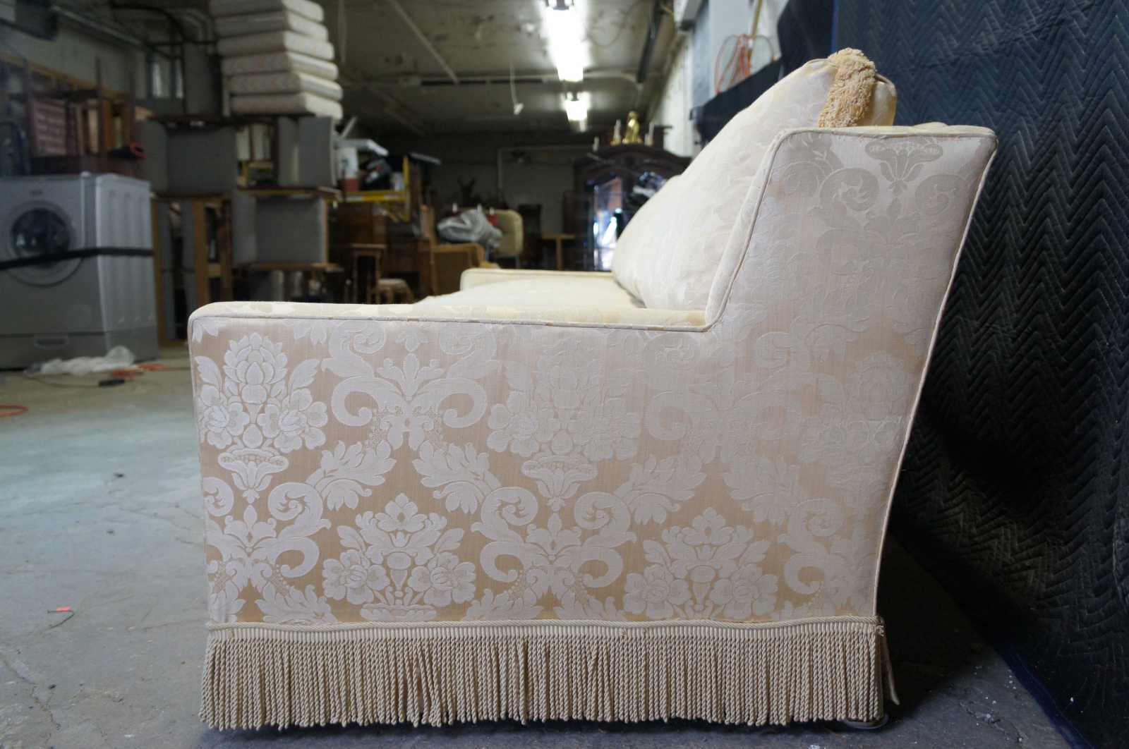Stunning Mid Century track arm sofa. A rectangular frame upholstered in an old world off-white silk brocade fabric. Features large downfilled cushions, a "V" back and lower tasseled apron. Supported by square tapered legs.