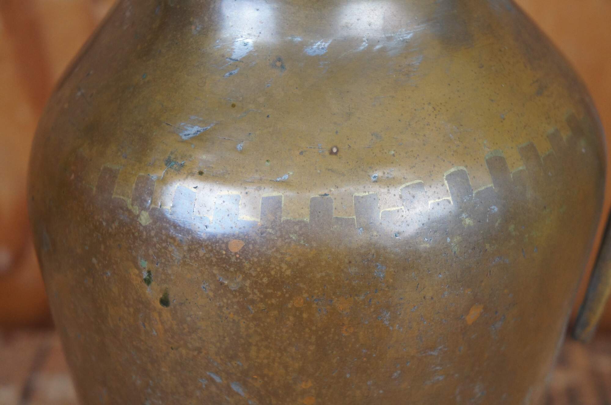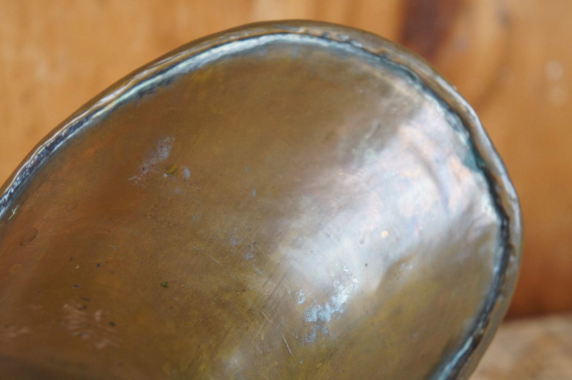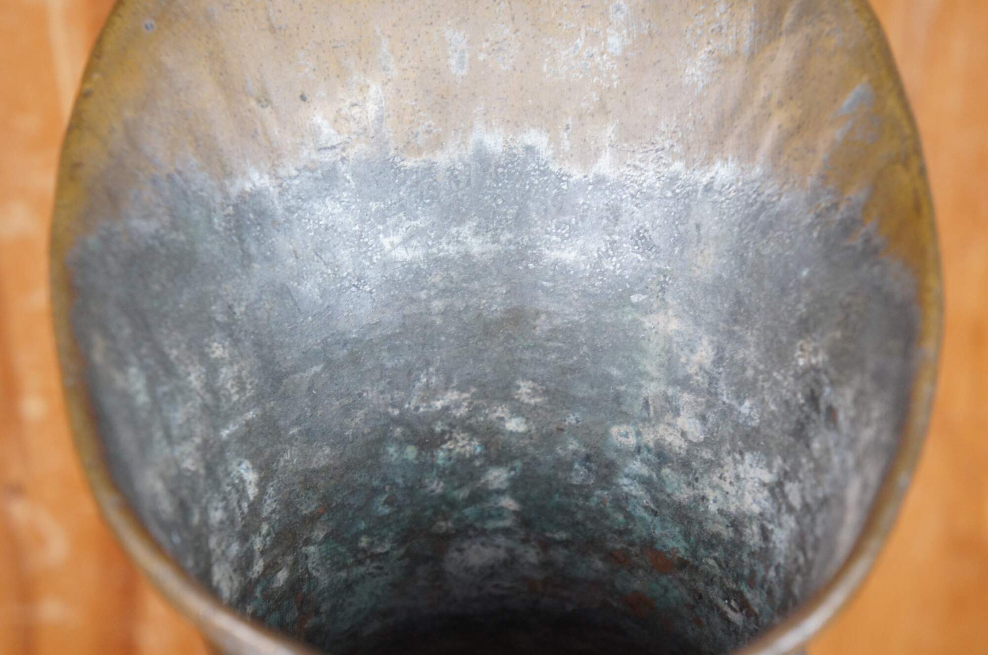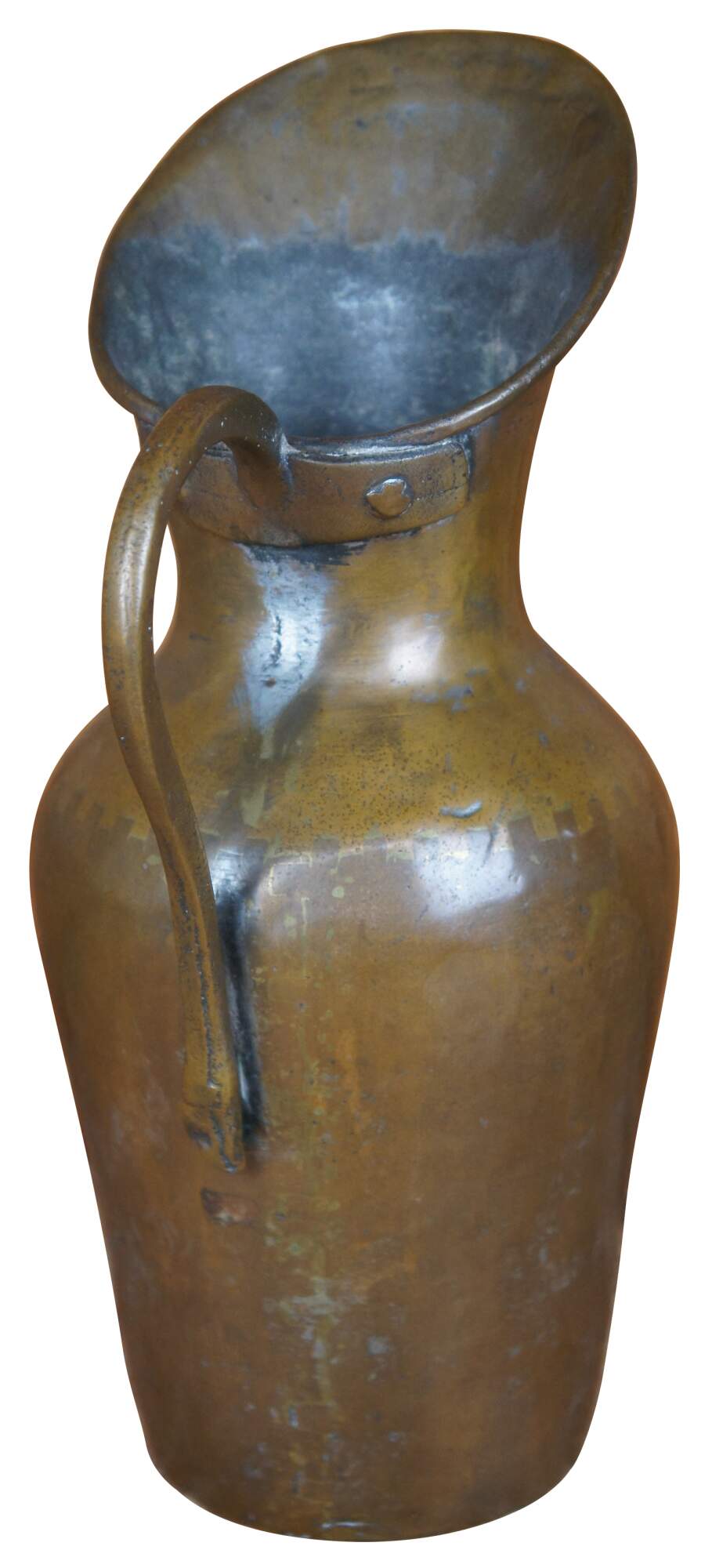 Antique hammered copper pitcher featuring a large handle and sloped spout with dovetailed joinery.