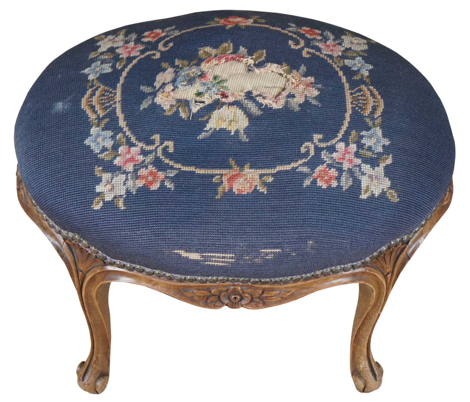 Antique French Provincial stool, foot rest or ottoman. Made of walnut featuring French styling with serpentine form with carved floral, fluted and scalloped accents, and needlepoint floral embroidered upholstery framed in nailhead trim.