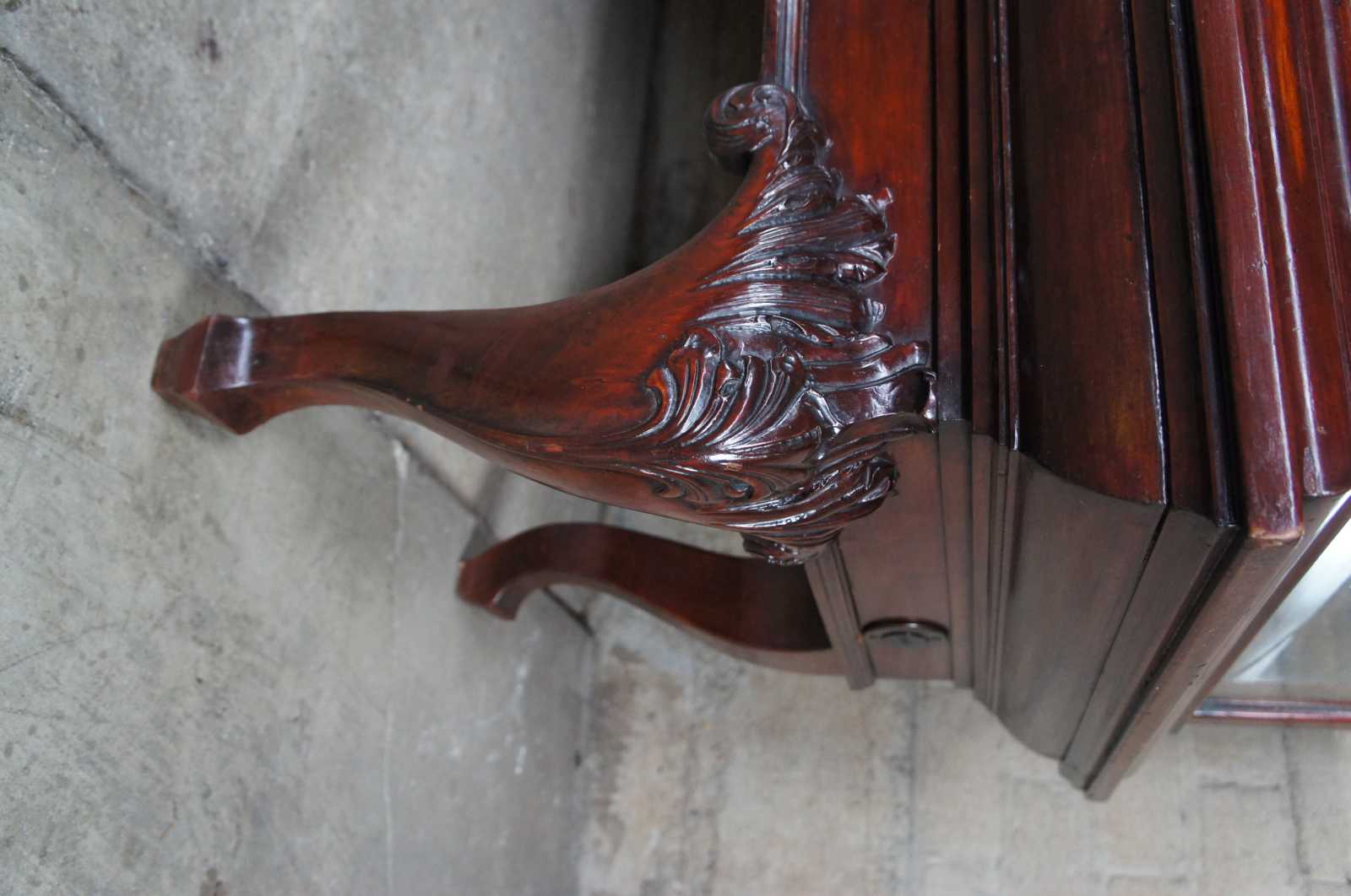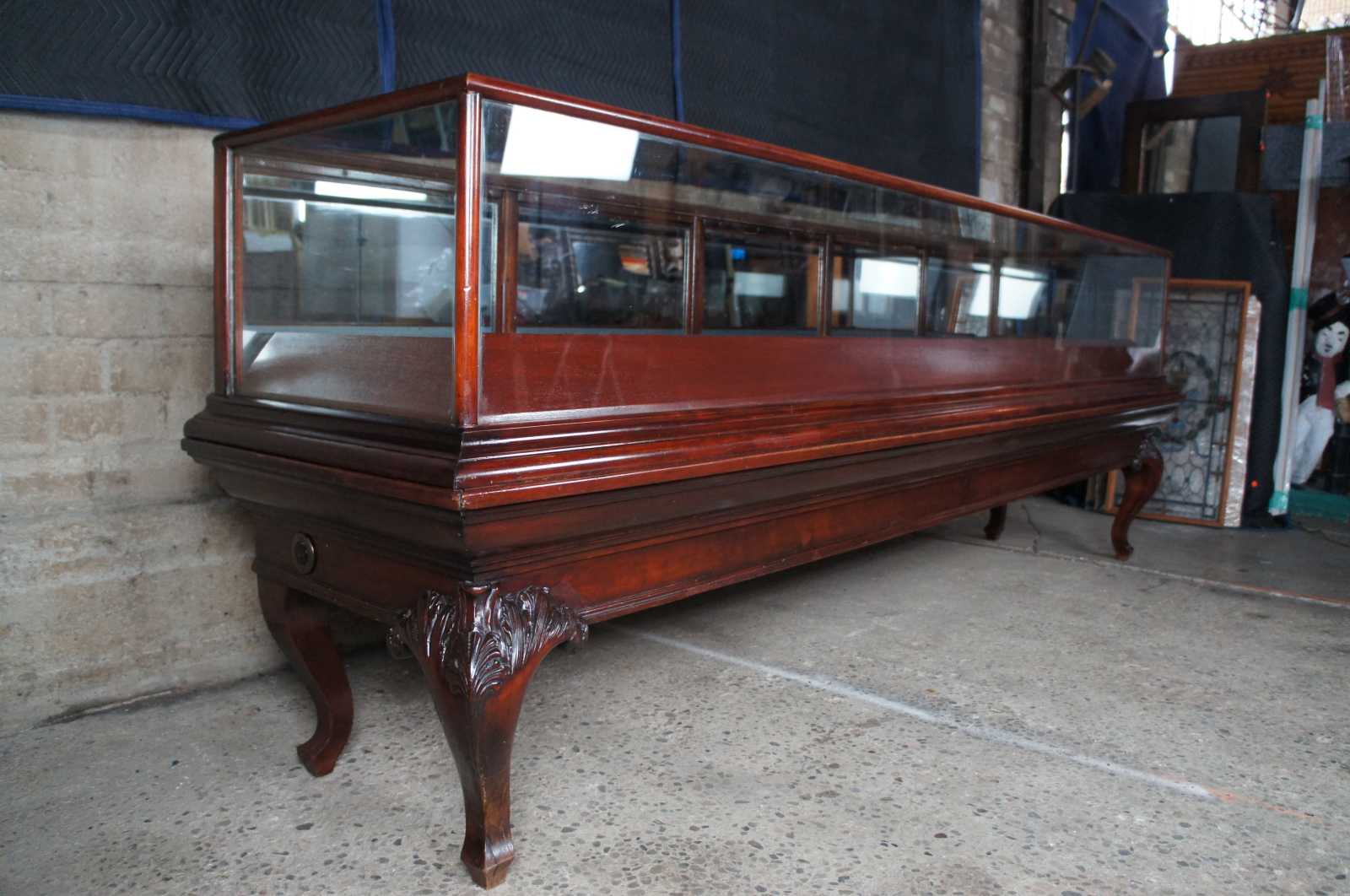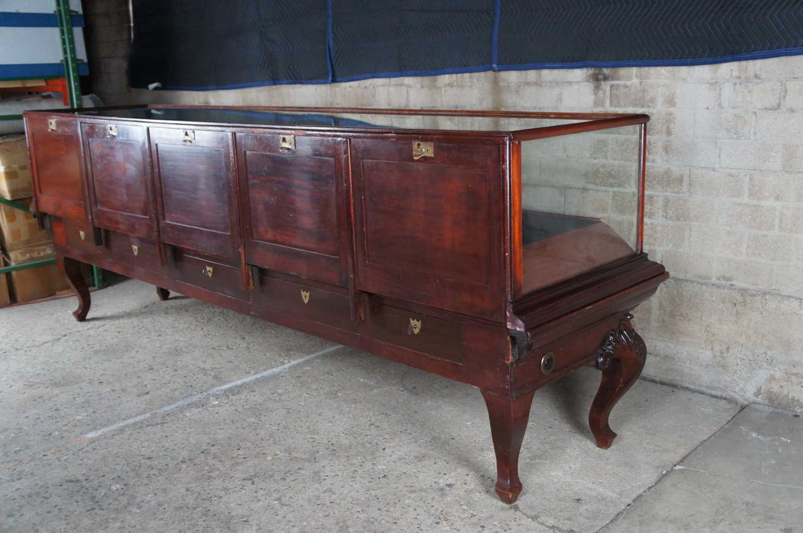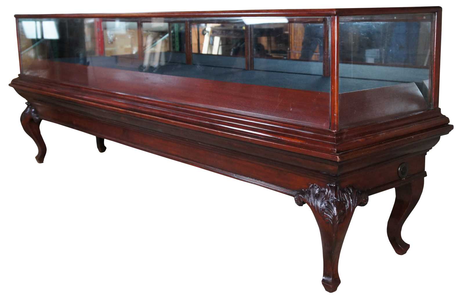 A rare and Impressive monumental American Victorian mercantile retail showcase or display cabinet by Schmitt & Co, circa 1890s. Made of mahogany featuring Baroque styling with a rectangular display case, large felt riser and mirrored backing. Includes large acanthus carved cabriole legs, two power outlets, lockable drop down doors and dovetailed drawers with brass shield escutcheons. Schmitt & Co of Cincinnati Ohio was established in 1851 and specialized in show cases, store, office and bank fixtures. Their facilities were on main street in place of what is now The Great American Ball Park, home of the Cincinnati Reds near the Ohio River.